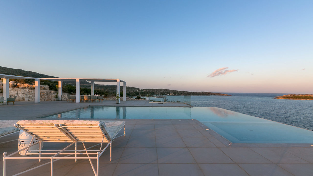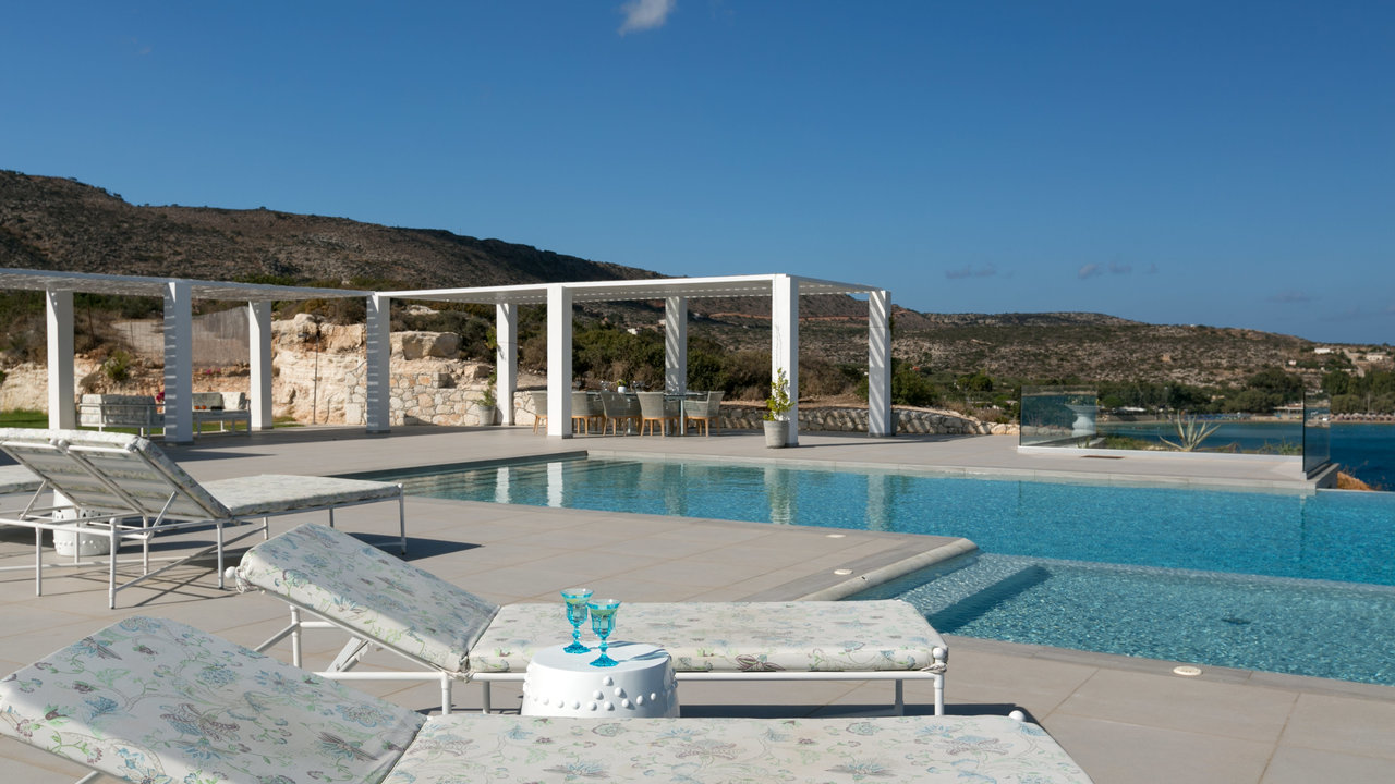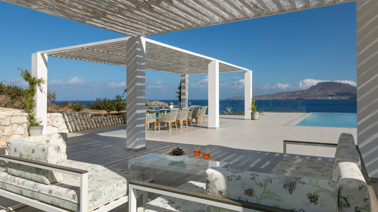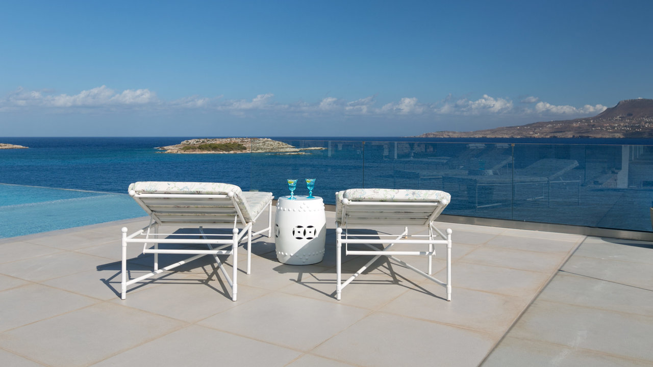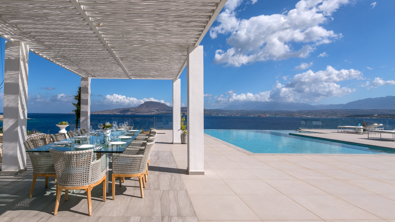 The outdoor area is featuring courtyard with a big dining area, a private swimming pool with jacuzzi and breathtaking sea views.