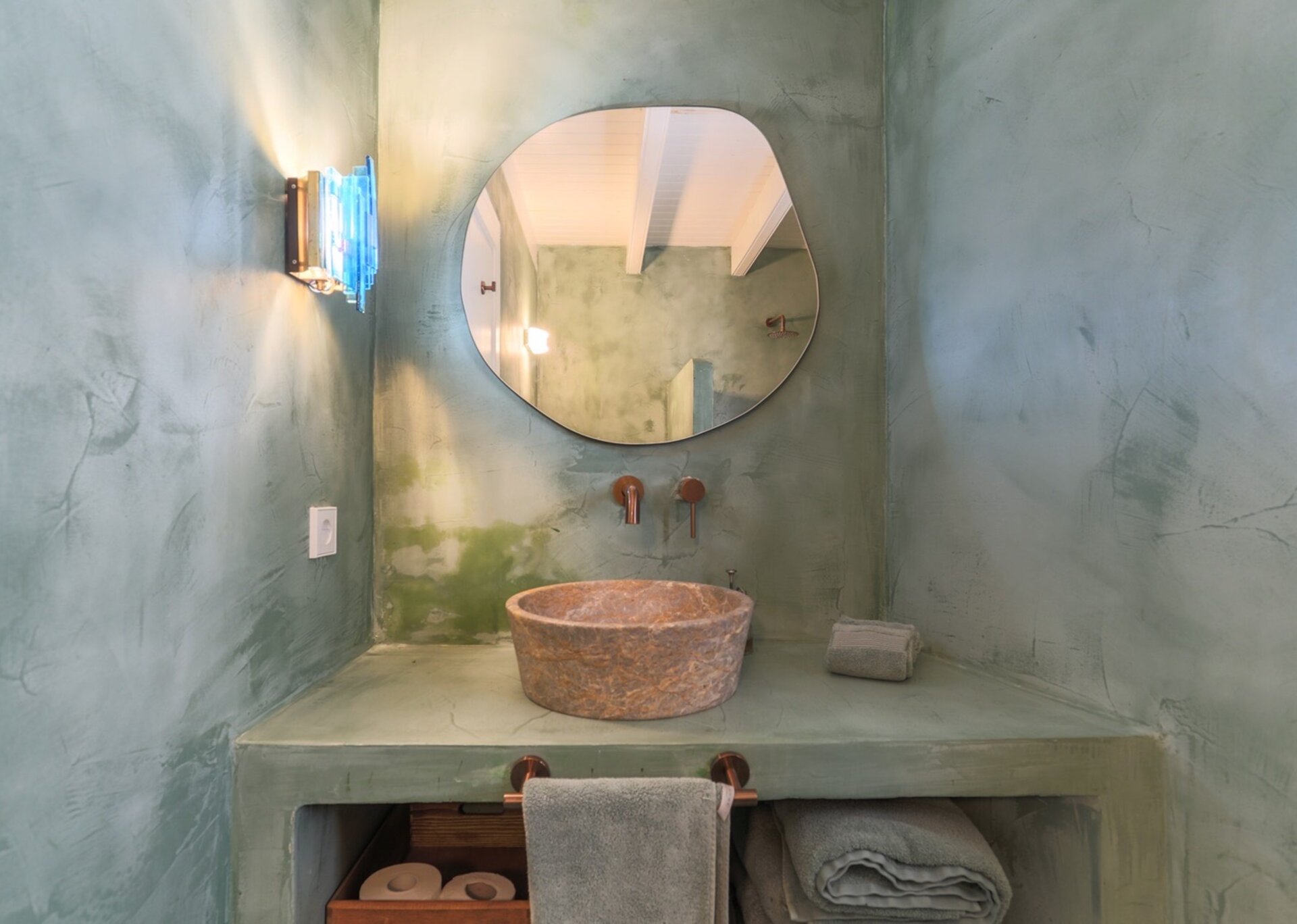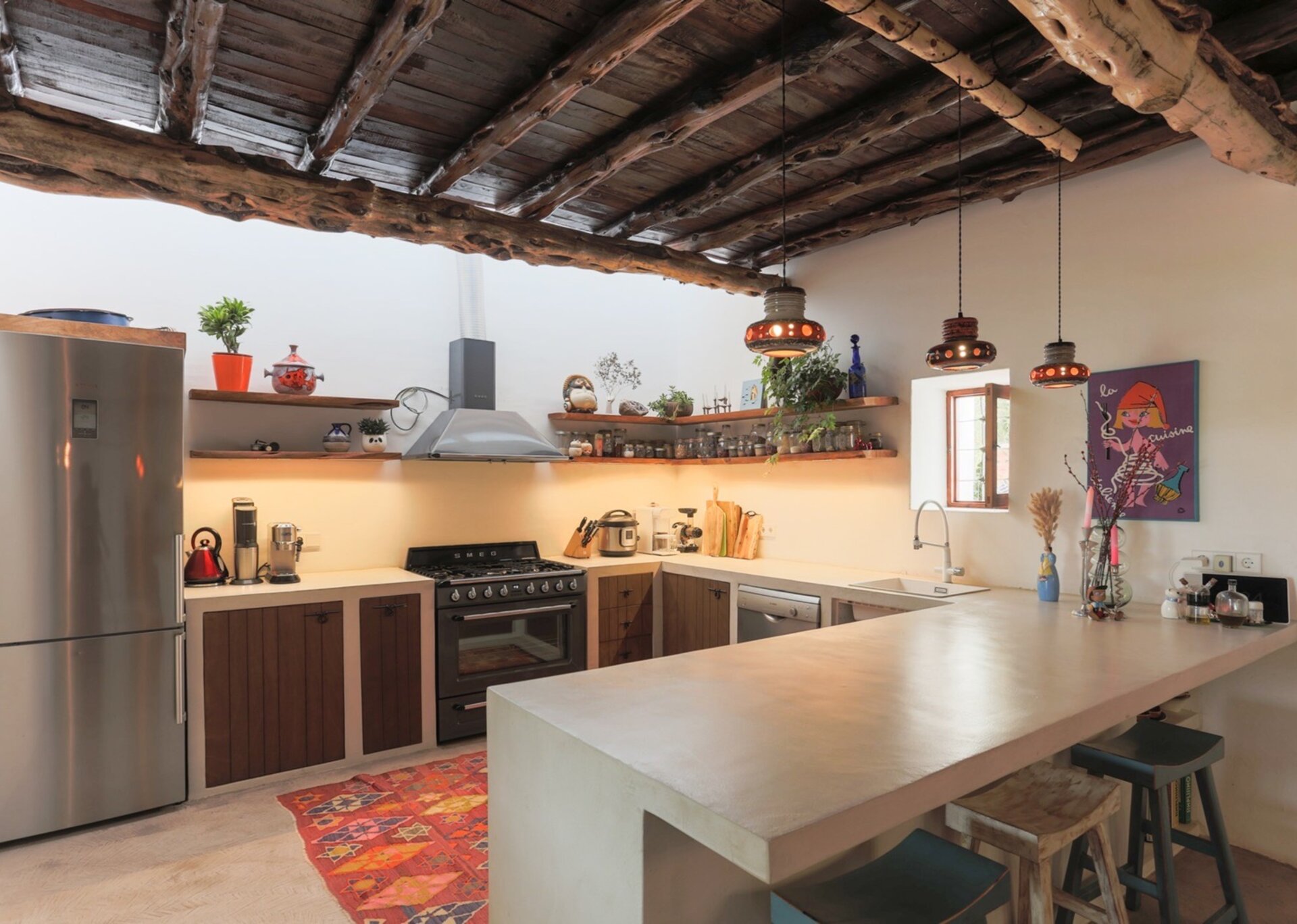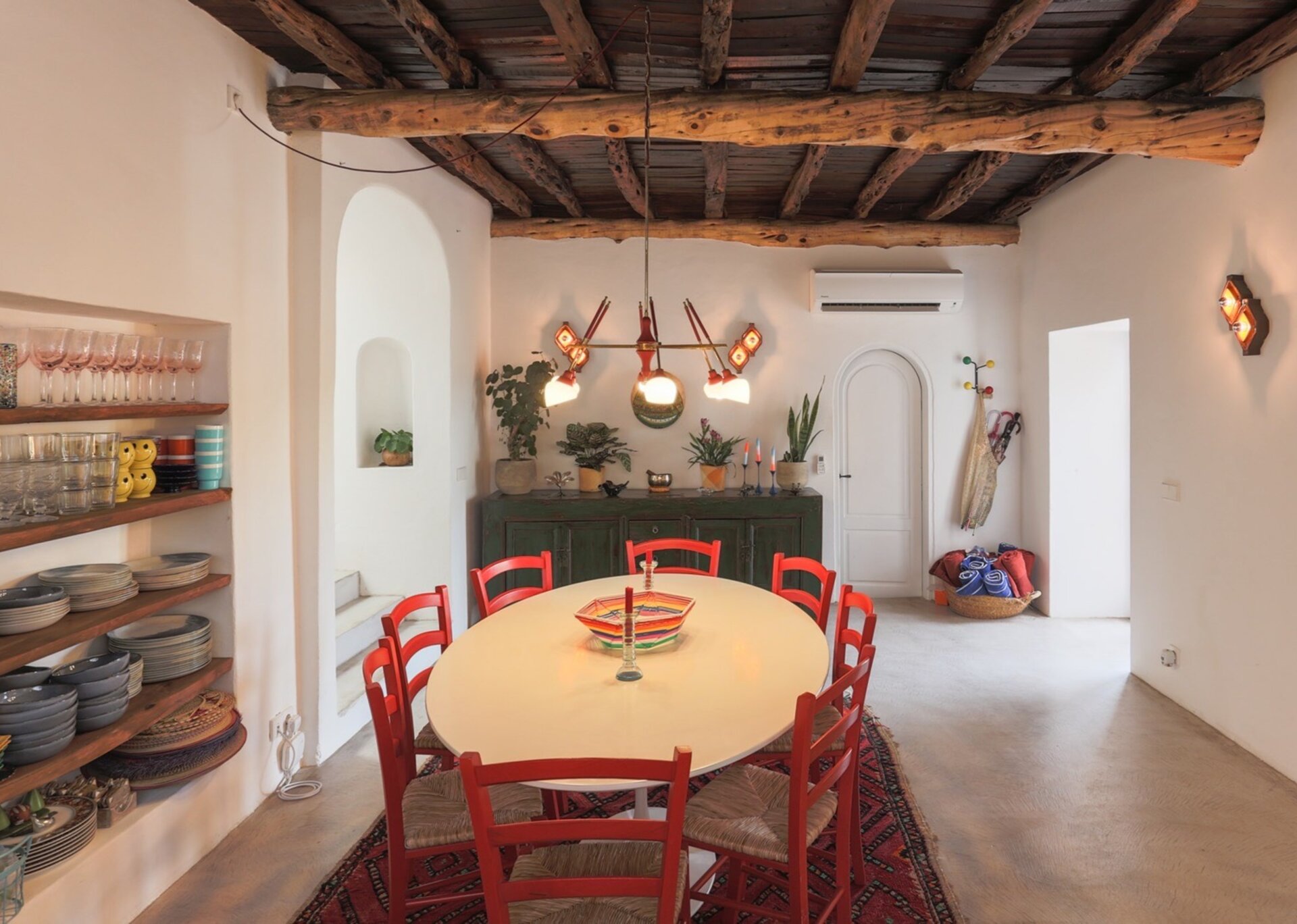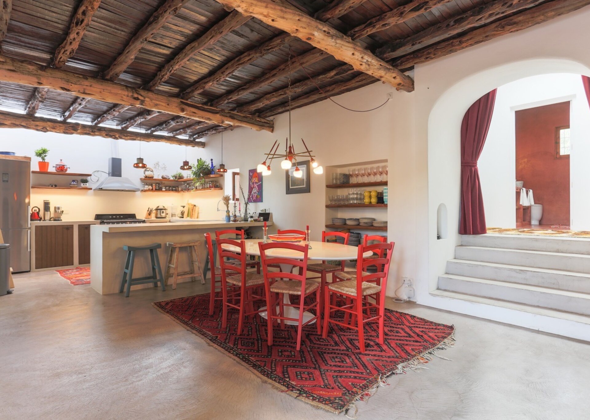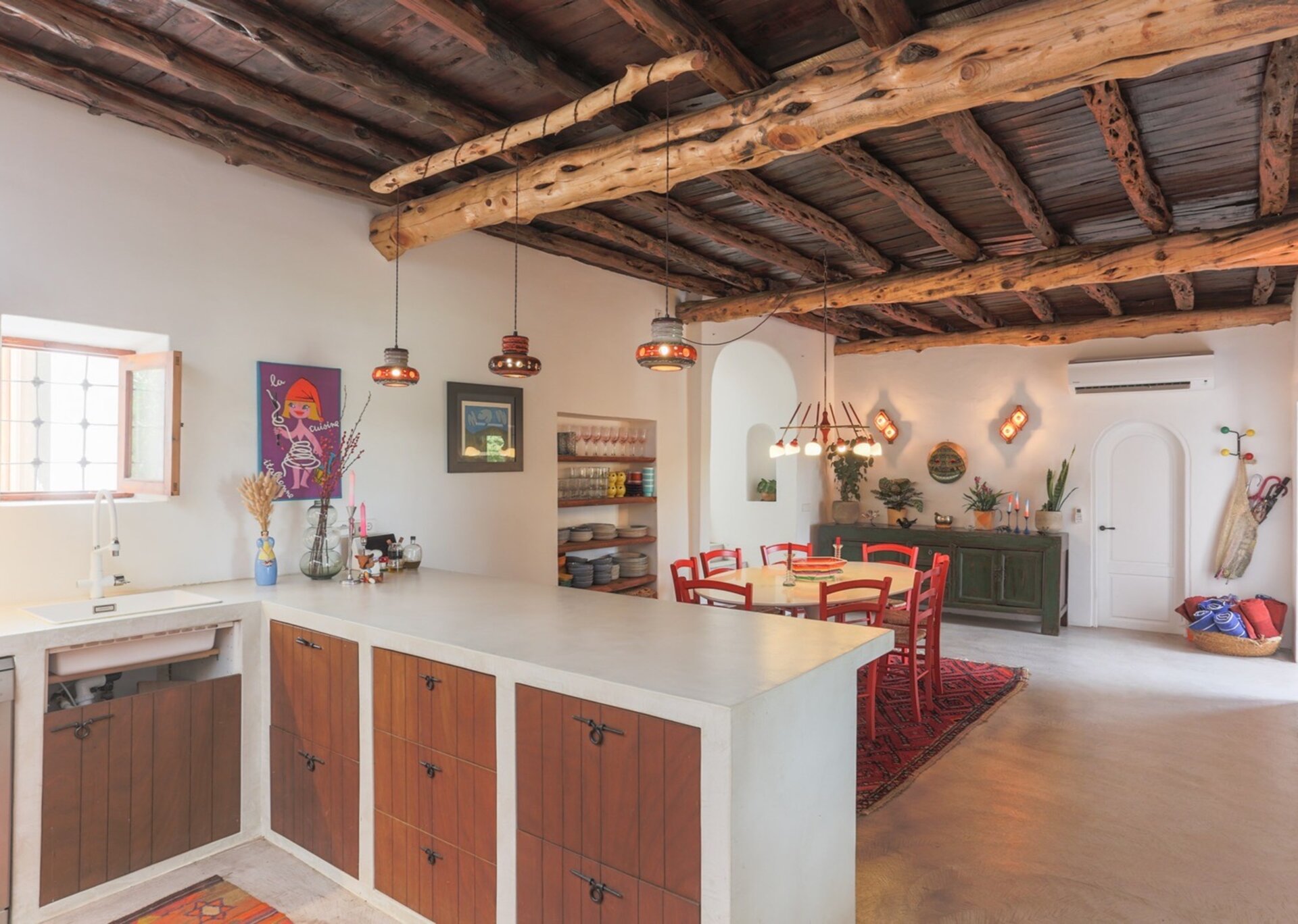 The interior's lateral layout bathes each room with abundant natural light, while well-considered partitions harmoniously segregate the living spaces. The bedrooms provide a private retreat, each adorned with refined fittings and polished concrete surfaces in earthy tones. The country-style kitchen is spacious and fully equipped, featuring a practical breakfast bar and a round dining table beneath the traditional Sabina wooden beamed ceiling.
