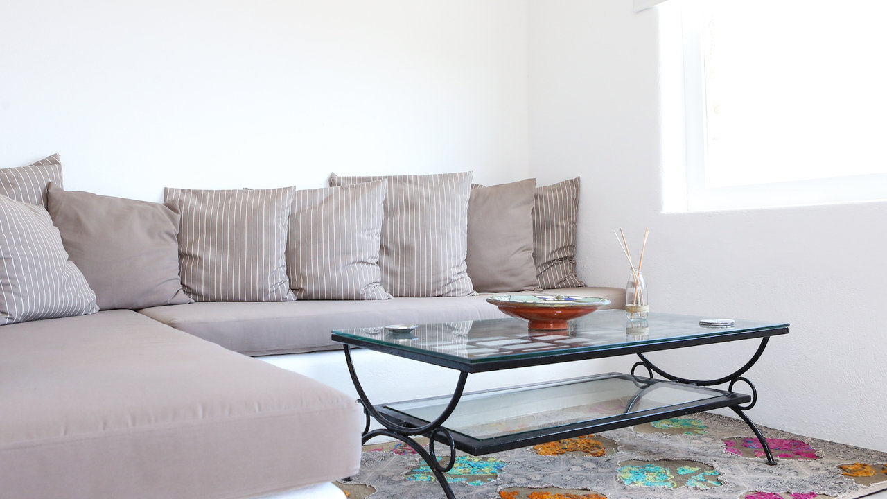 Inside, the villa boasts immaculate indoor areas with a refined ambience. Each room has been elegantly furnished and designed with a modern touch. The decoration throughout the villa is bright, crisp, and minimalistic, creating a sense of space and comfort. The living room offers a very comfortable and luxurious setting, while the inner dining area provides the perfect backdrop for a stunning romantic experience with your family or friends.
