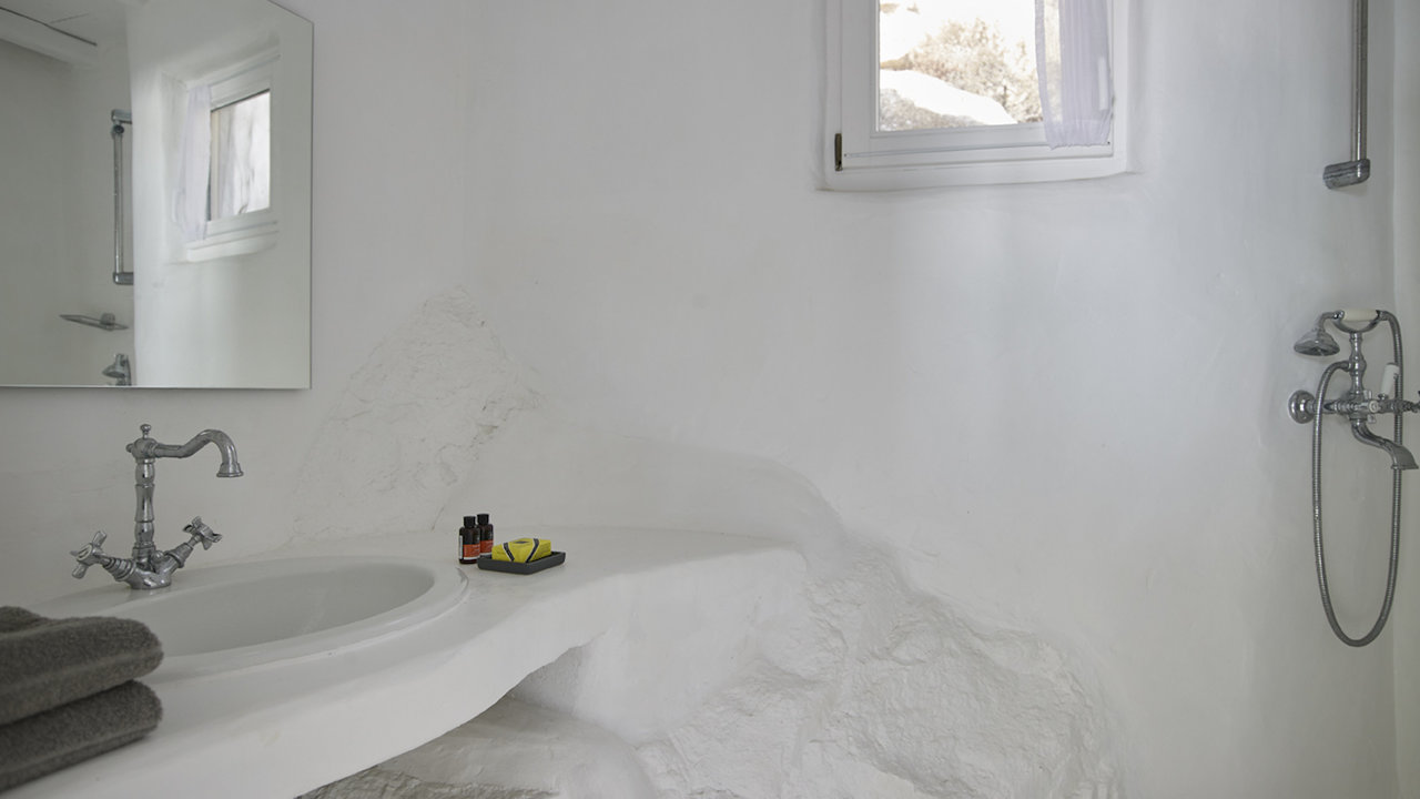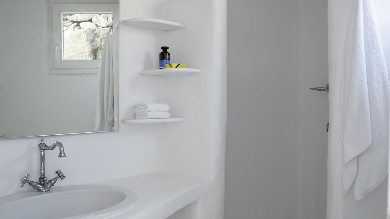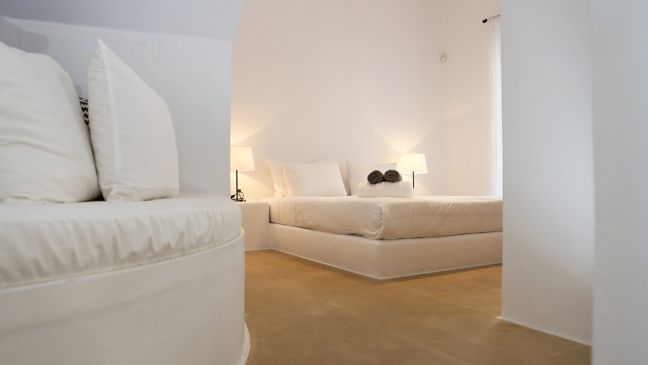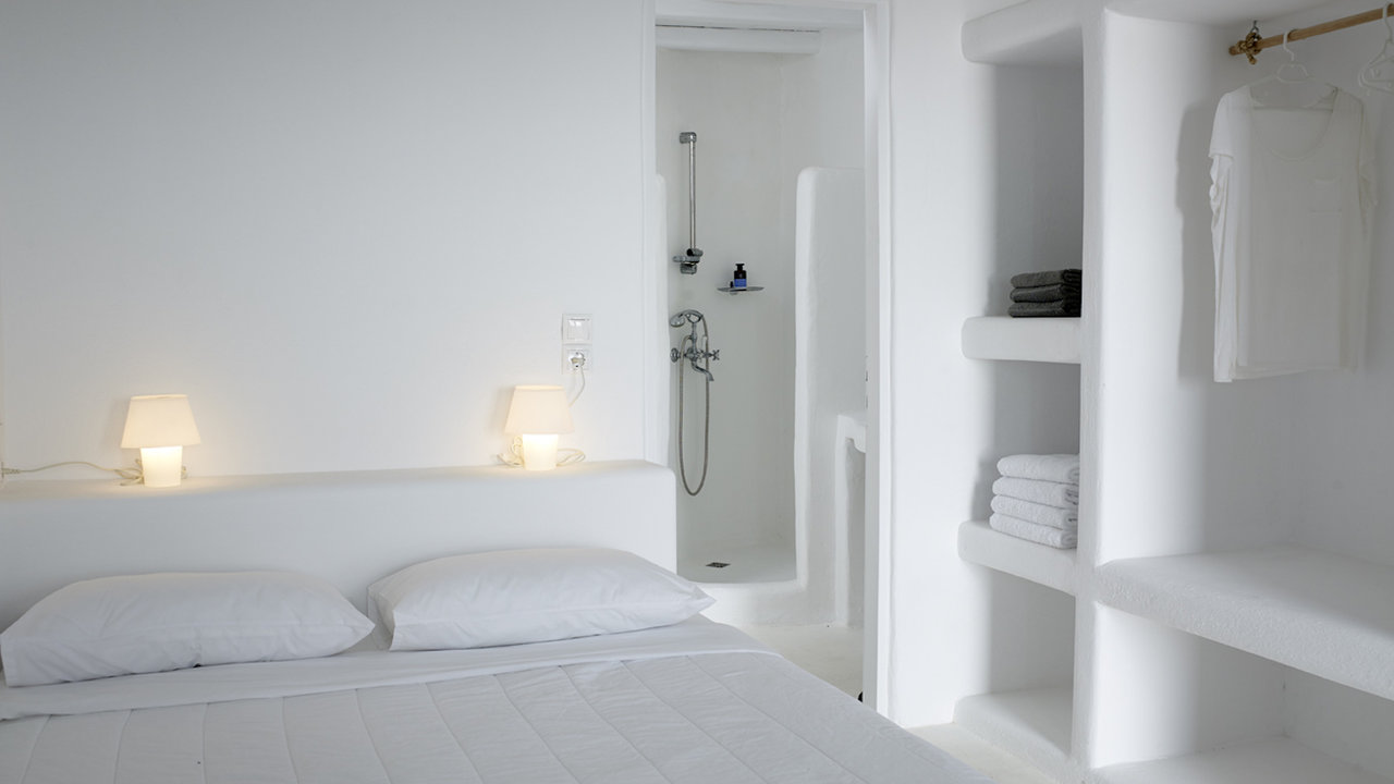 - 1 Bedroom with a double bed, A/C system, en-suite bathroom with shower. Guests have access to the side terrace through balcony door and they can relax to the outdoor sitting area which is covered by a pergola and enjoy the sea view.