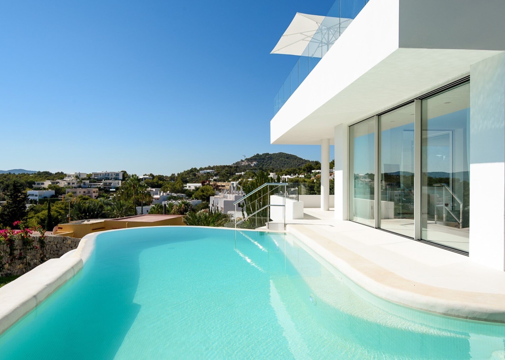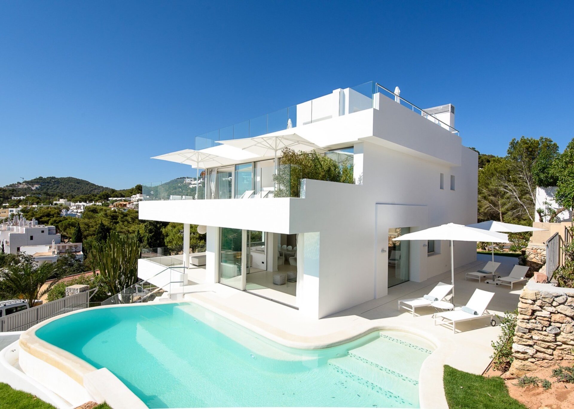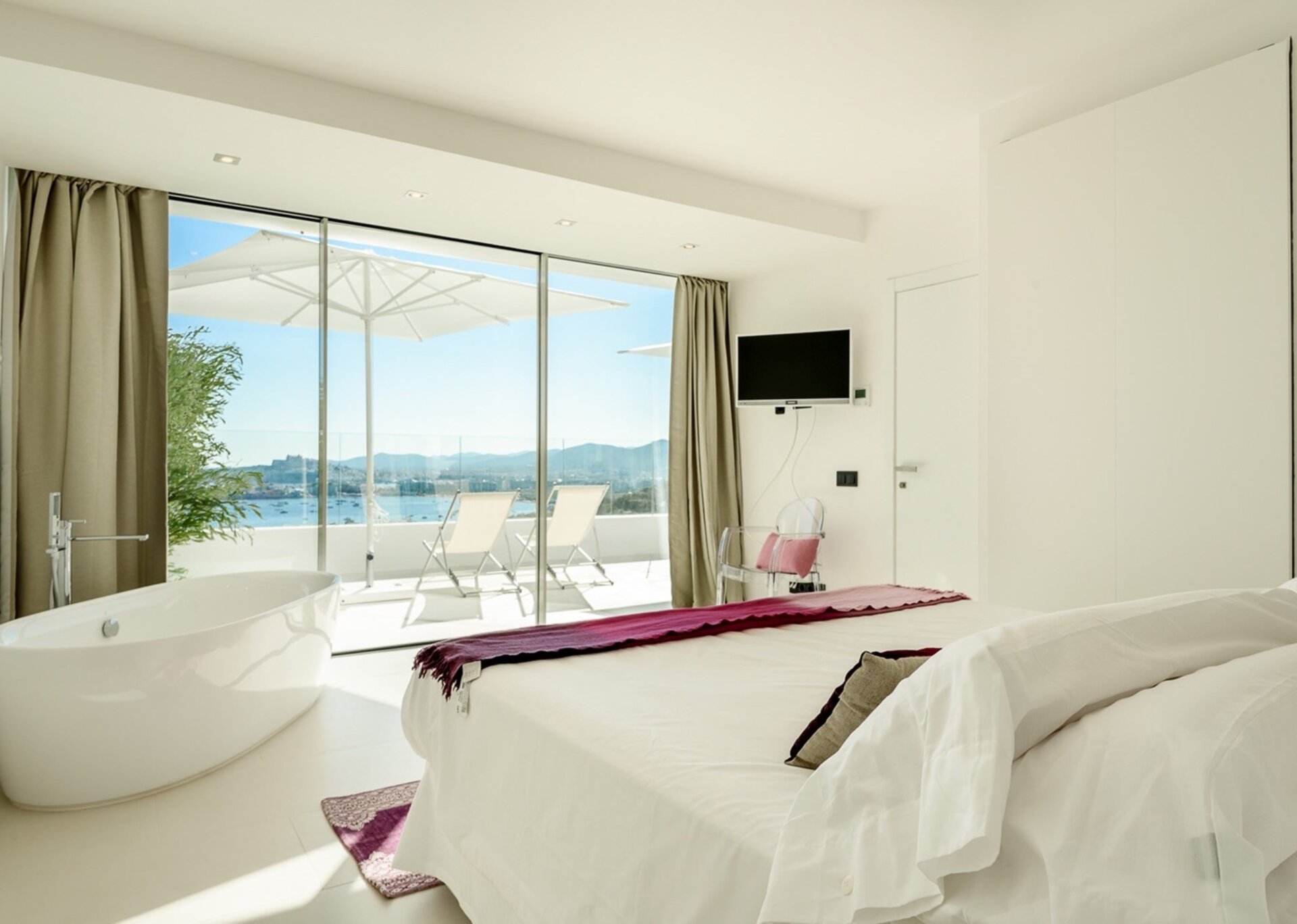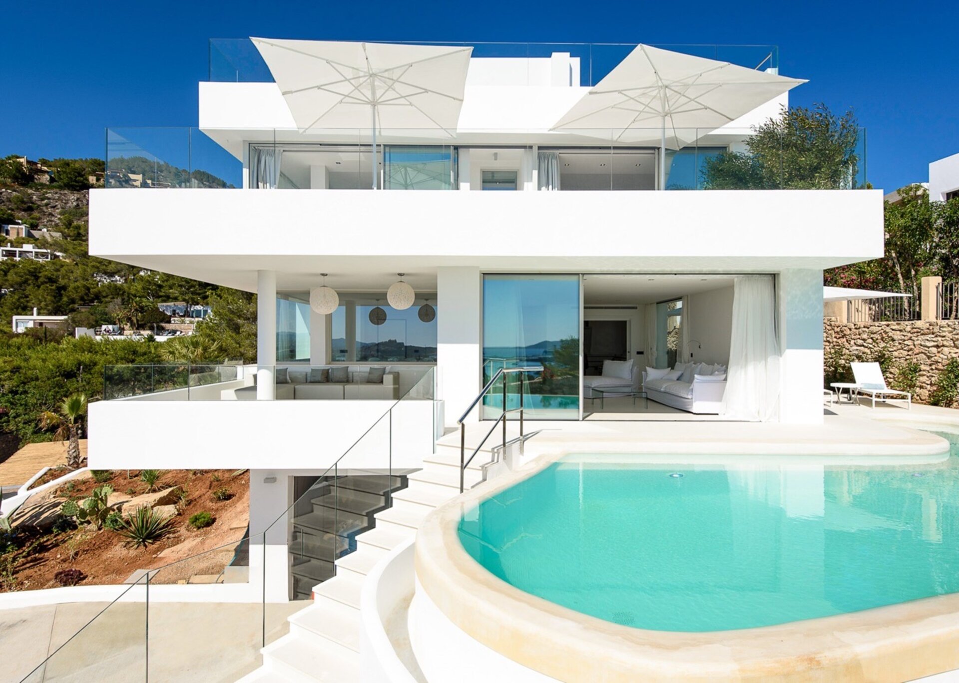 Villa Matilda rests atop the hill Can Pep Simo / Cap Martinet, just a short distance from Ibiza's vibrant Marina Botafoch and the renowned nightclubs Lio, Pacha, and Heart. This exquisite property seamlessly melds classic, minimalistic design with top-tier amenities, offering an unparalleled view of Ibiza's enchanting sunlight, the sea, the stunning bay of Talamanca, and breathtaking sunsets that grace each day at Villa Matilda. Ride the elevator to your private 360° rooftop terrace and witness the sun's gentle descent into dusk—an exquisite experience that epitomizes the allure of Ibiza. And with your own Sky Bar, sundowners come effortlessly. Villa Matilda, situated in a prime location, has already played host to esteemed international celebrities who have found complete fulfillment in every aspect. Stepping foot into the elegant, three-story, white villa, attention is instantly drawn to the masterfully framed bay view, which stretches all the way to Ibiza's historic Dalt Vila.