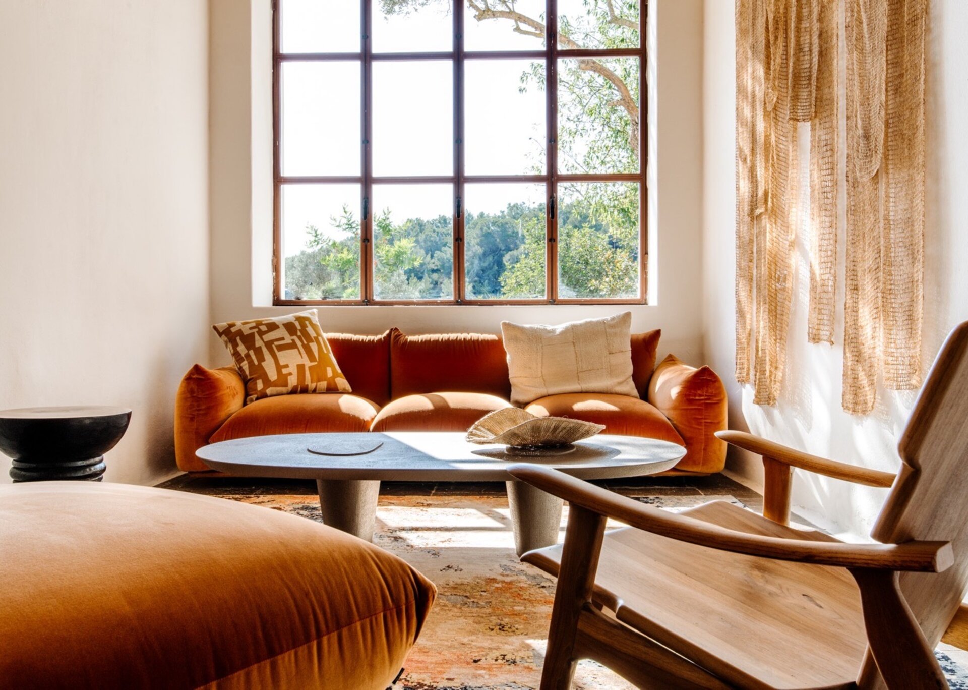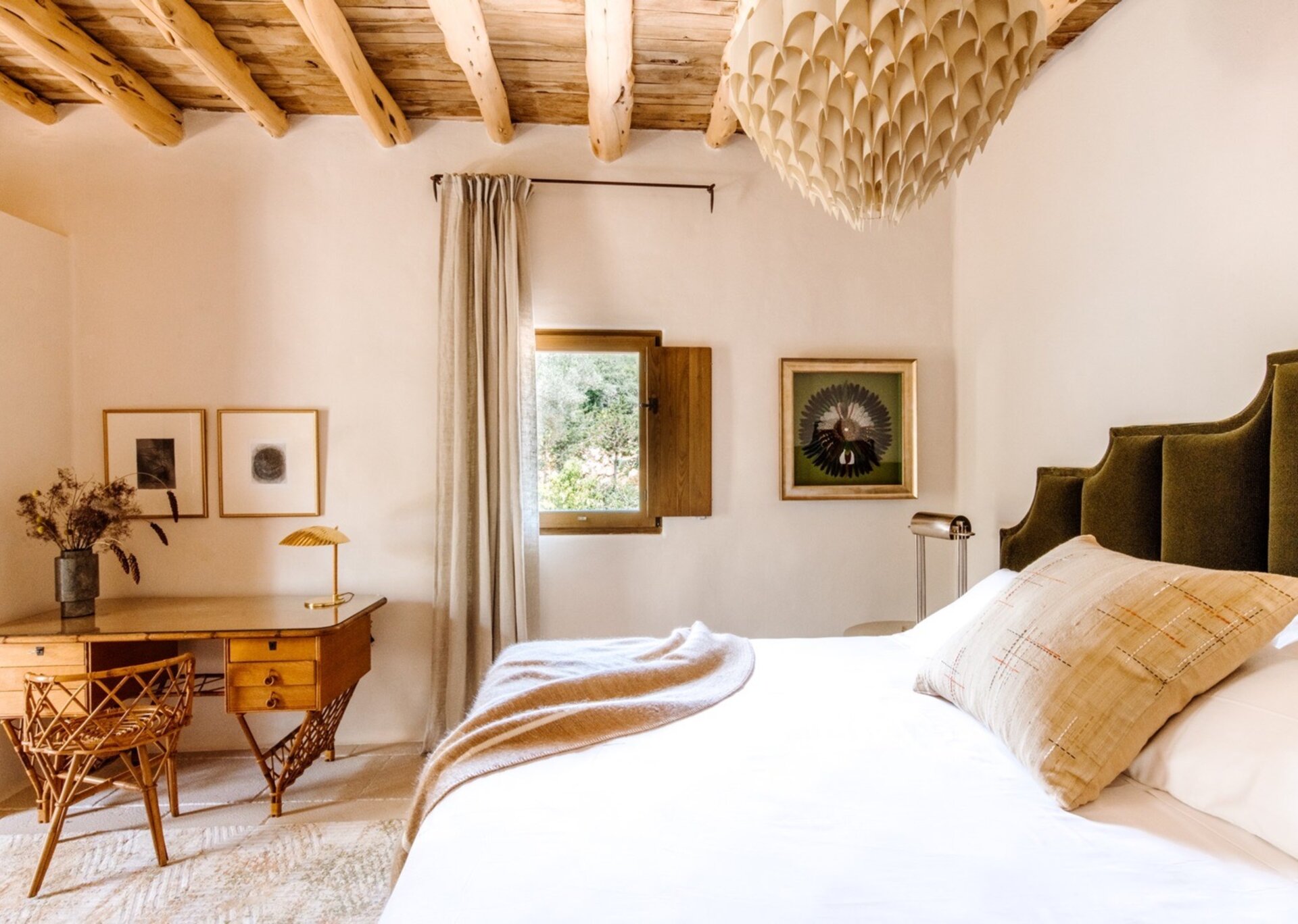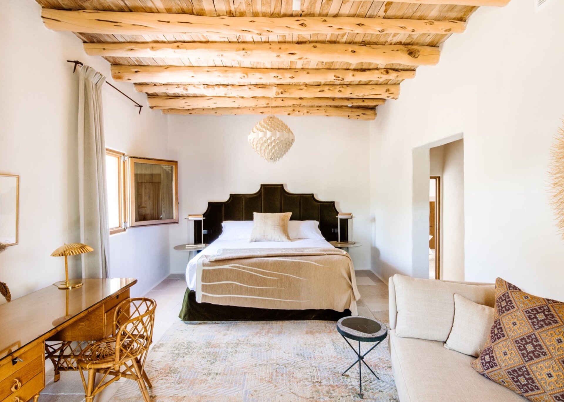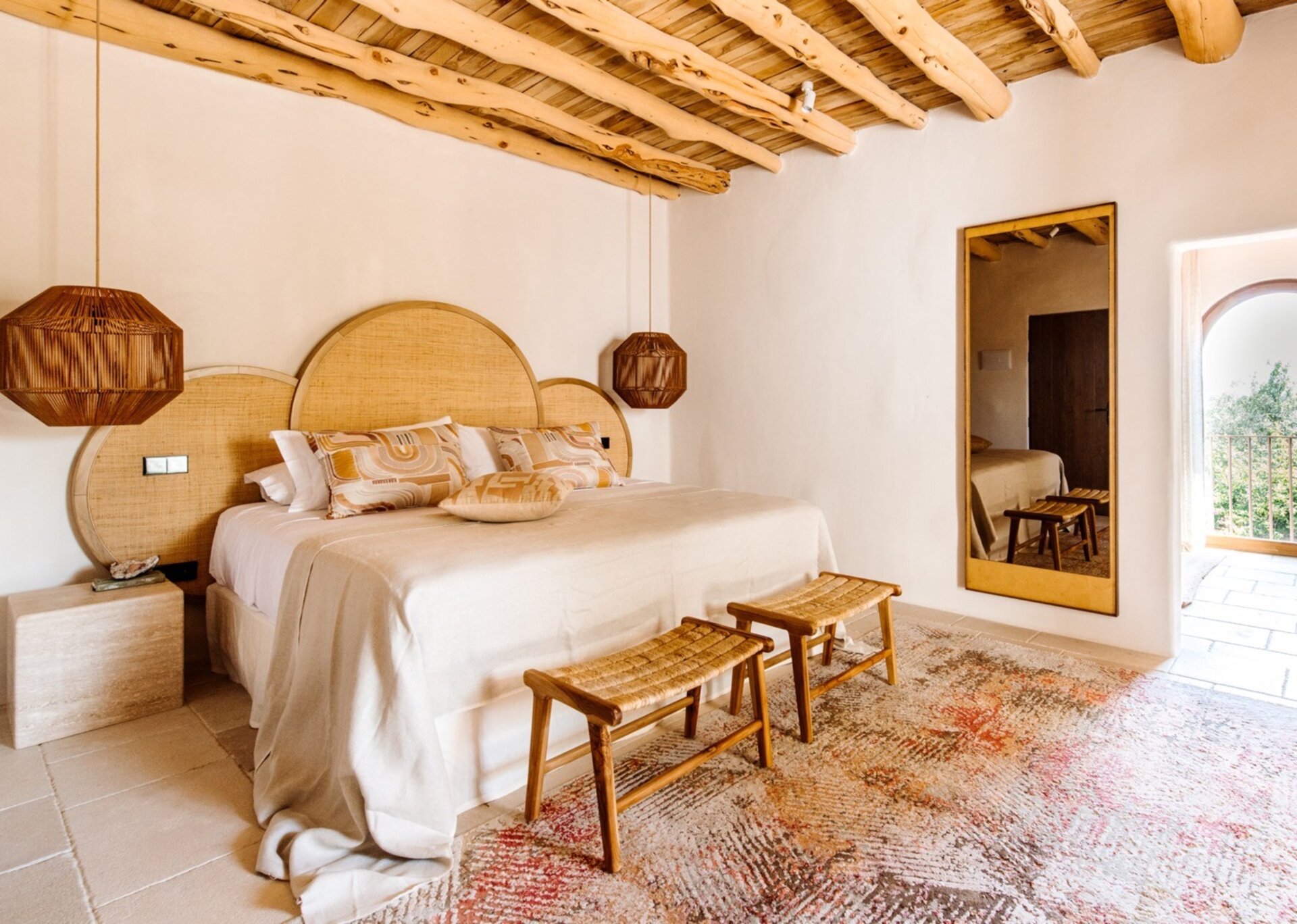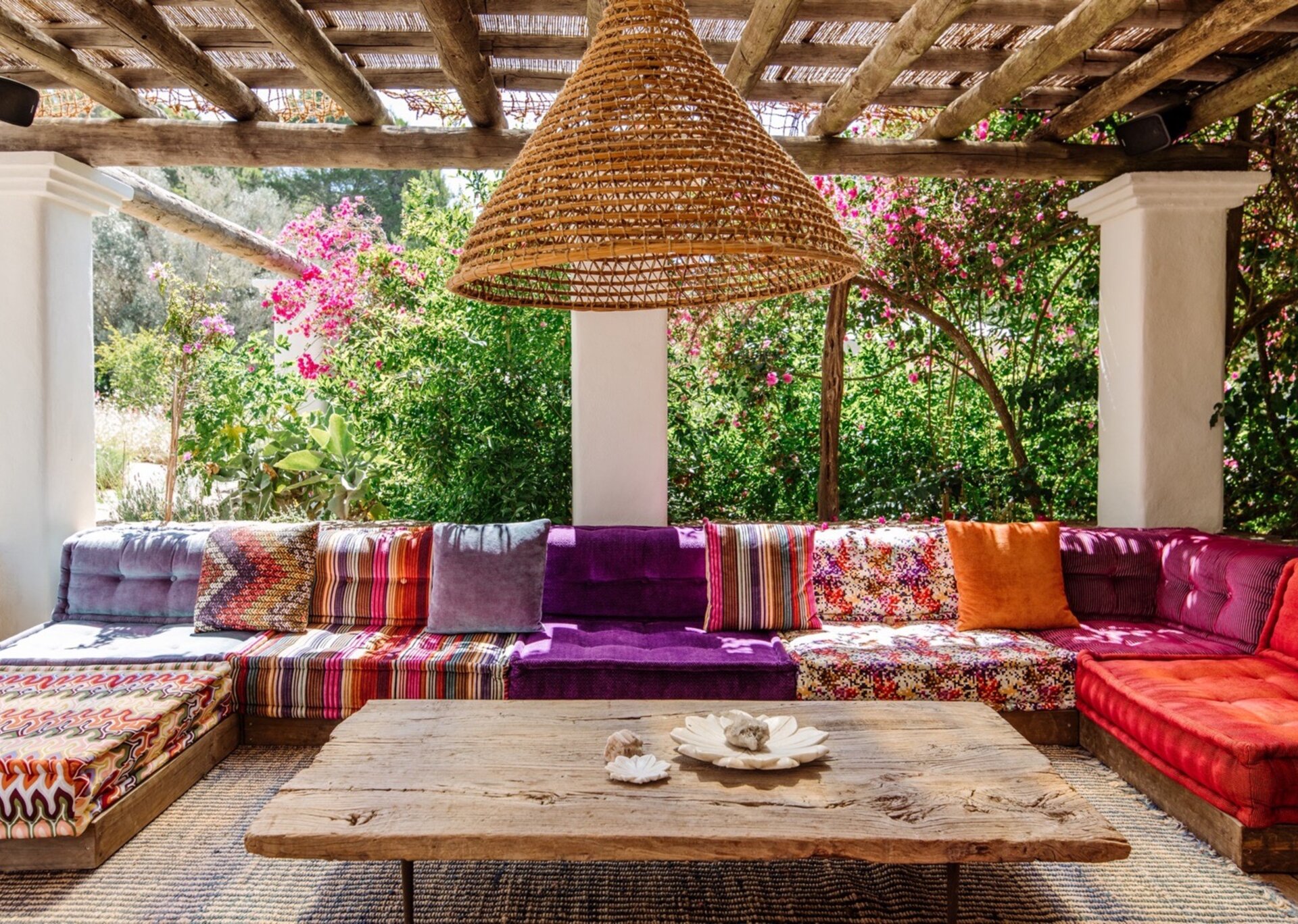 Unpretentious yet superbly eclectic in design, Villa Maze captivates with its vibrant and unapologetic charm. Brightly colored chill outs furnished by Roche Bobois, Pierre Paulin Pacha chairs, and Paavo Tynell lighting seamlessly complement the sumptuous Minotti sofas. It artfully weaves together the iconic styles of legendary seventies Italian designers, such as Arflex, paying homage to the island's psychedelic era. The estate's walls serve as a canvas for internationally renowned artists, featuring captivating works by talents like Rafi Kalenderian and Antonio Peticov. Local artist Adriana Meunie's textile wall hangings and Laura de Grinyo's exquisite ceramics add a touch of regional artistry. Step through the entrance and be greeted by a handmade chandelier crafted from sansevieria, illuminating a space that speaks volumes about Villa Maze's distinctive character and atmosphere.