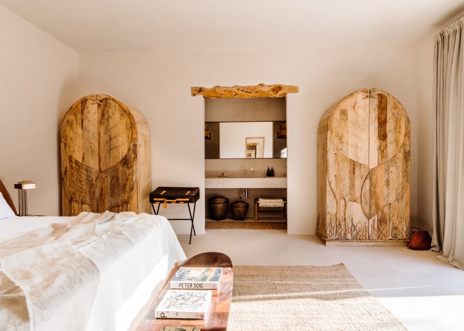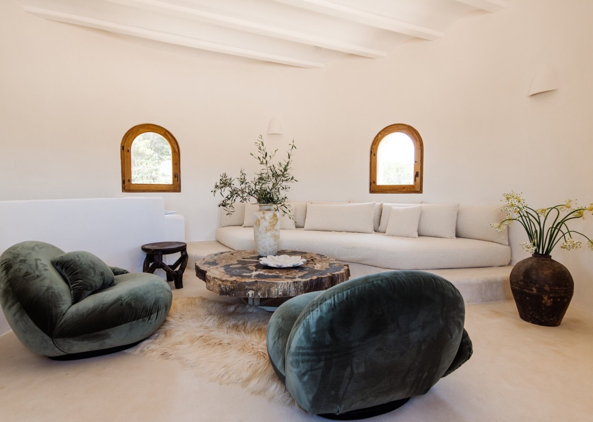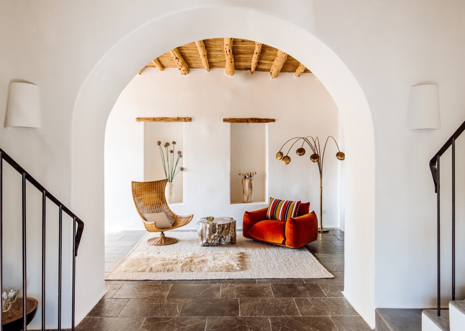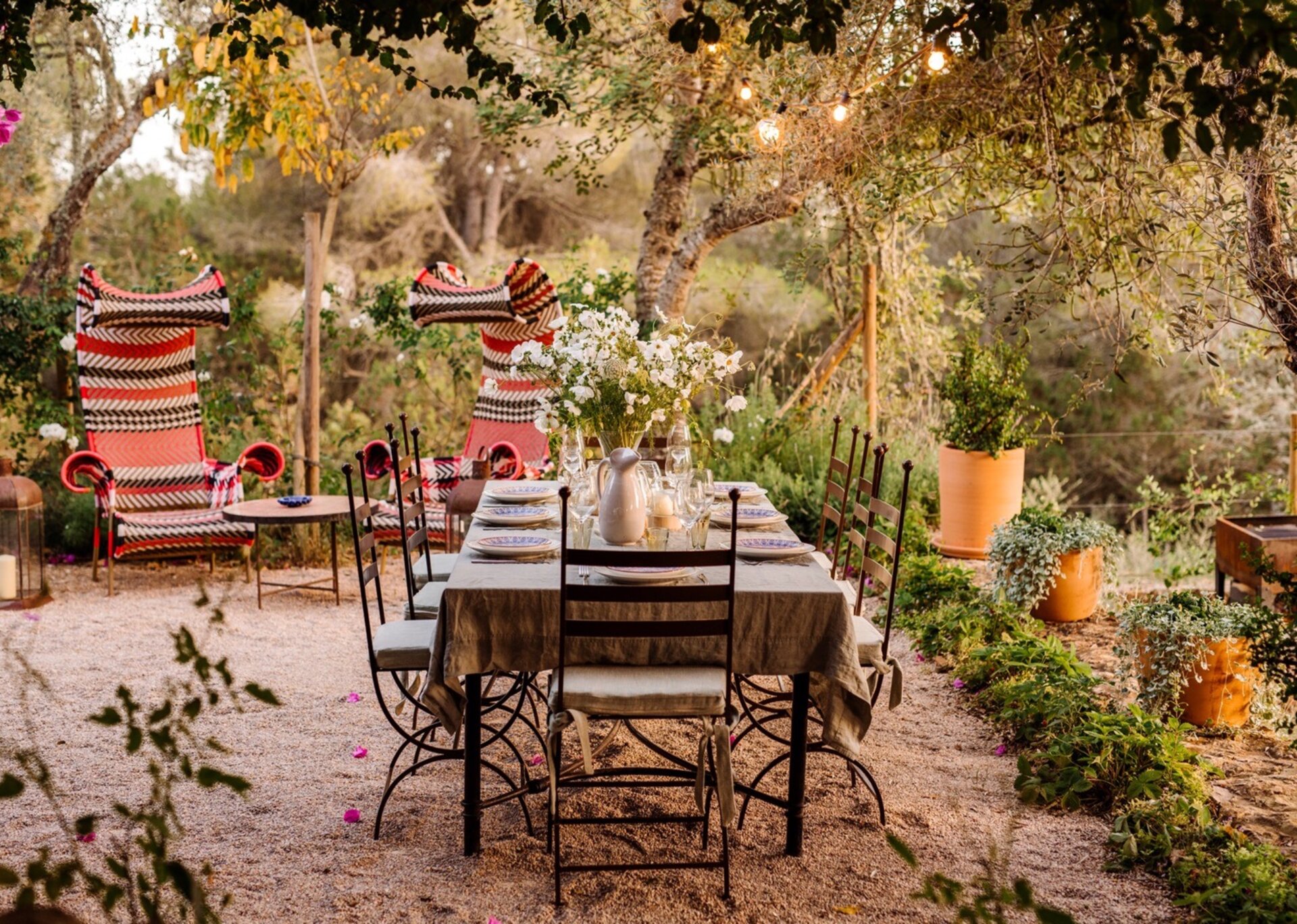 Unpretentious yet superbly eclectic in design, Villa Maze captivates with its vibrant and unapologetic charm. Brightly colored chill outs furnished by Roche Bobois, Pierre Paulin Pacha chairs, and Paavo Tynell lighting seamlessly complement the sumptuous Minotti sofas. It artfully weaves together the iconic styles of legendary seventies Italian designers, such as Arflex, paying homage to the island's psychedelic era. The estate's walls serve as a canvas for internationally renowned artists, featuring captivating works by talents like Rafi Kalenderian and Antonio Peticov. Local artist Adriana Meunie's textile wall hangings and Laura de Grinyo's exquisite ceramics add a touch of regional artistry. Step through the entrance and be greeted by a handmade chandelier crafted from sansevieria, illuminating a space that speaks volumes about Villa Maze's distinctive character and atmosphere.
