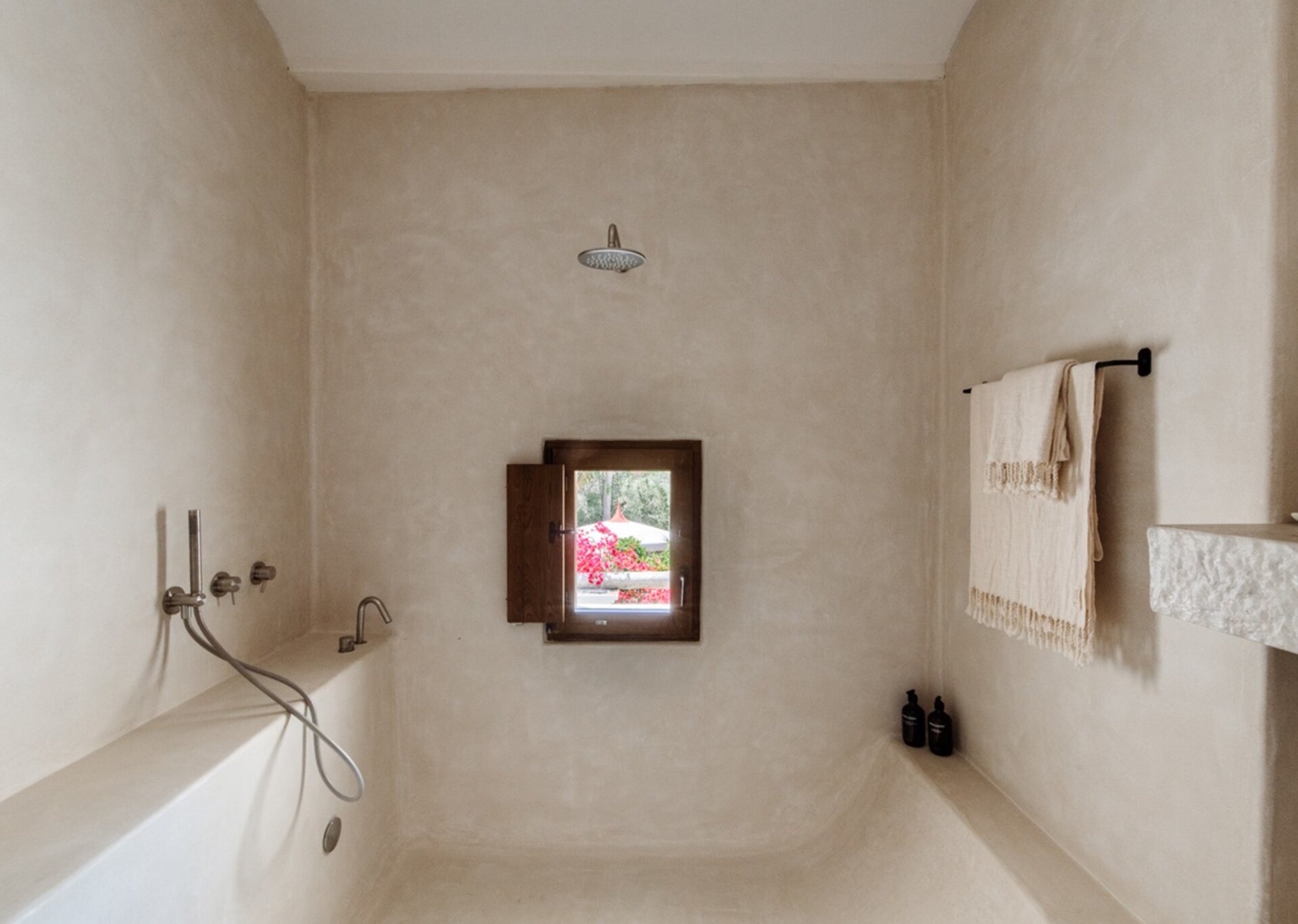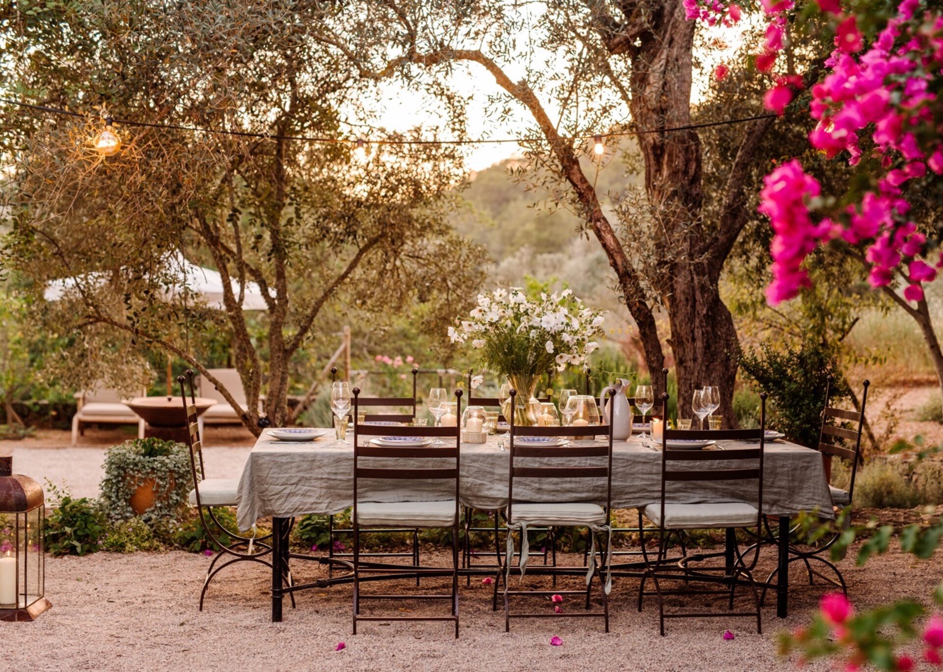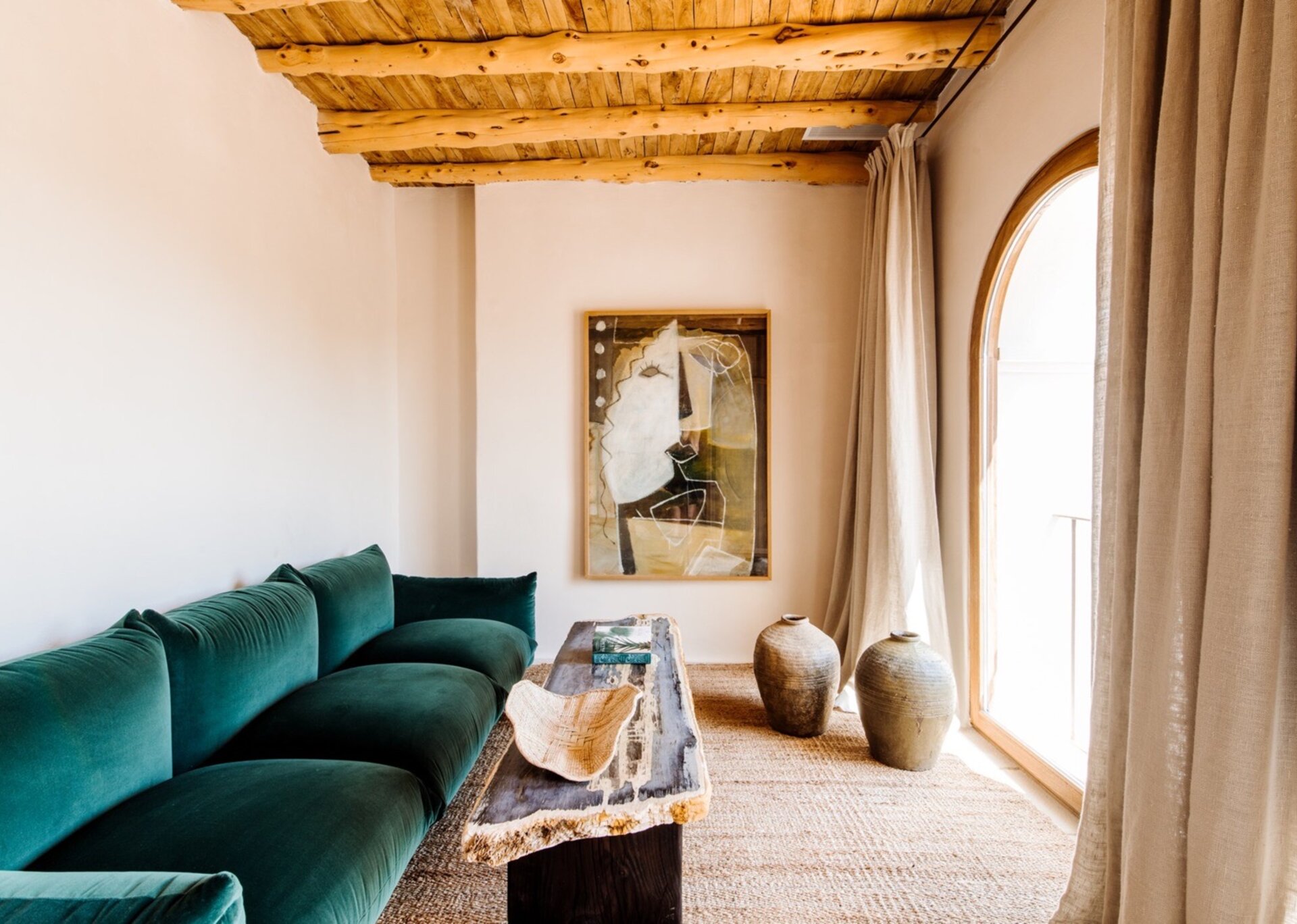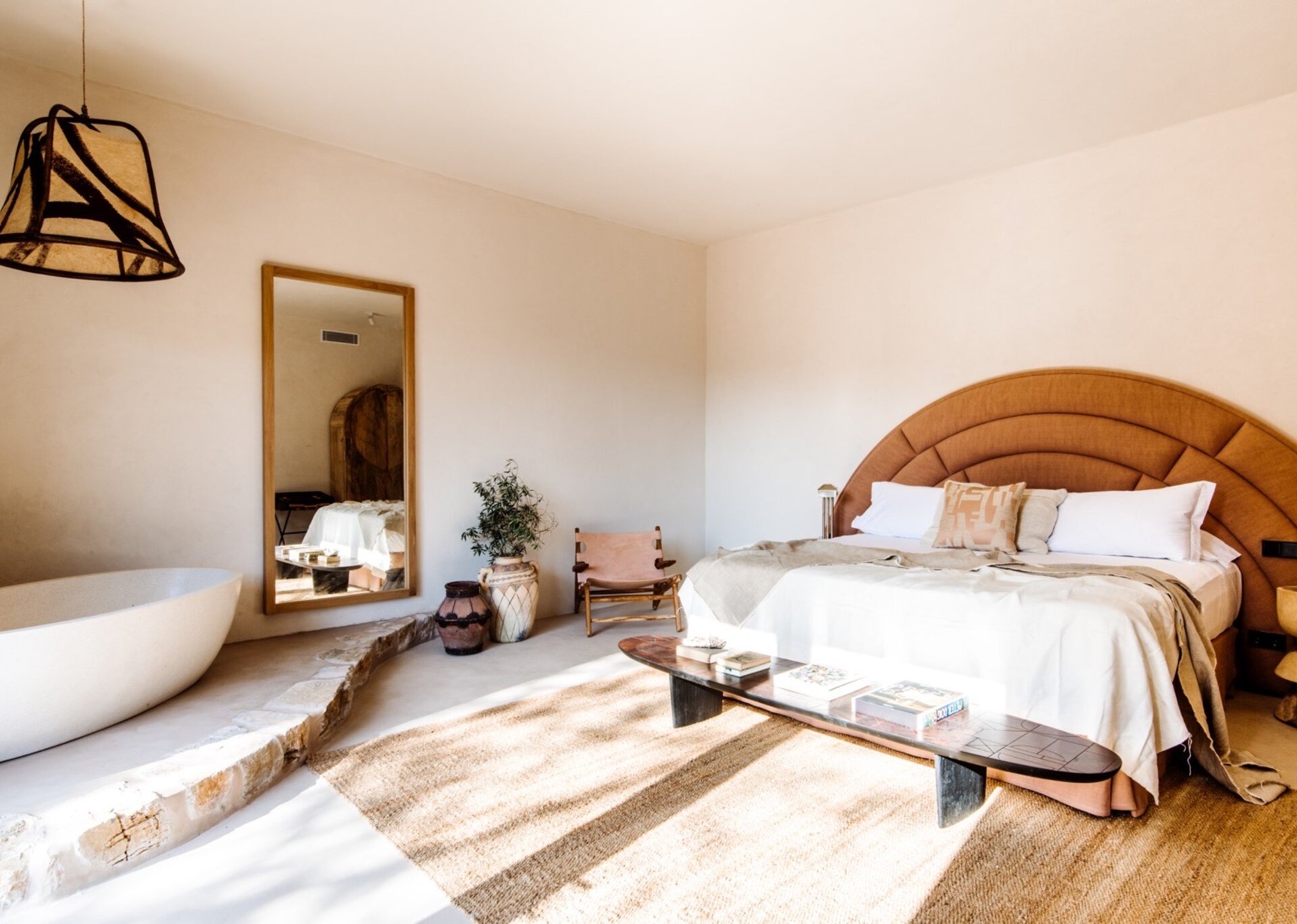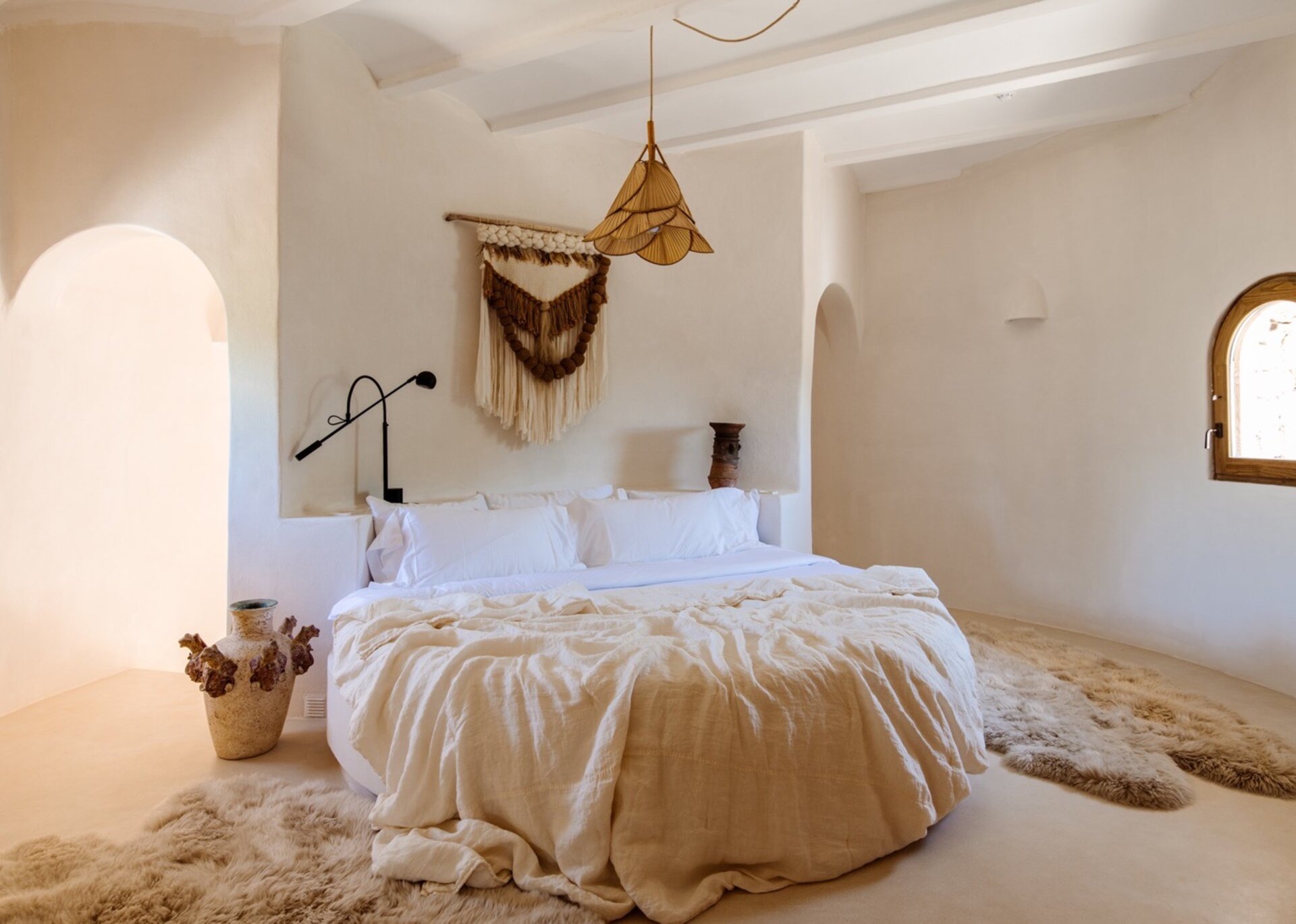 Unpretentious yet superbly eclectic in design, Villa Maze captivates with its vibrant and unapologetic charm. Brightly colored chill outs furnished by Roche Bobois, Pierre Paulin Pacha chairs, and Paavo Tynell lighting seamlessly complement the sumptuous Minotti sofas. It artfully weaves together the iconic styles of legendary seventies Italian designers, such as Arflex, paying homage to the island's psychedelic era. The estate's walls serve as a canvas for internationally renowned artists, featuring captivating works by talents like Rafi Kalenderian and Antonio Peticov. Local artist Adriana Meunie's textile wall hangings and Laura de Grinyo's exquisite ceramics add a touch of regional artistry. Step through the entrance and be greeted by a handmade chandelier crafted from sansevieria, illuminating a space that speaks volumes about Villa Maze's distinctive character and atmosphere.