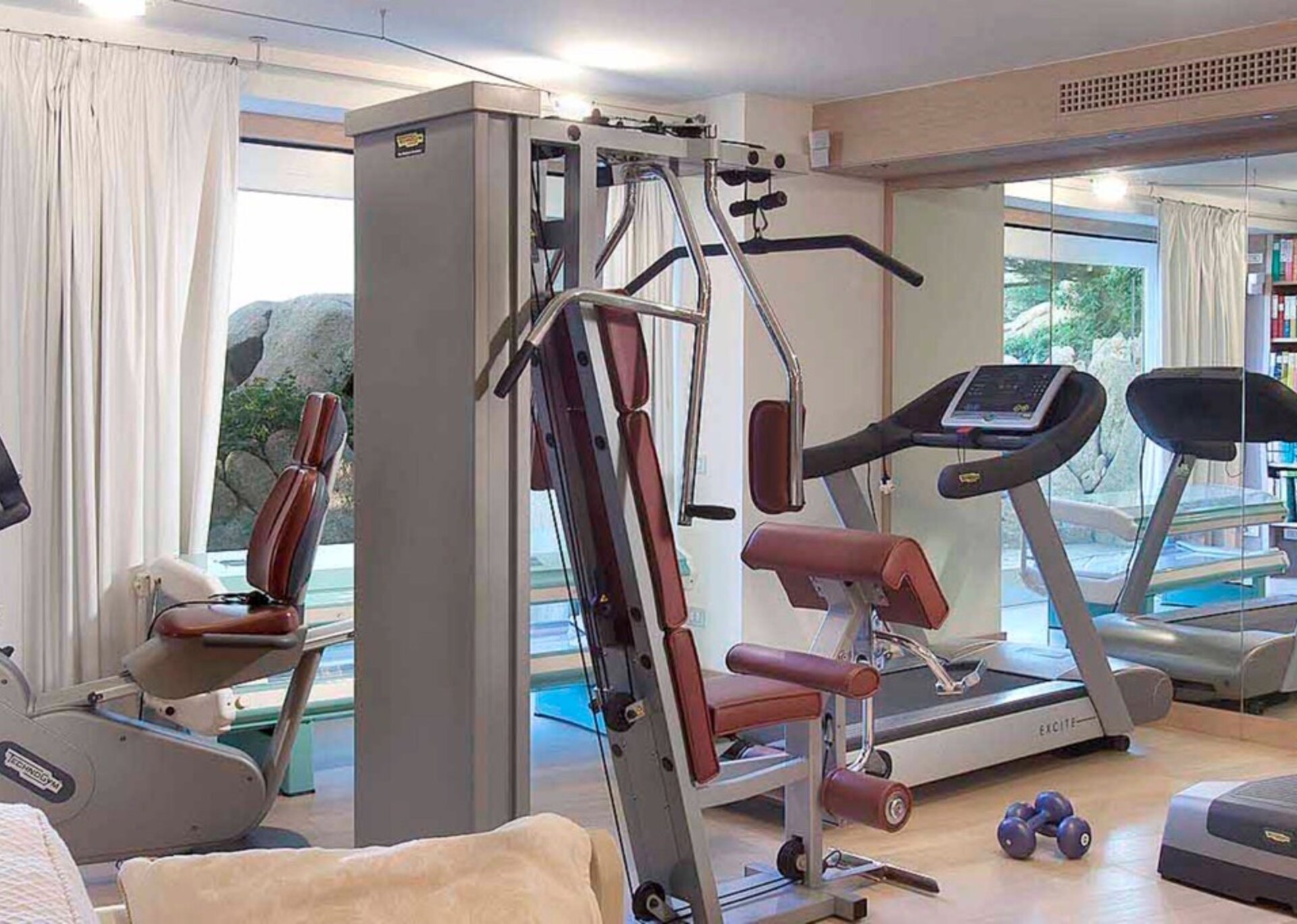 Low Garden Level: double bedroom, gym equipments, guest toilet, laundry room/staff bedroom with bunk beds and bathroom.