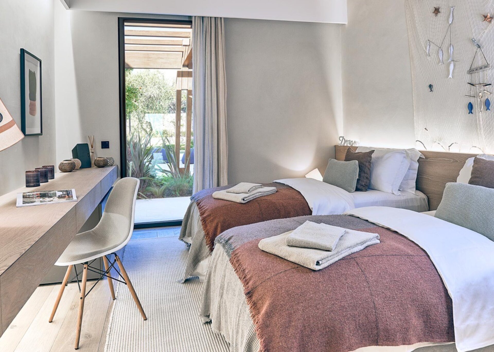 Sleeps 2 – Two skinny twins. Bathroom with rain shower shared with Bedroom 4. Access to shared patio.