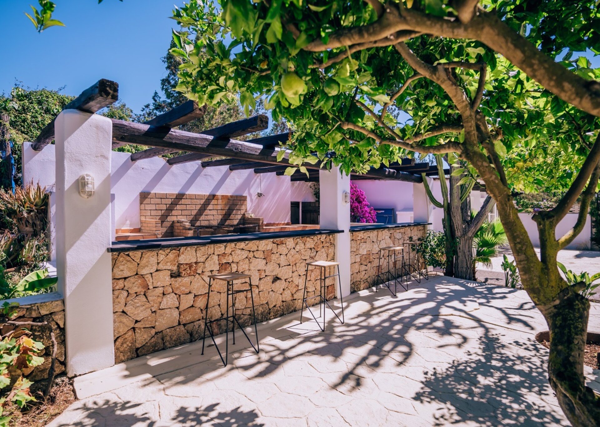 Nestled near San Antonio and a mere 15-minute drive from Ibiza town, this delightful villa offers a serene and convenient location. The expansive garden boasts lush lemon and orange trees, while the terrace areas feature an outdoor kitchen and BBQ, perfect for enjoying the inviting pool area.