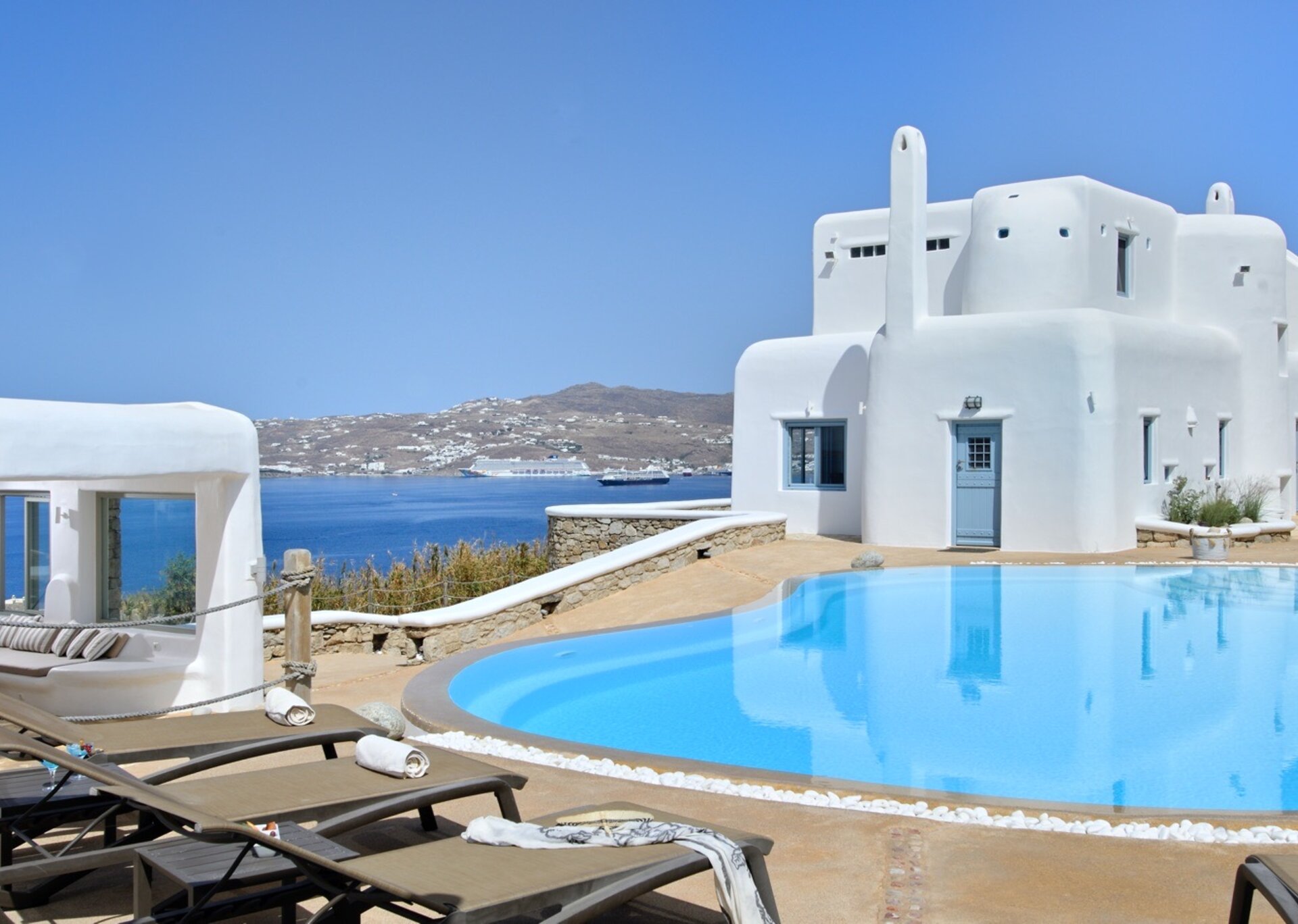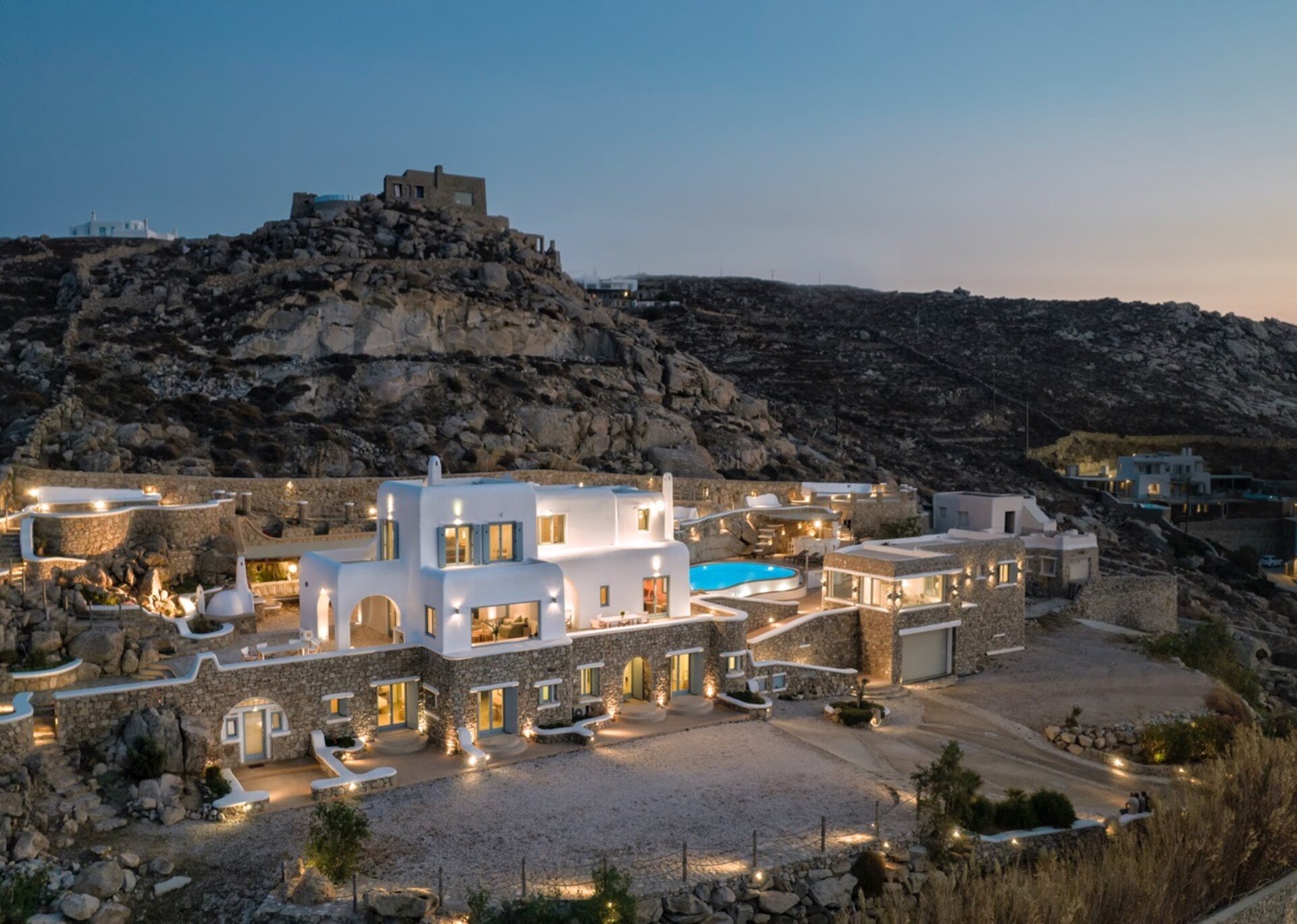 Perched serenely atop an elevated hill, the luxurious estate of Villa Mila is a sight to behold. This breathtaking villa looks out over Mykonos Town, Little Venice, and the charming harbor, offering a picturesque view of the island's enthralling skyline.