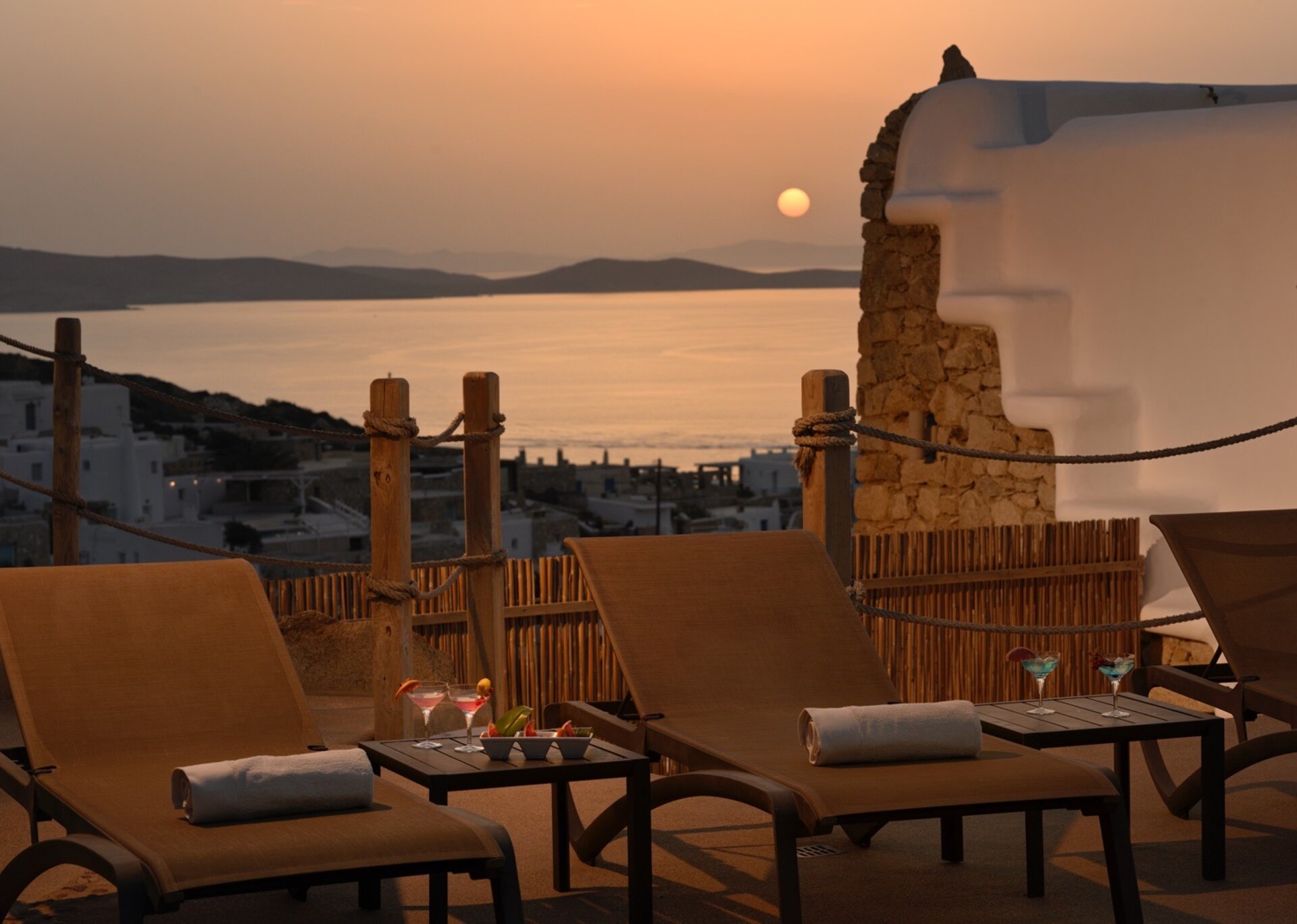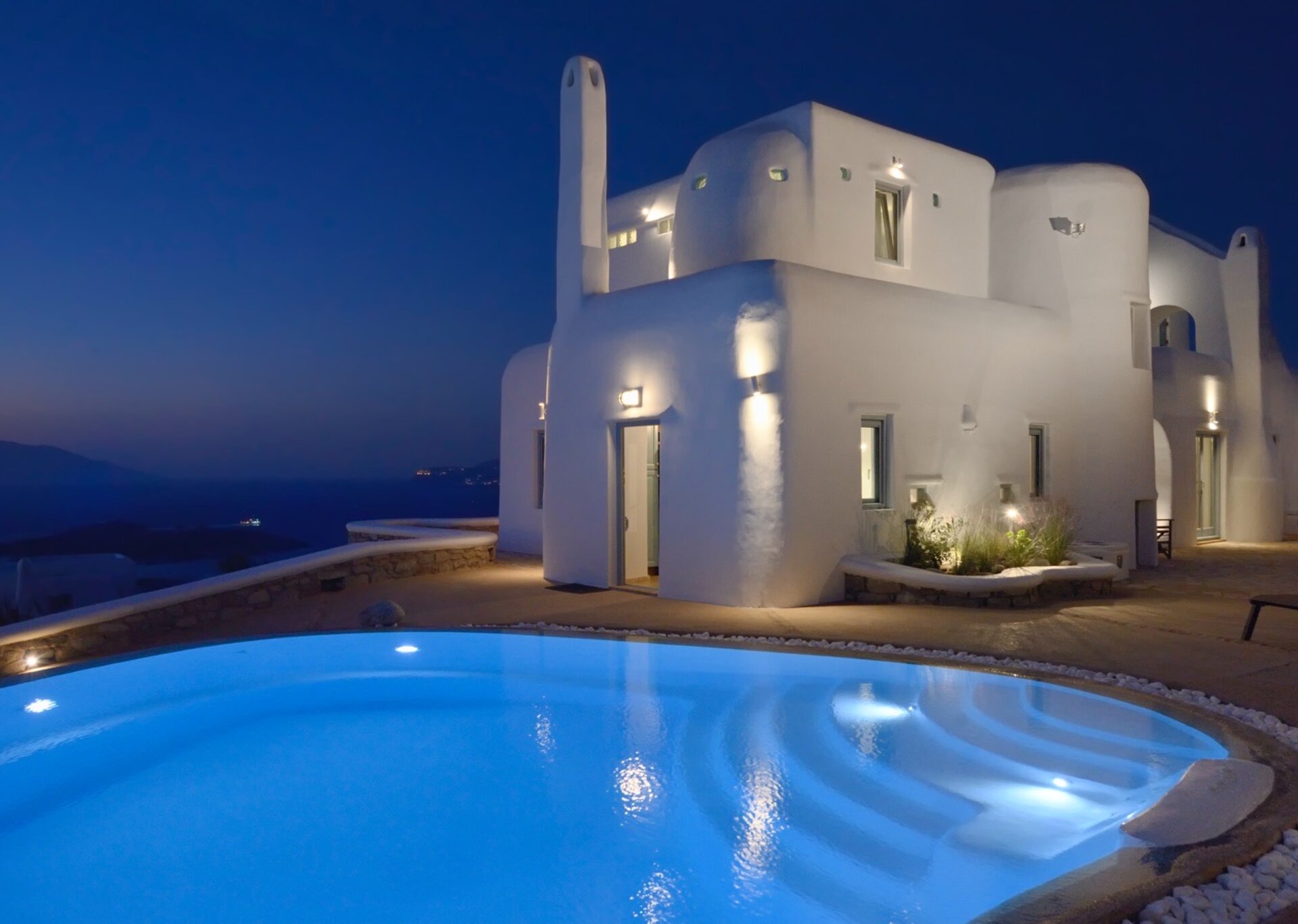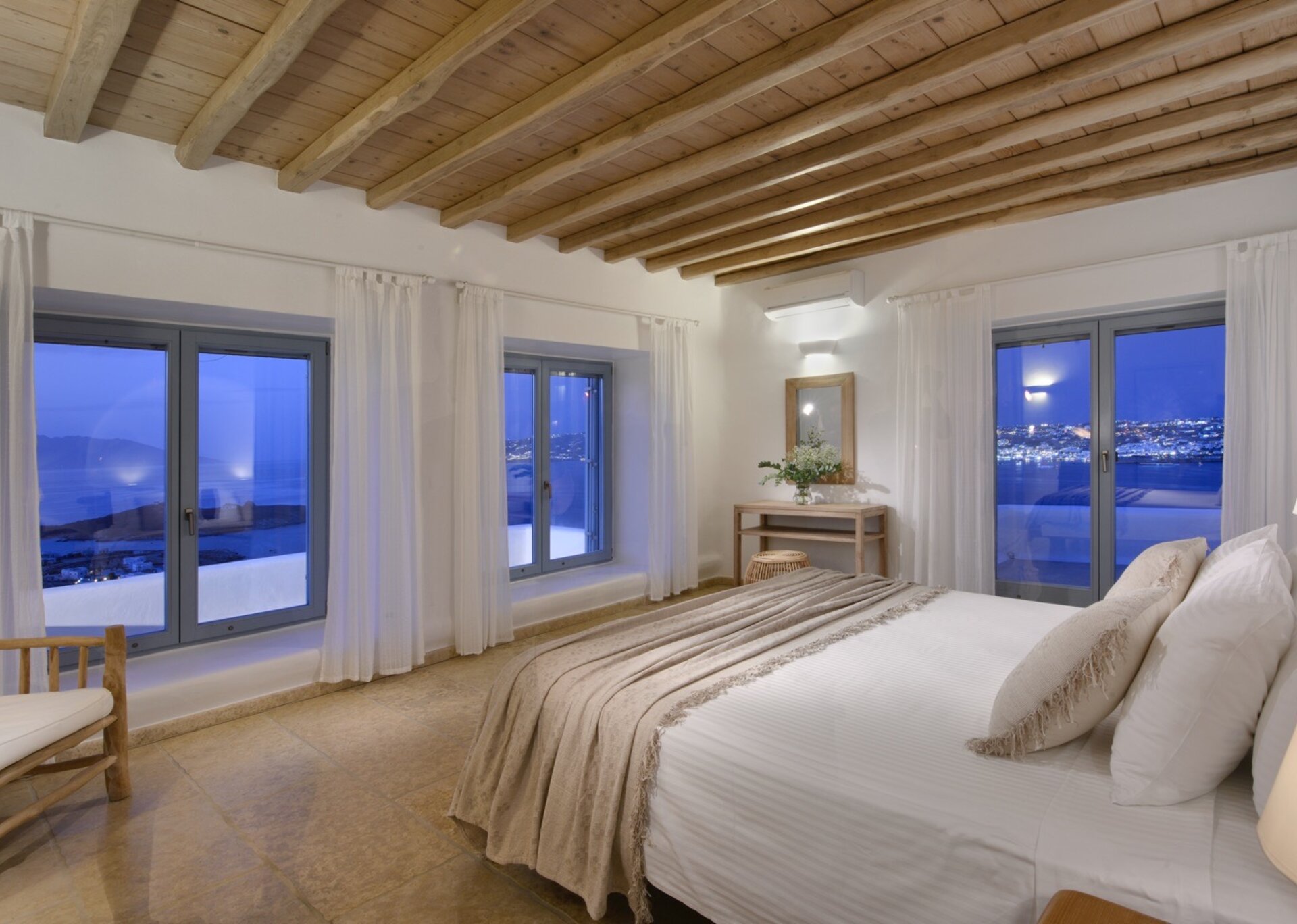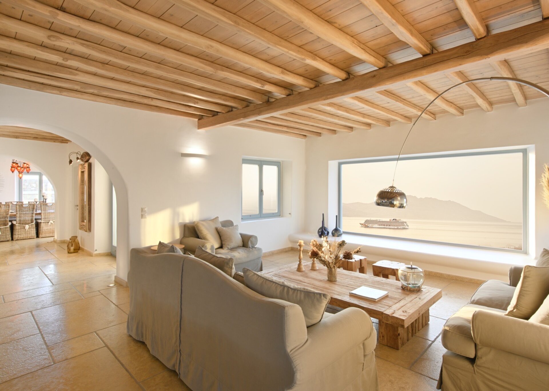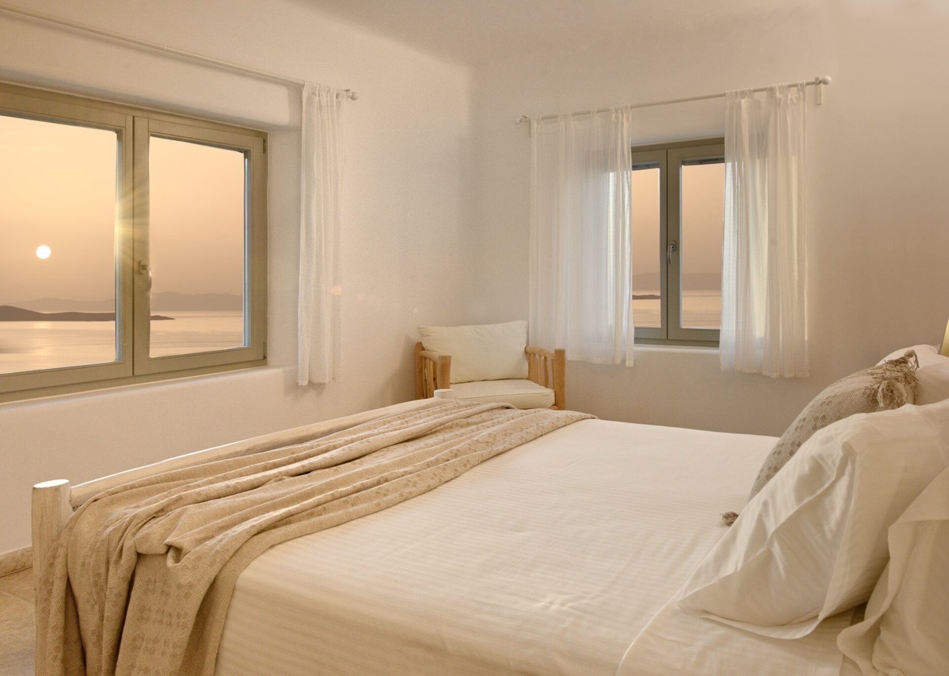 As the sun sets below the horizon, the views from Villa Mila are truly unforgettable. The surrounding Cycladic landscape, with its stunning islands – Tinos, Syros, Diles, Yaros, and Baos – marks the spot where the land meets the crystal blue waters of Mykonos, creating a magical atmosphere that you'll never forget.