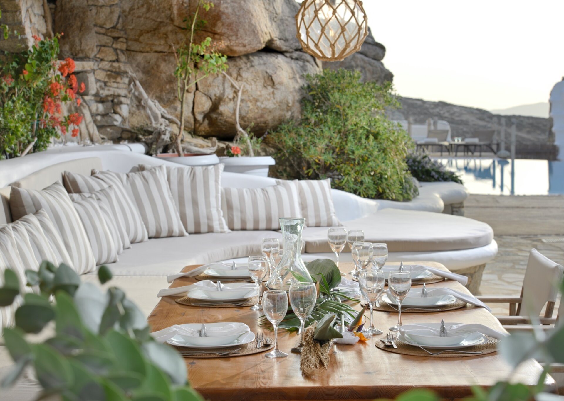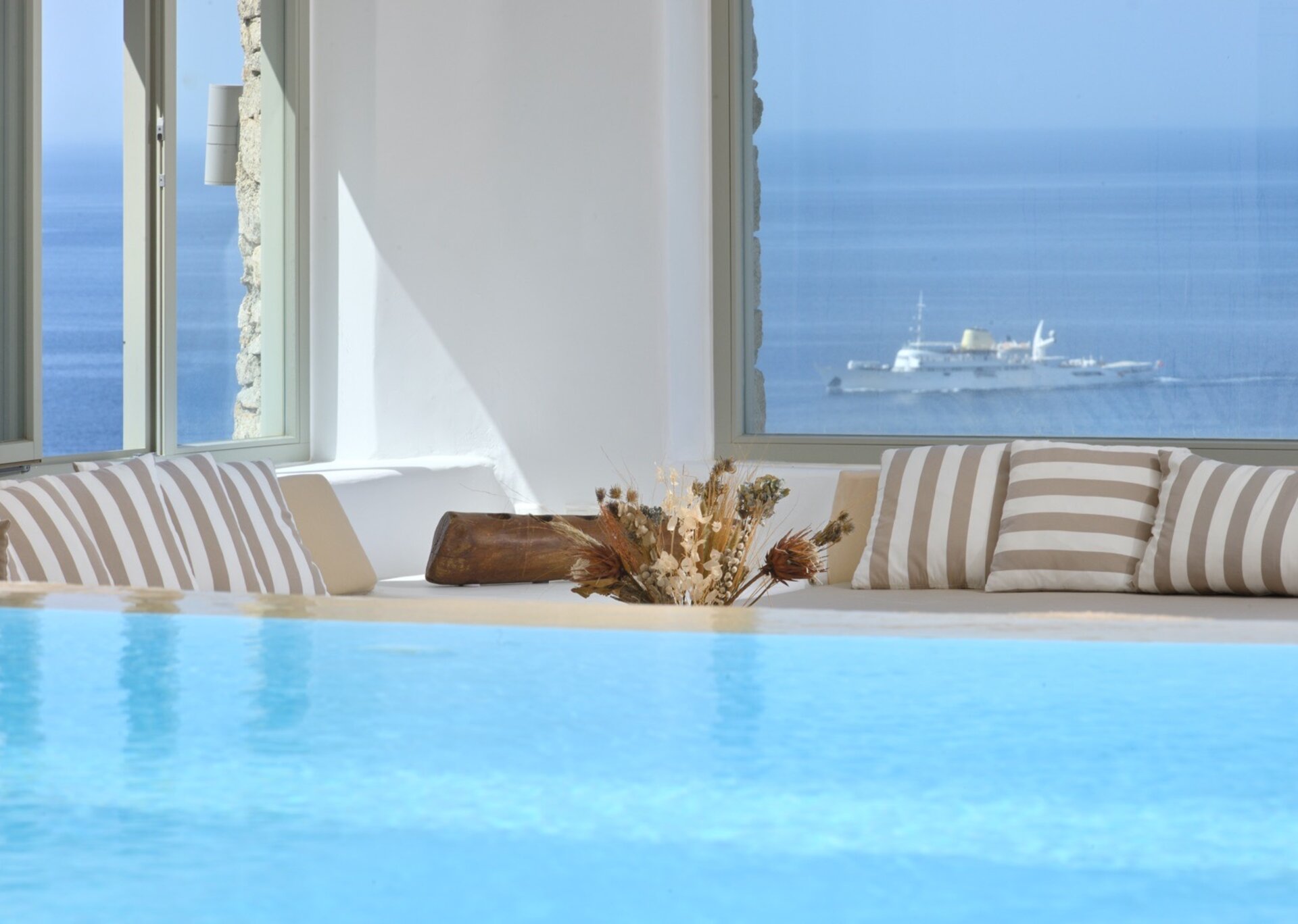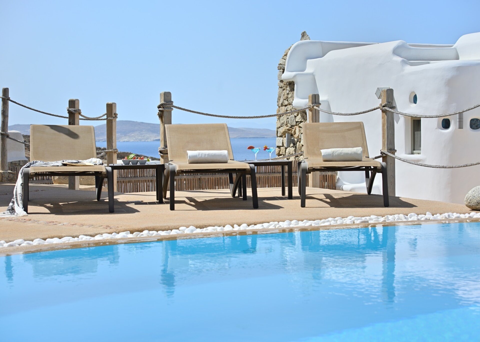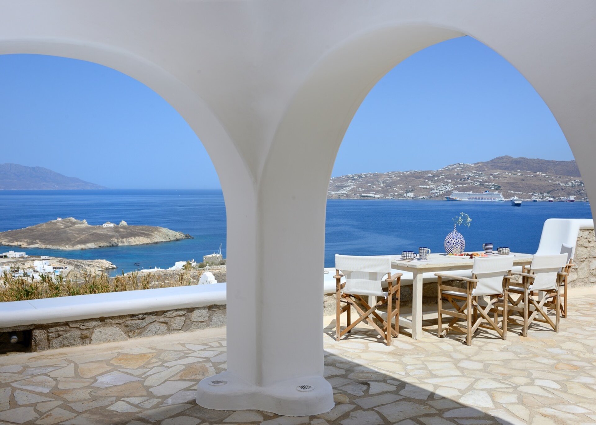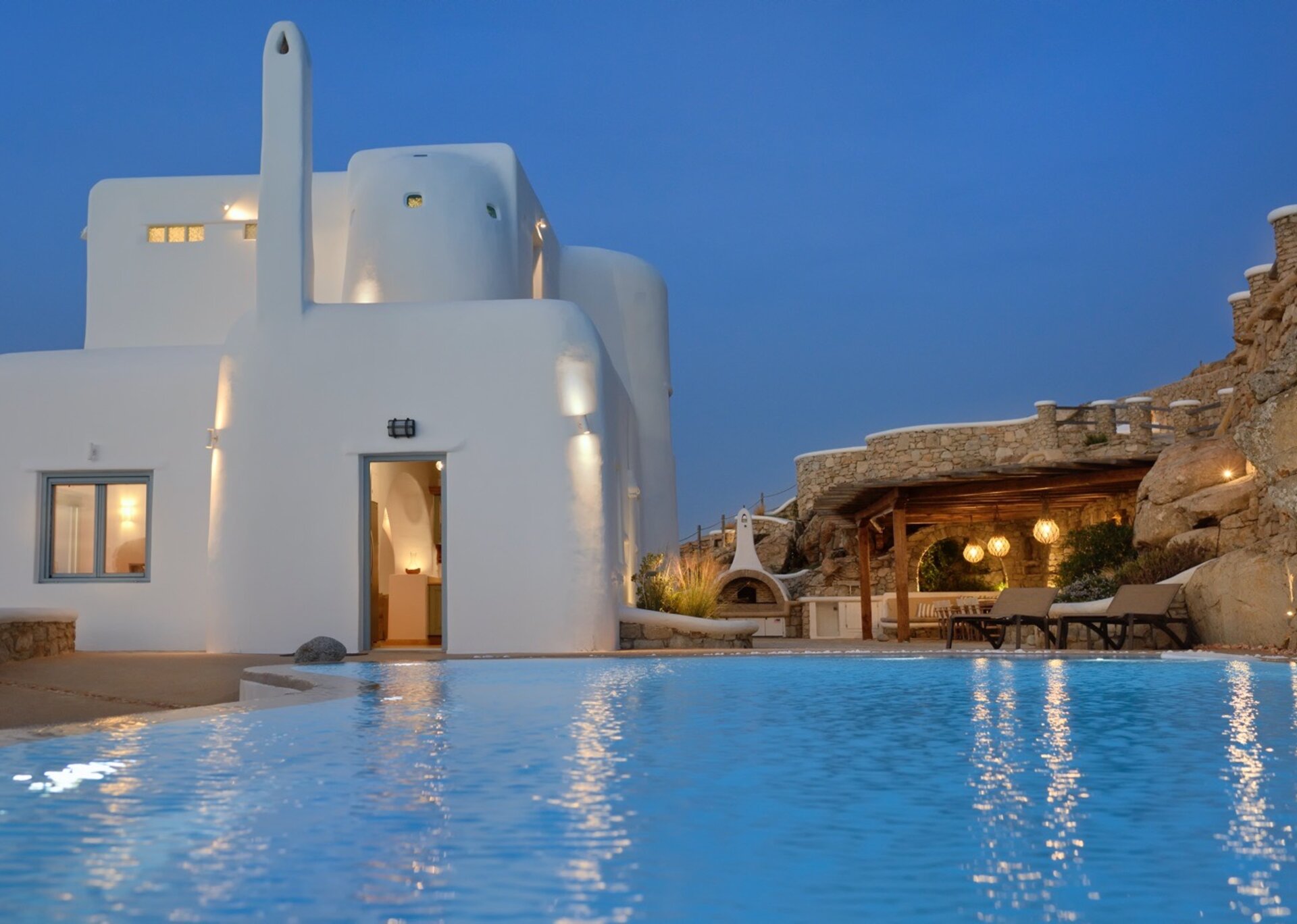 As the sun sets below the horizon, the views from Villa Mila are truly unforgettable. The surrounding Cycladic landscape, with its stunning islands – Tinos, Syros, Diles, Yaros, and Baos – marks the spot where the land meets the crystal blue waters of Mykonos, creating a magical atmosphere that you'll never forget.