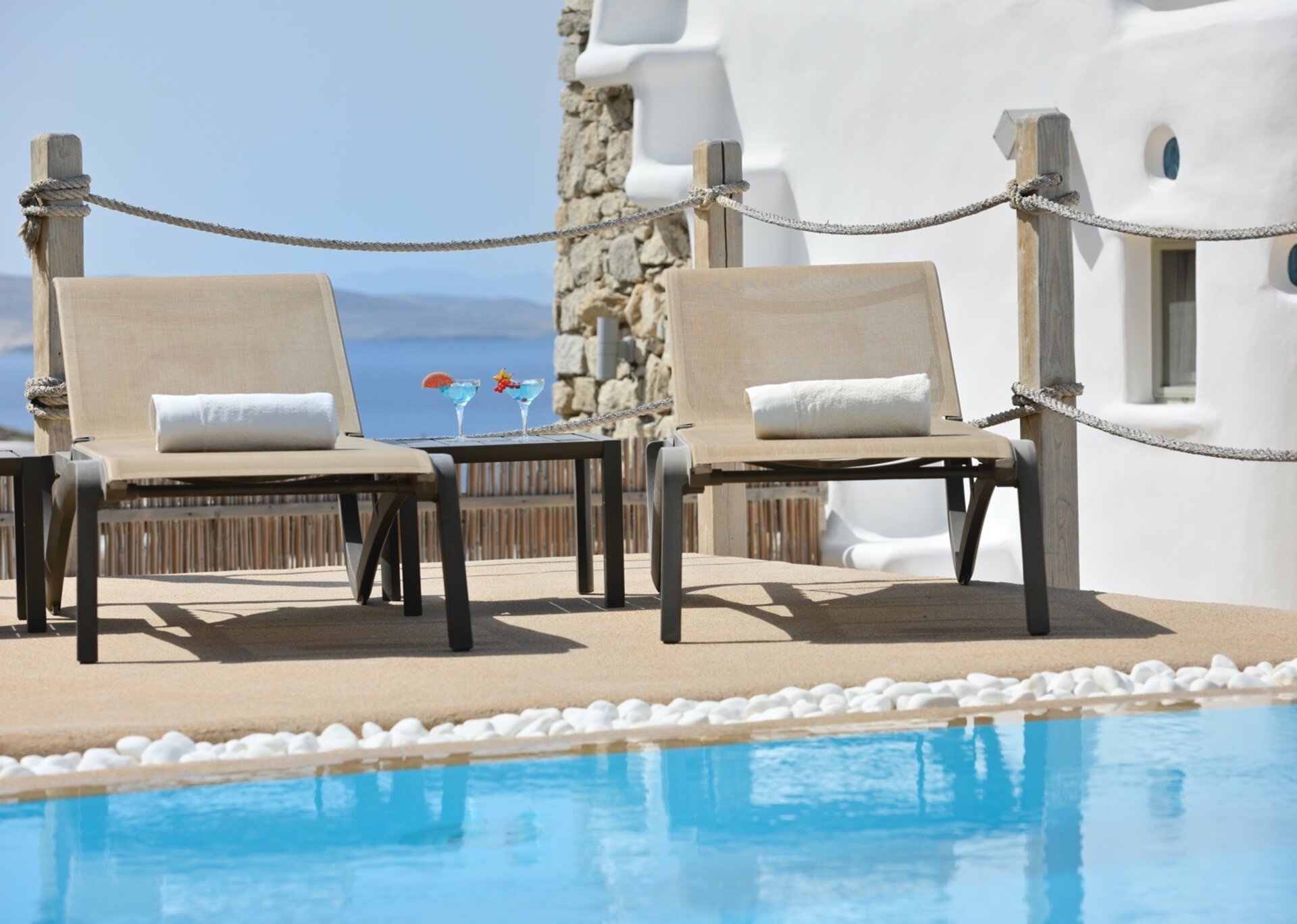The villa's glorious design invites you to become one with the picturesque rocky surroundings. The infinity pool, nestled amongst the granite boulders, is the perfect way to experience the natural beauty of Mykonos. Additionally, twelve luxurious and spacious terraces, furnished with plush chill-out areas, weave around the brilliant white cube villa, offering endless opportunities for sunbathing, relaxation, and romantic outdoor dining.