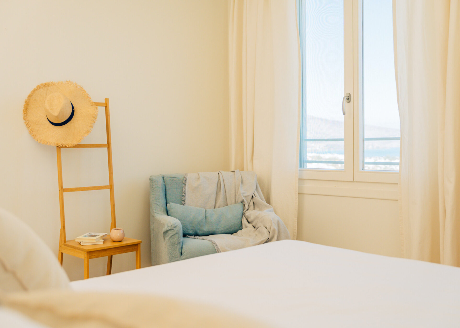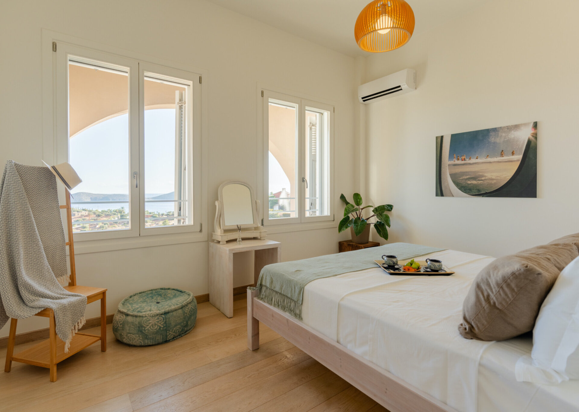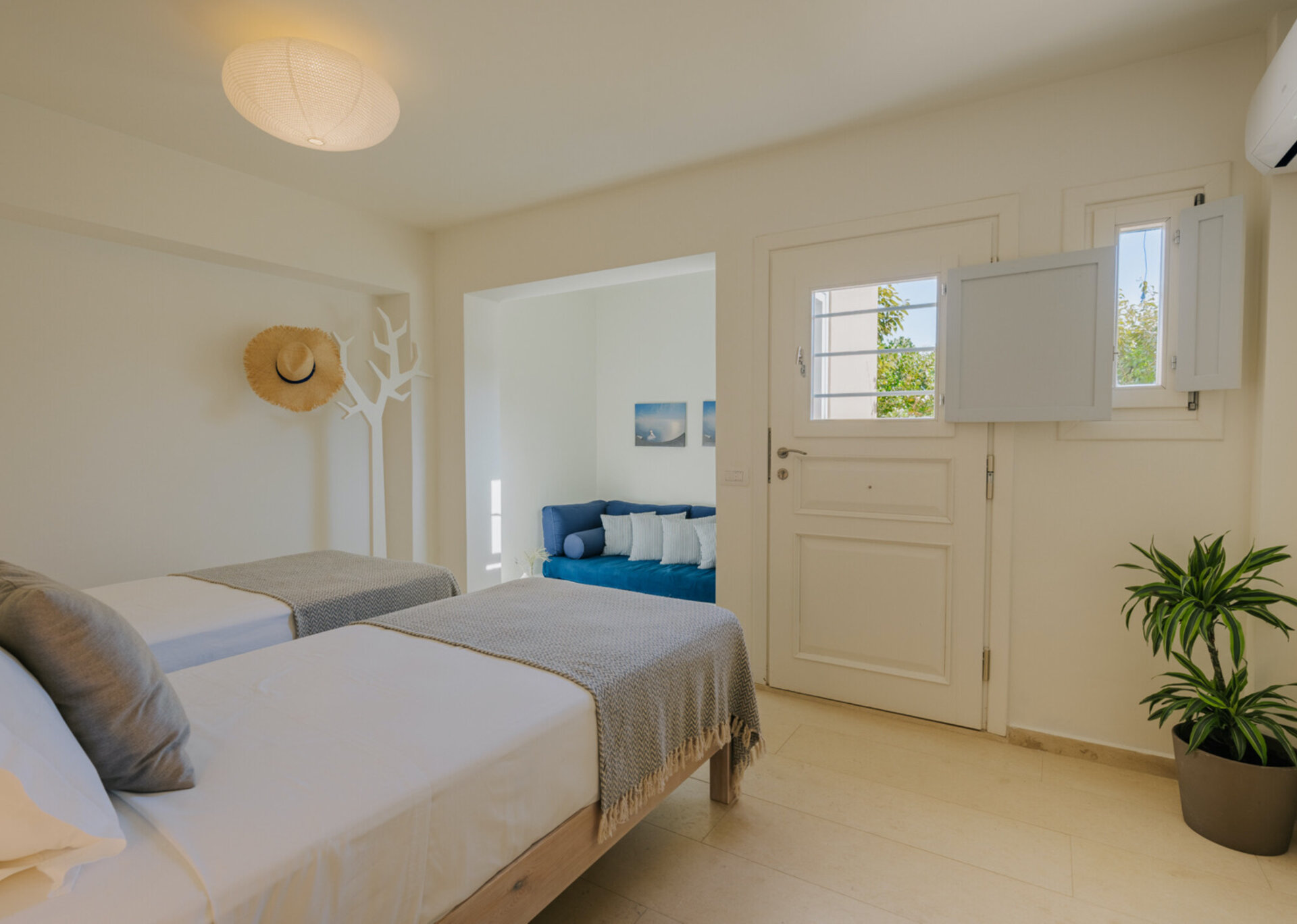 Double room (either with double bed 1.80 or twins or 2 sofas serving as the living room of the other bedroom) en suite with walk in shower, private entrance, TV, A/C, sea views