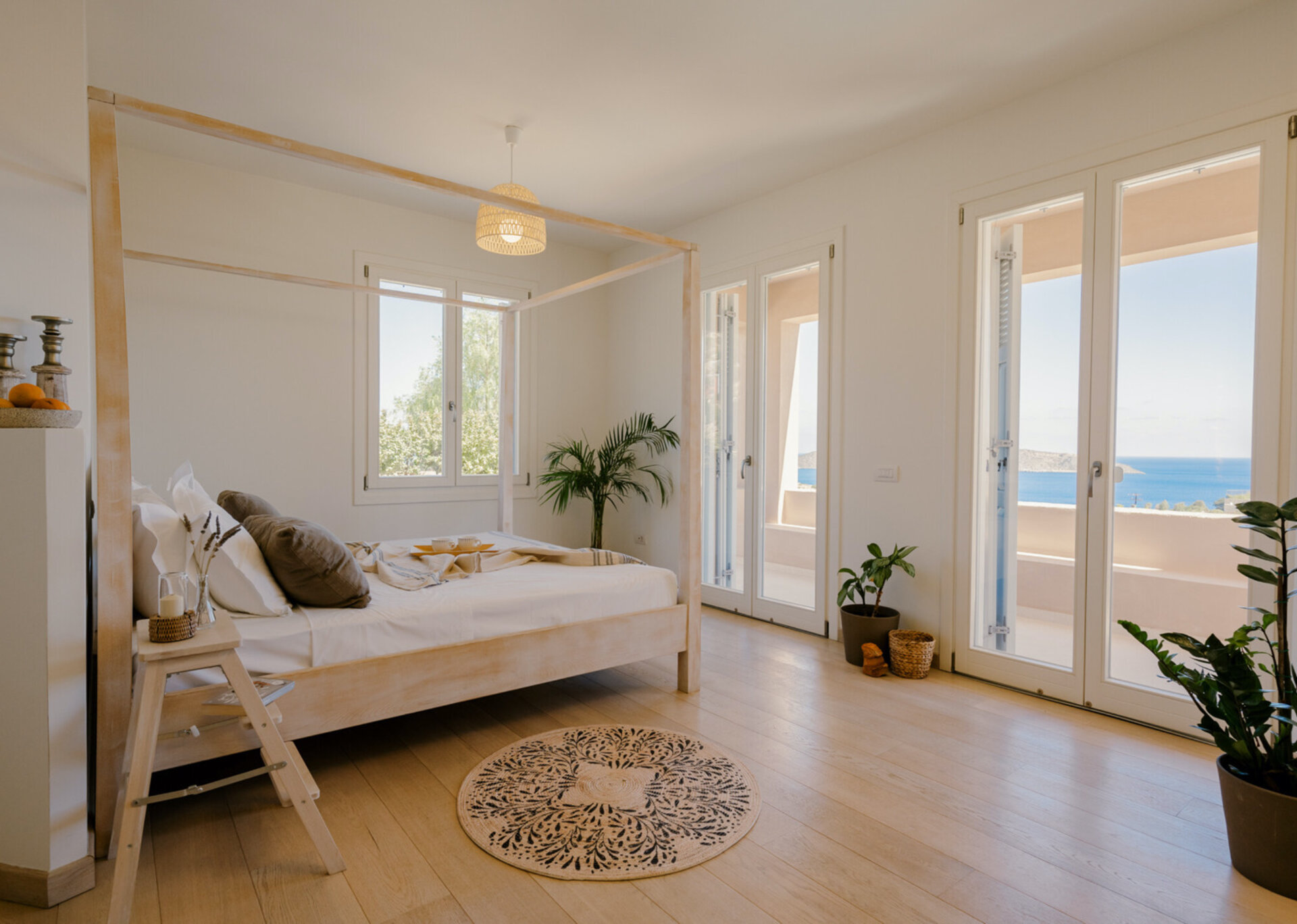 - Master bedroom (1.80m four-poster bed) with en-suite bathroom, closets and private terraces with sea views