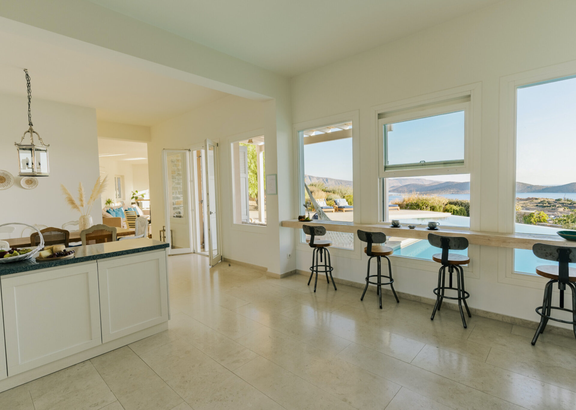 - Bar area in the kitchen with stools overlooking the pool and sea