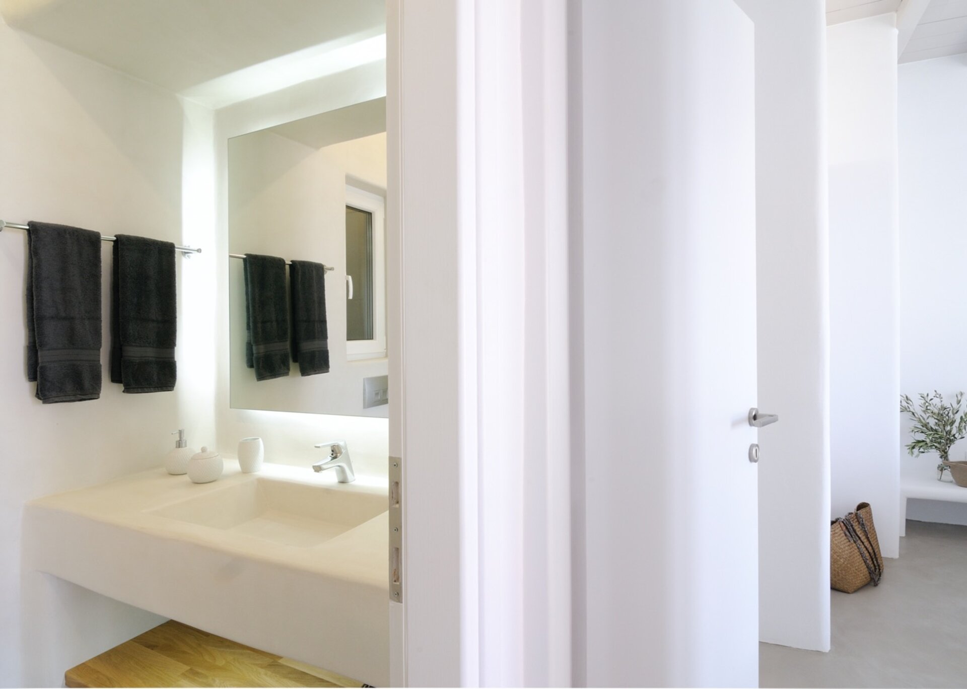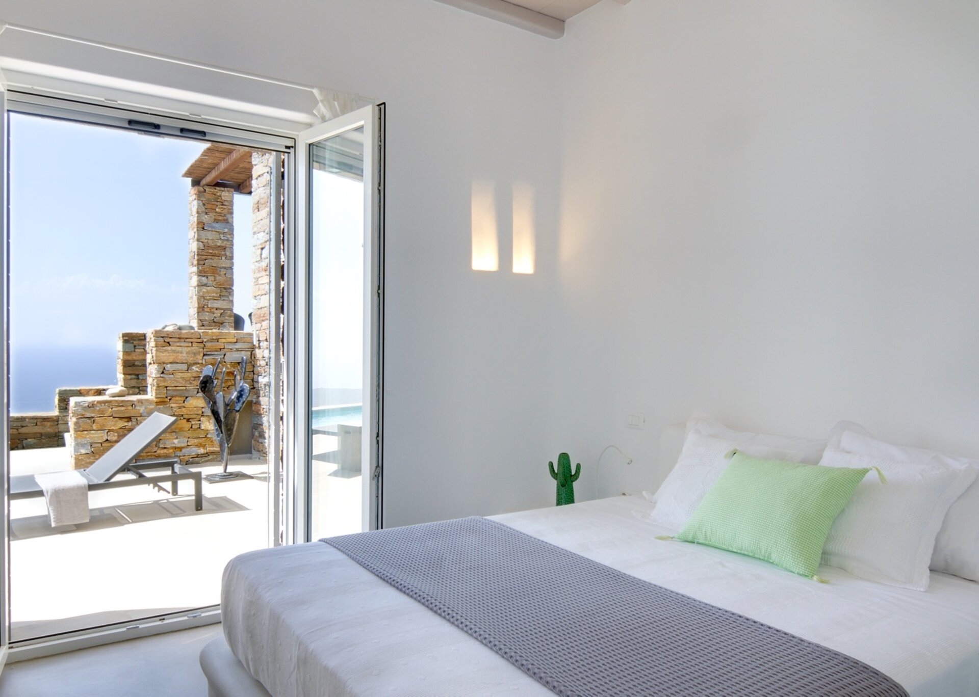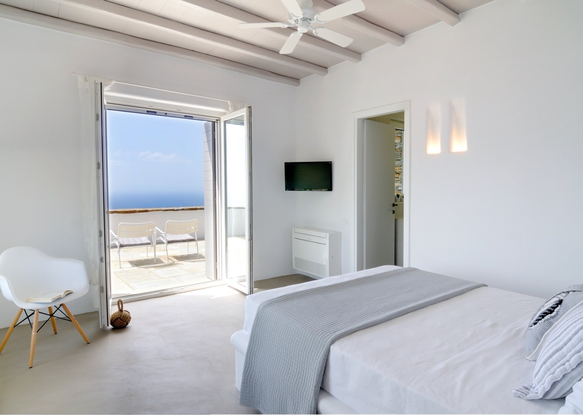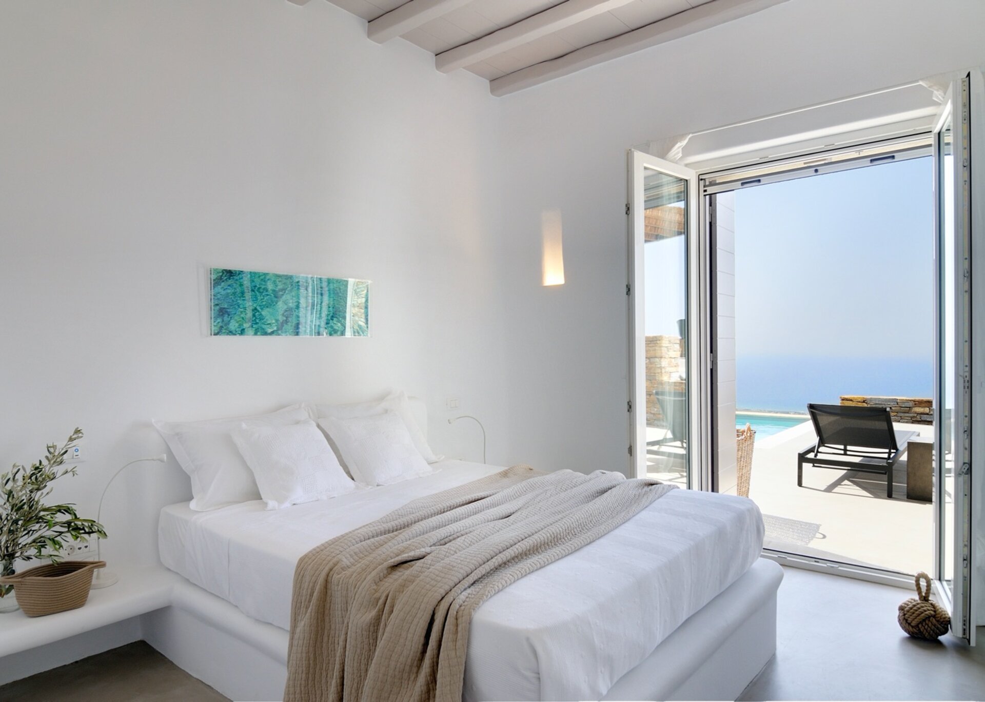 In addition to breathtaking sceneries of the captivating Aegean Sea, the villa provides its guests with a spacious and airy environment that extends to its outdoor areas. The pure white walls contrasted with polished cement flooring add a chic and minimalist touch to the villa's decor, providing guests with the ultimate atmosphere of relaxation.