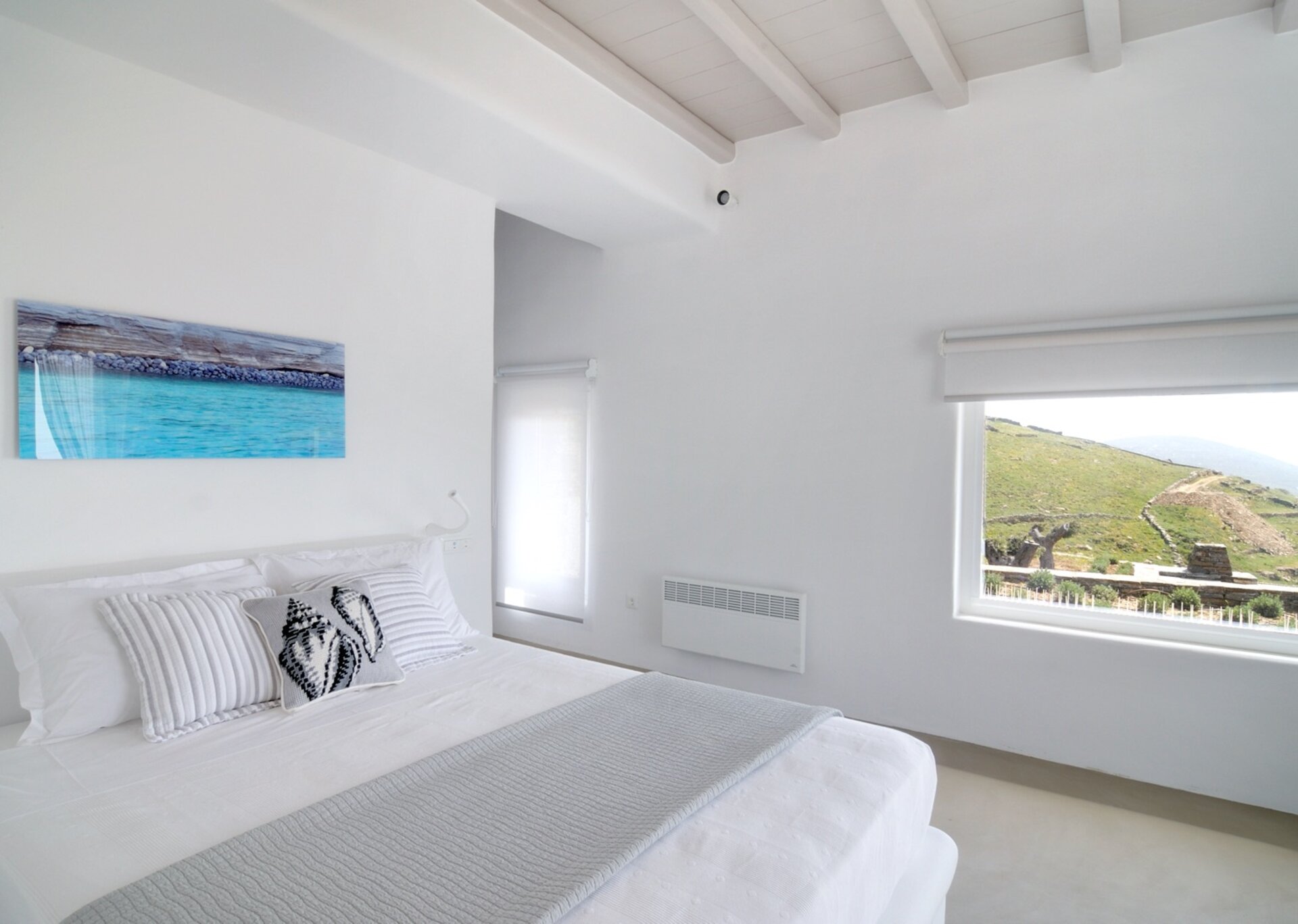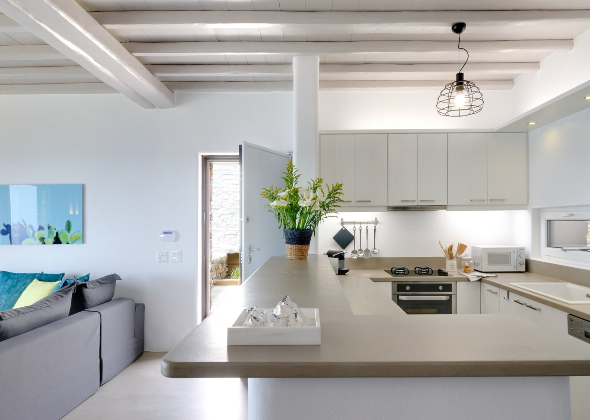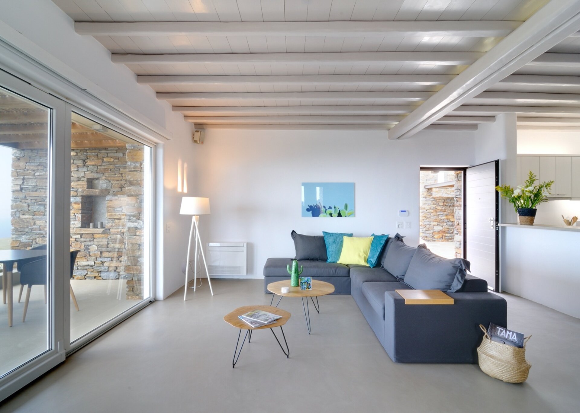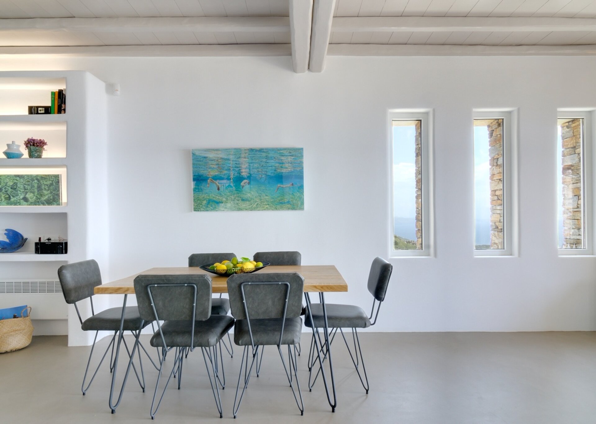 In addition to breathtaking sceneries of the captivating Aegean Sea, the villa provides its guests with a spacious and airy environment that extends to its outdoor areas. The pure white walls contrasted with polished cement flooring add a chic and minimalist touch to the villa's decor, providing guests with the ultimate atmosphere of relaxation.