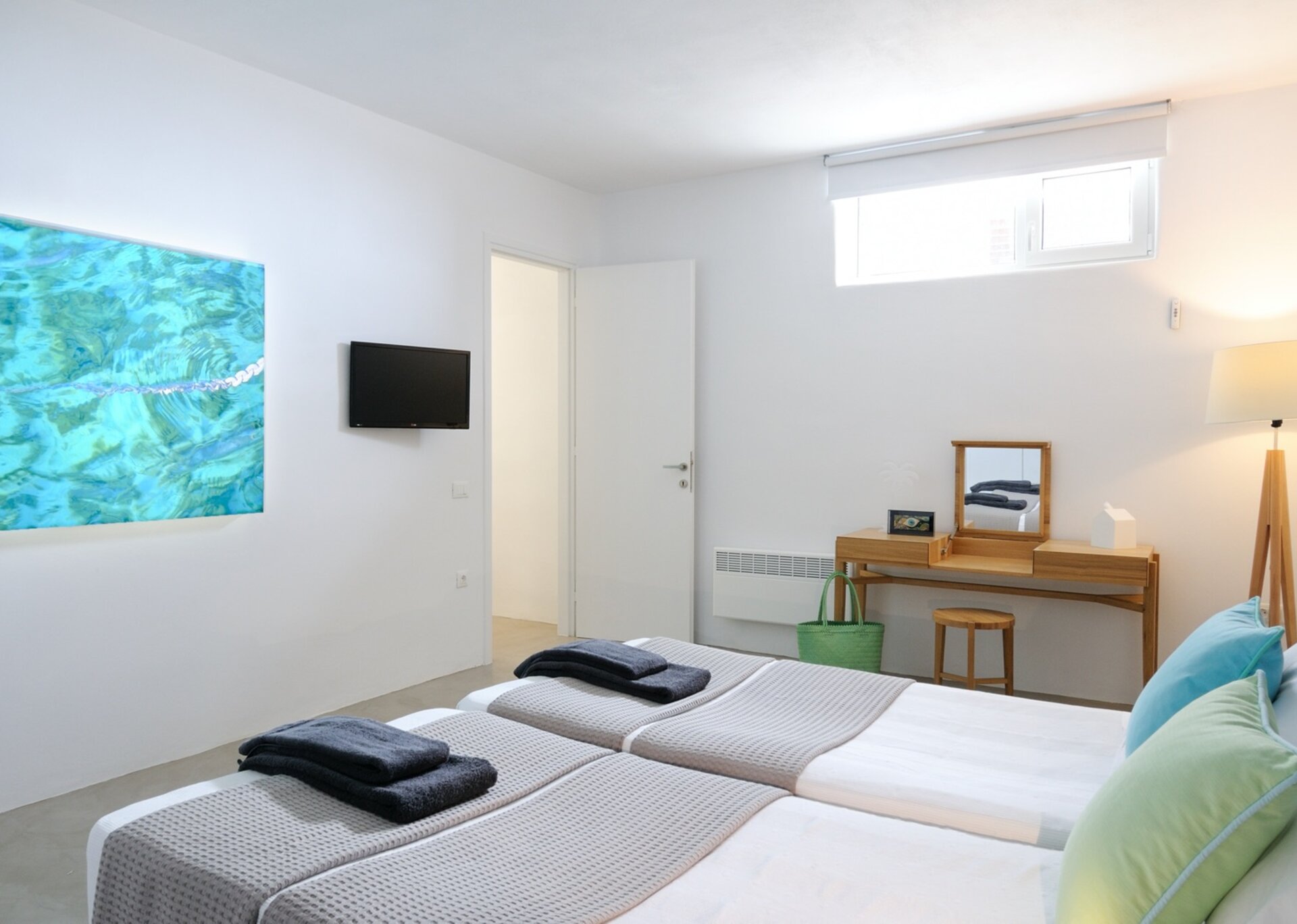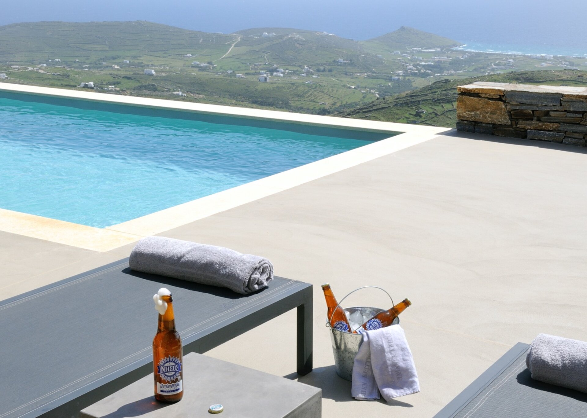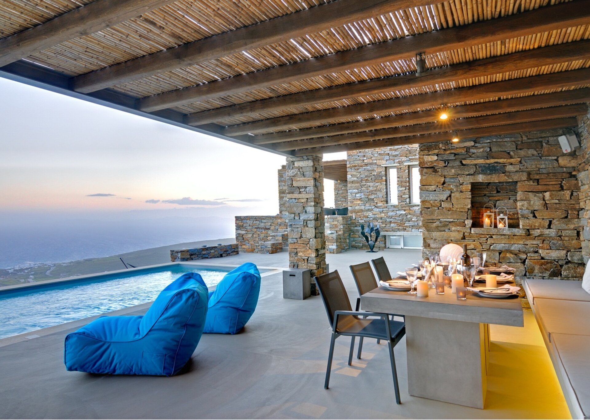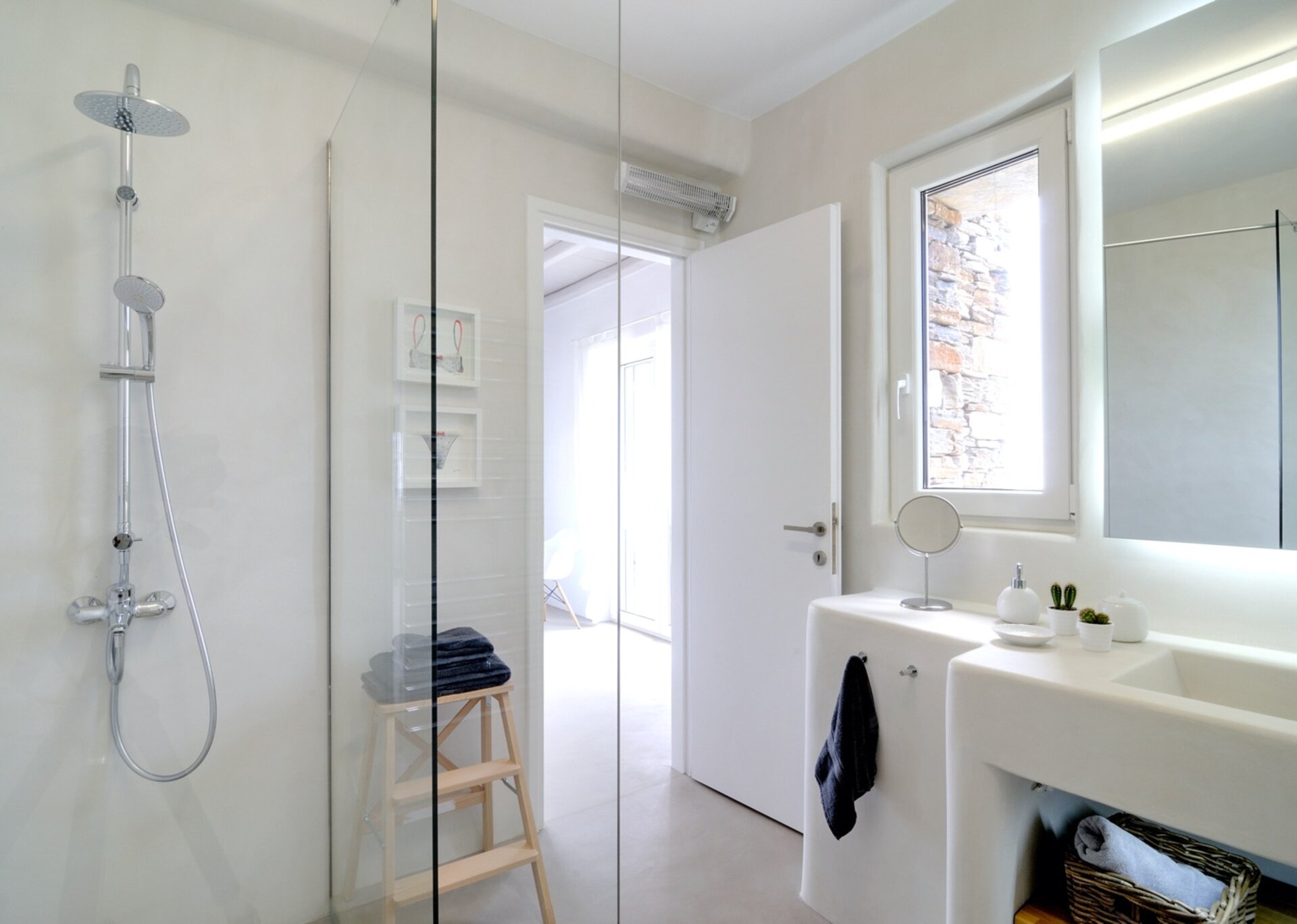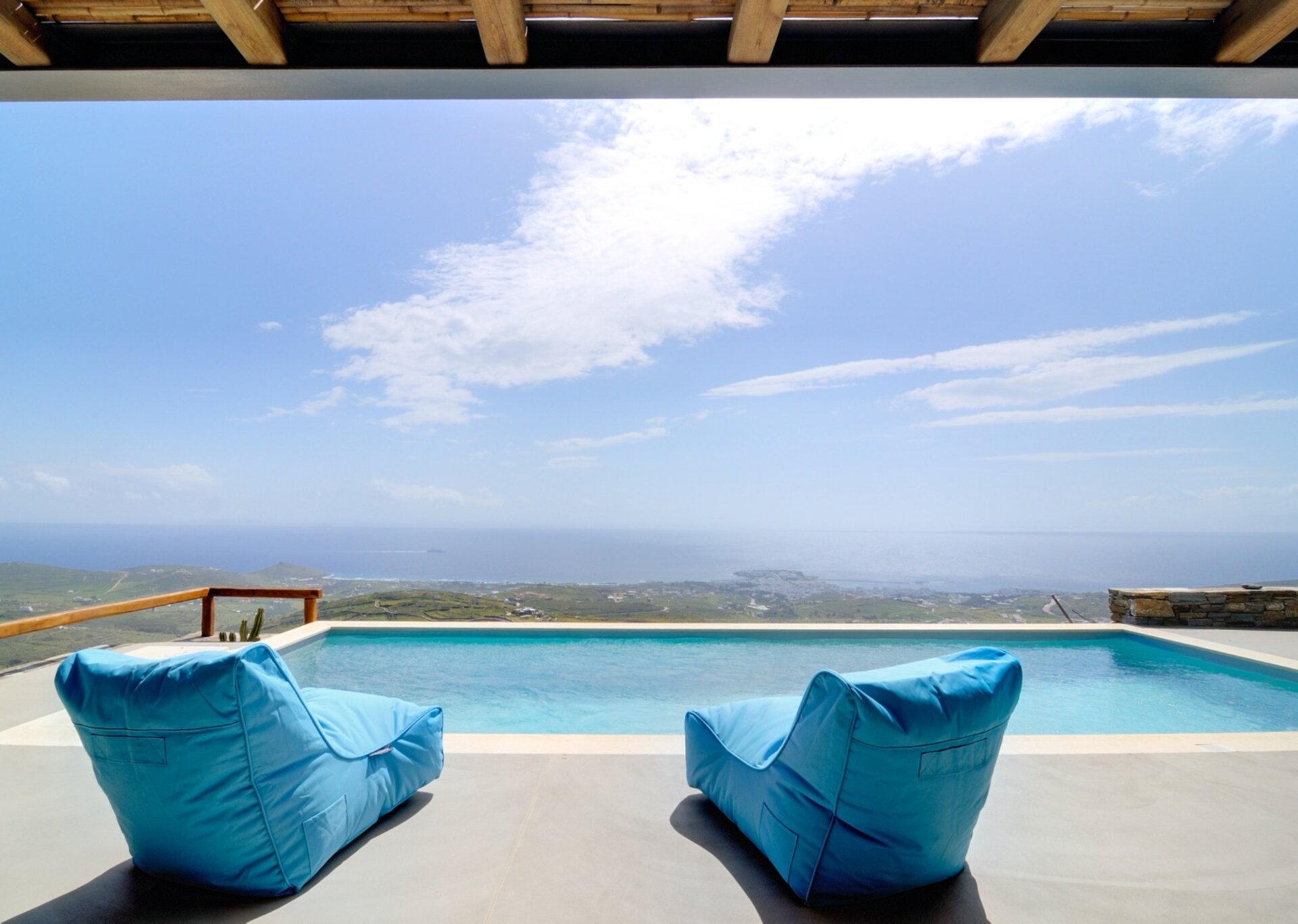In addition to breathtaking sceneries of the captivating Aegean Sea, the villa provides its guests with a spacious and airy environment that extends to its outdoor areas. The pure white walls contrasted with polished cement flooring add a chic and minimalist touch to the villa's decor, providing guests with the ultimate atmosphere of relaxation.