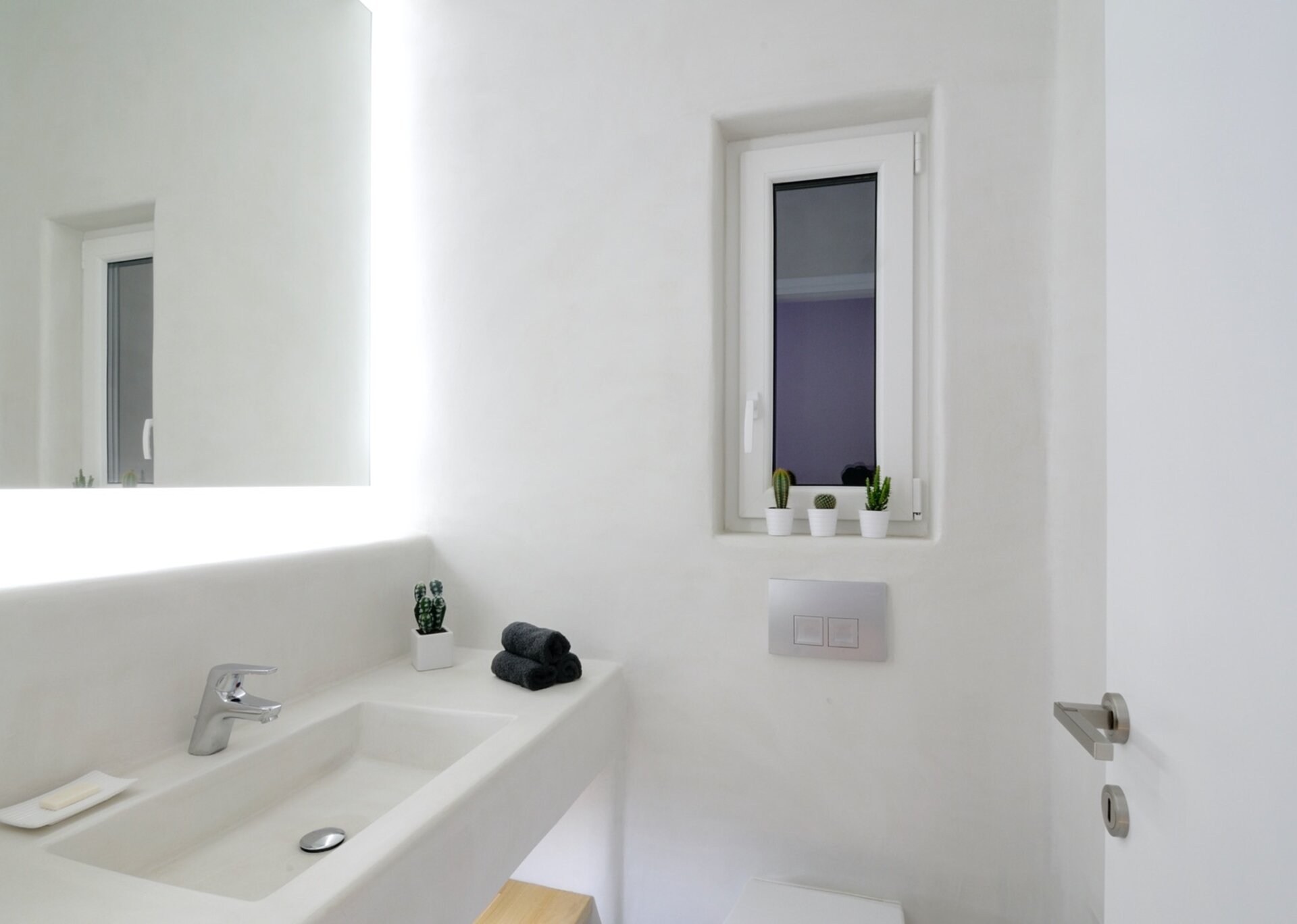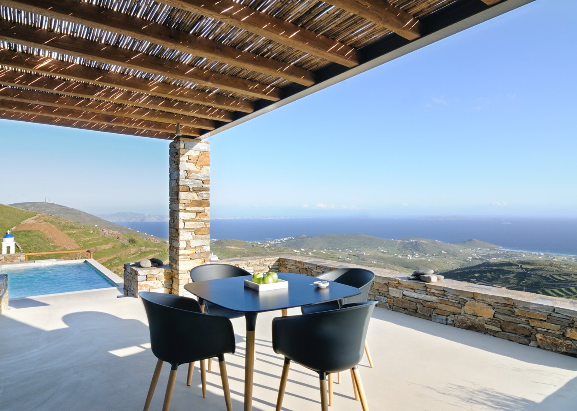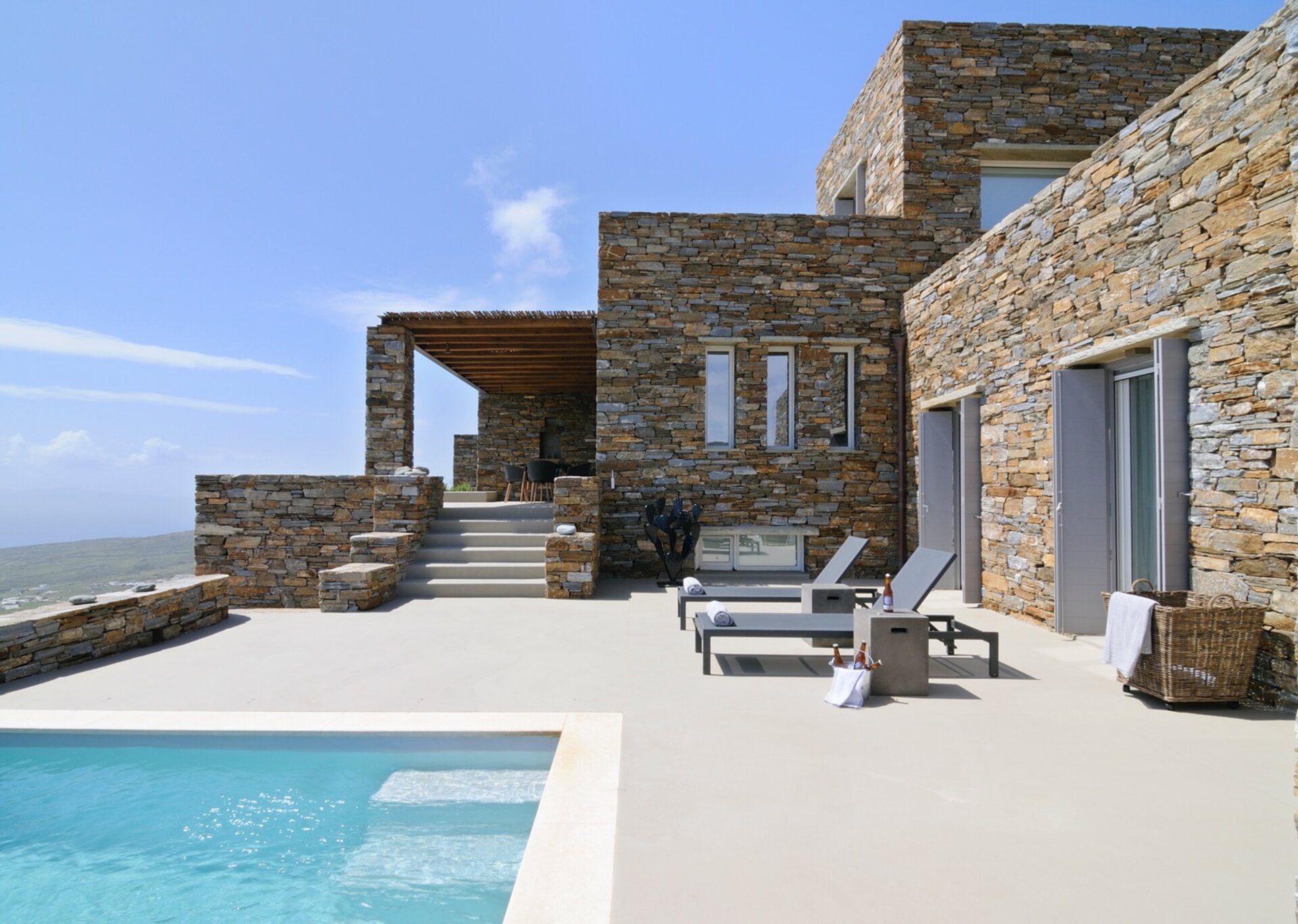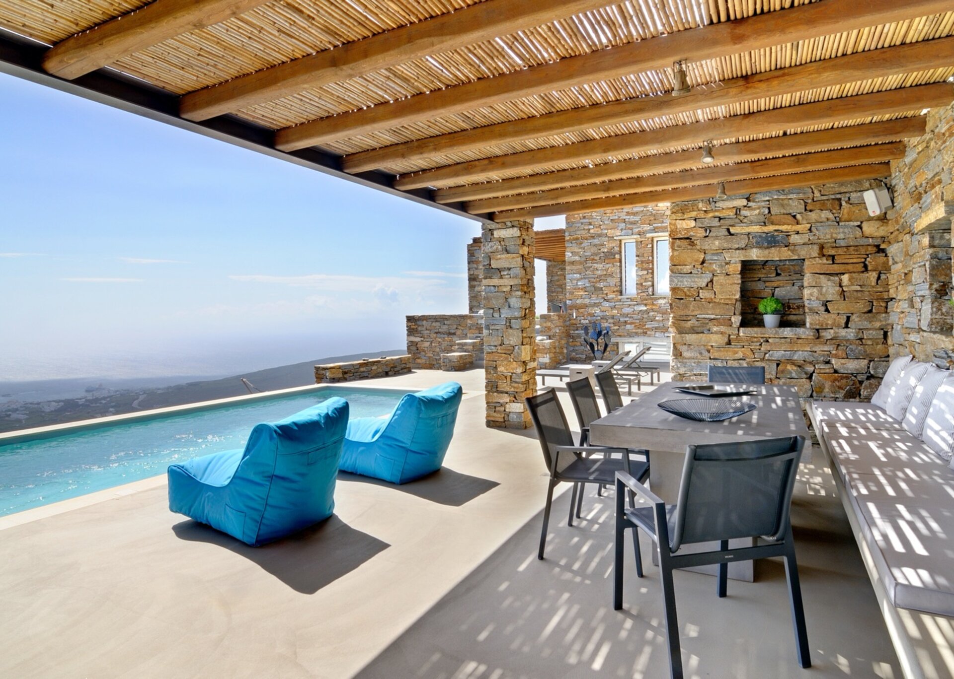 In addition to breathtaking sceneries of the captivating Aegean Sea, the villa provides its guests with a spacious and airy environment that extends to its outdoor areas. The pure white walls contrasted with polished cement flooring add a chic and minimalist touch to the villa's decor, providing guests with the ultimate atmosphere of relaxation.