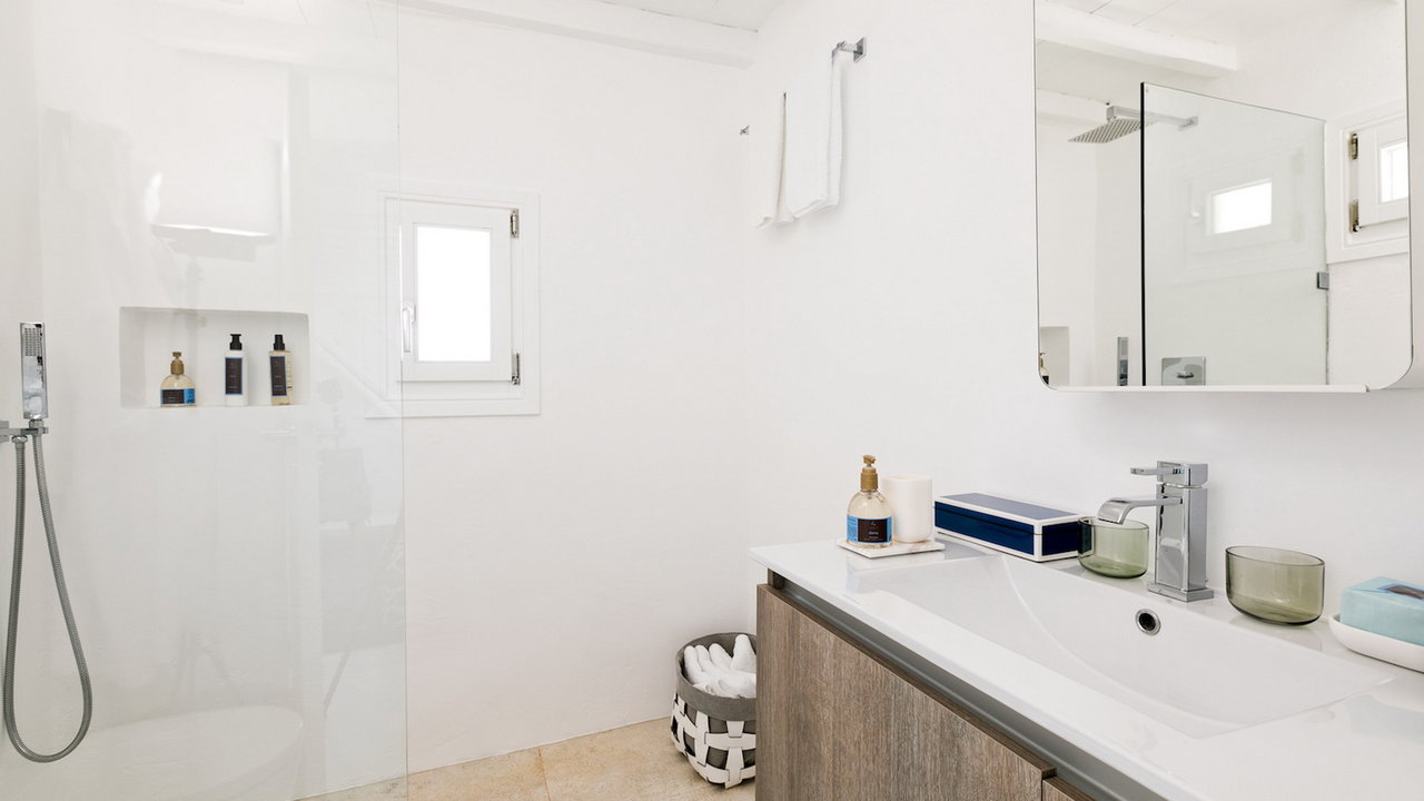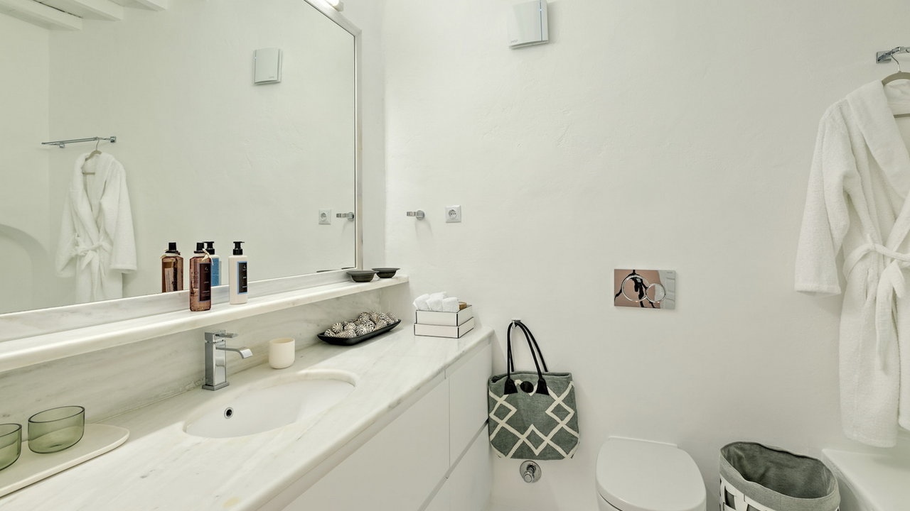 Inside the house, the mood is lavish, the decoration is elegance and the furniture is consisted of modern high end pieces. The living room has no unnecessary details, its space is ample with luxurious and comfortable sofas to chill. There is also a fully equipped kitchen and a wonderful dining area to enjoy a meal and a glass of wine with your guests.