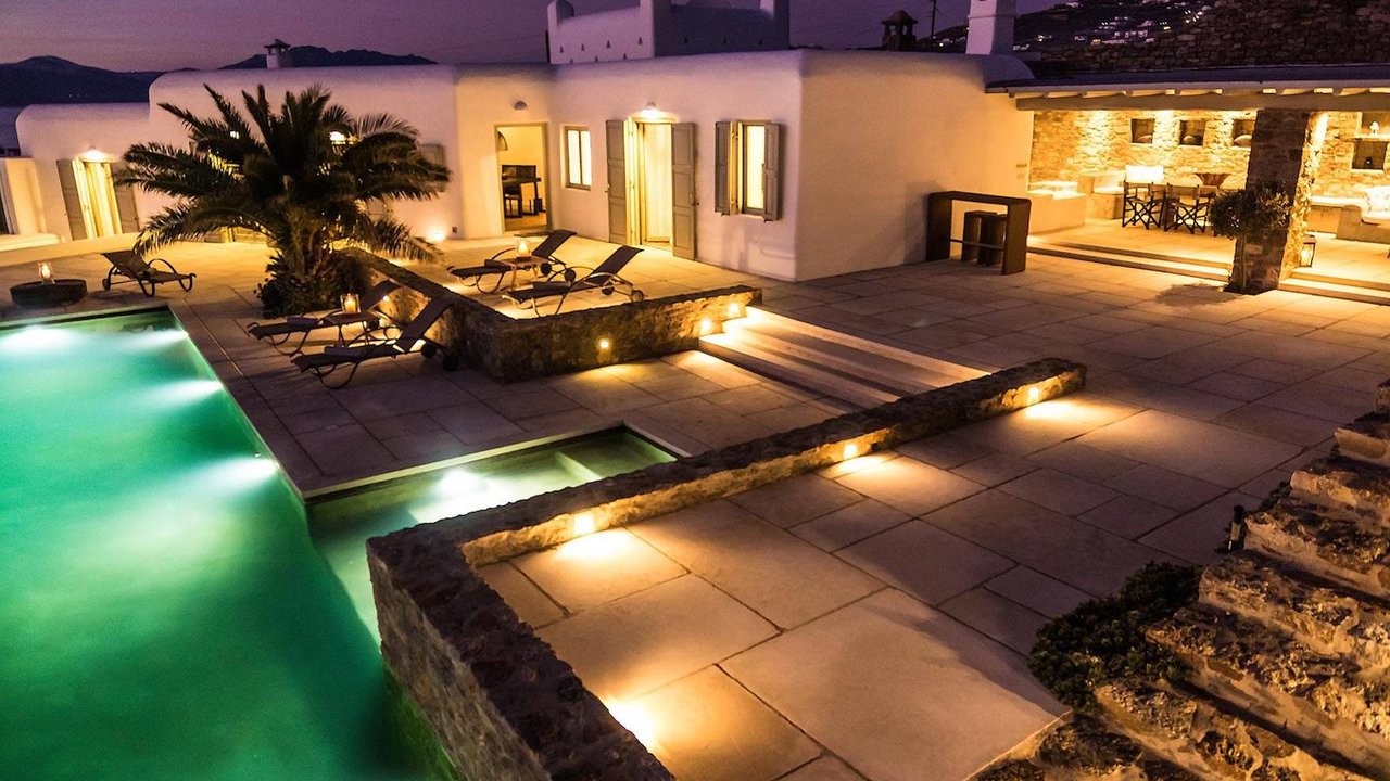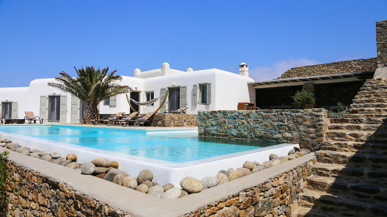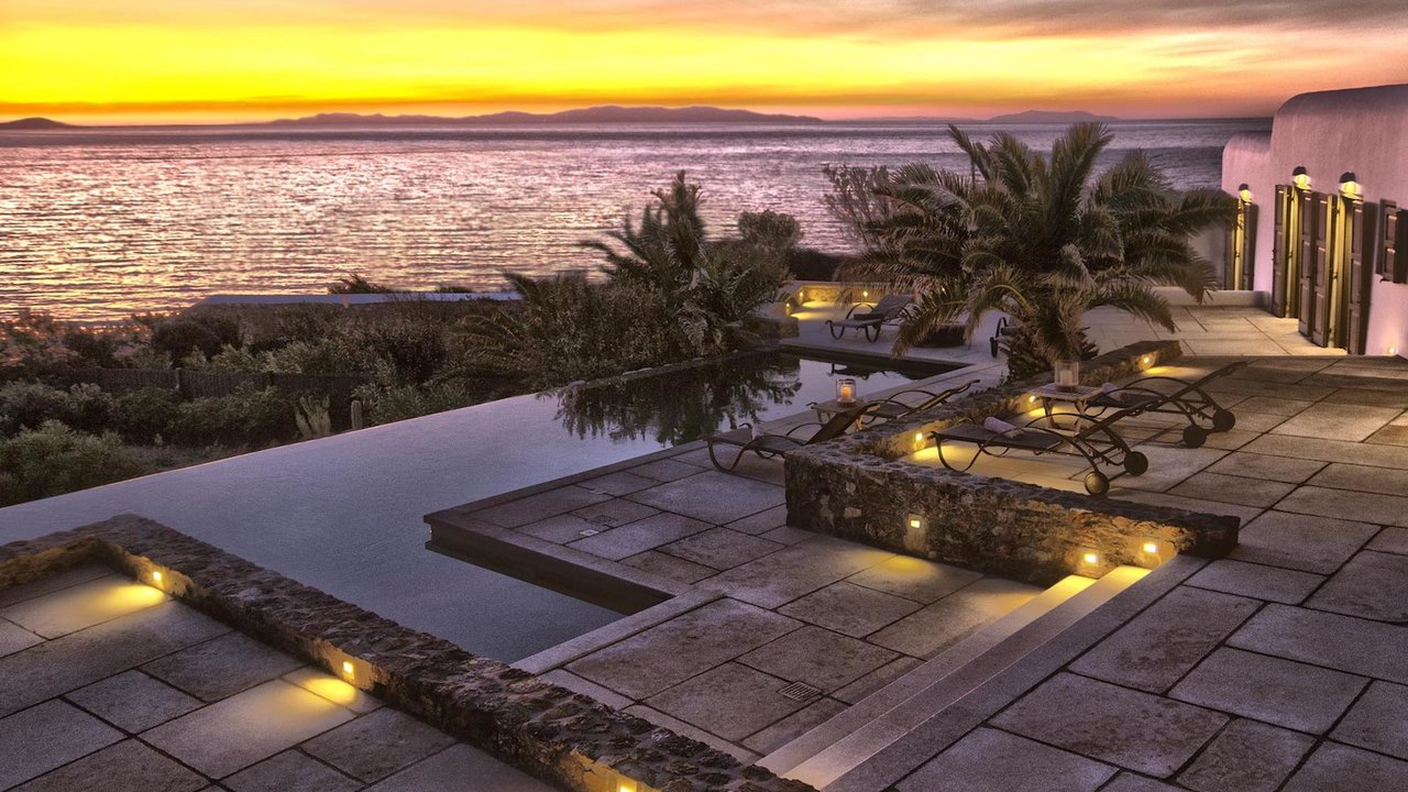 Located in Agios Stefanos in Mykonos, villa Namya is a luxurious villa that perfectly captures the ambience of the island and ensures its guests a luxurious adventure, guided through the essence of easy living. The estate is charactirized by its colorful sunset view, the panoramic azure vista of the Aegean sea, the dashing shaded outdoor terraces and its lavish mood. The outer terrace has a stunning pergola covered lounging and dining area, near to the enormous private swimming pool. During the early afternoon hours, the outer area is ideal to capture vibes and romantic moments while admiring the tangerine sunset view above the ocean. If these features weren't spoiling enough, Namya also includes a bar, BBQ, a well maintained garden, a soccer court and a private parking are for four cars.