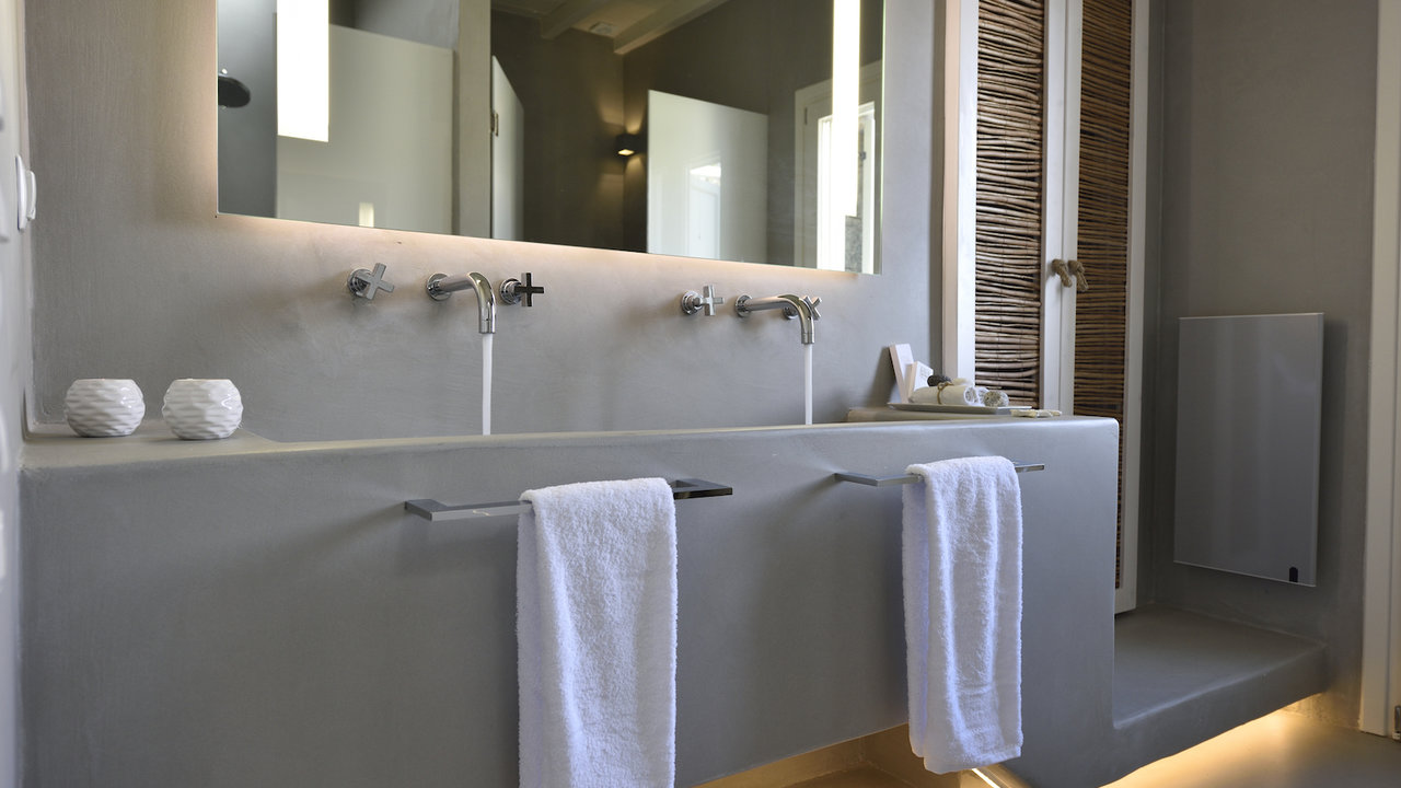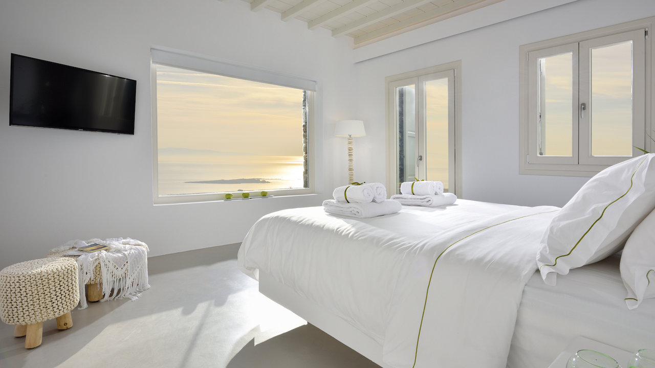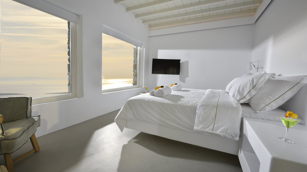 Ascending to the upper level, you'll find three generous bedrooms, each adorned with en suite bathrooms, allowing every guest to experience the pinnacle of comfort. As you step out onto the terrace, a breathtaking view unfolds before your eyes, inviting you to soak in the mesmerizing beauty of Mykonos.