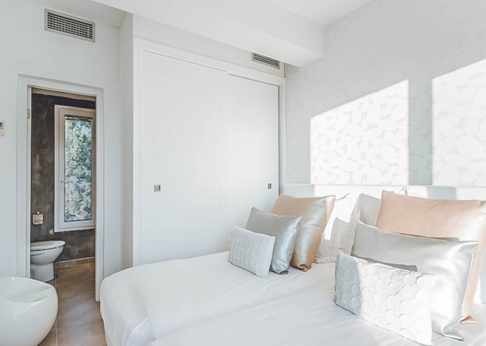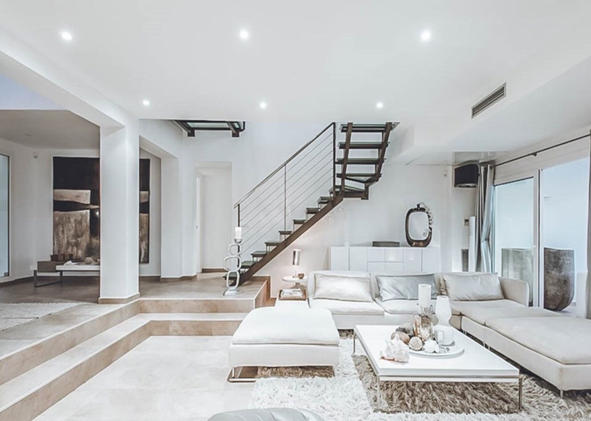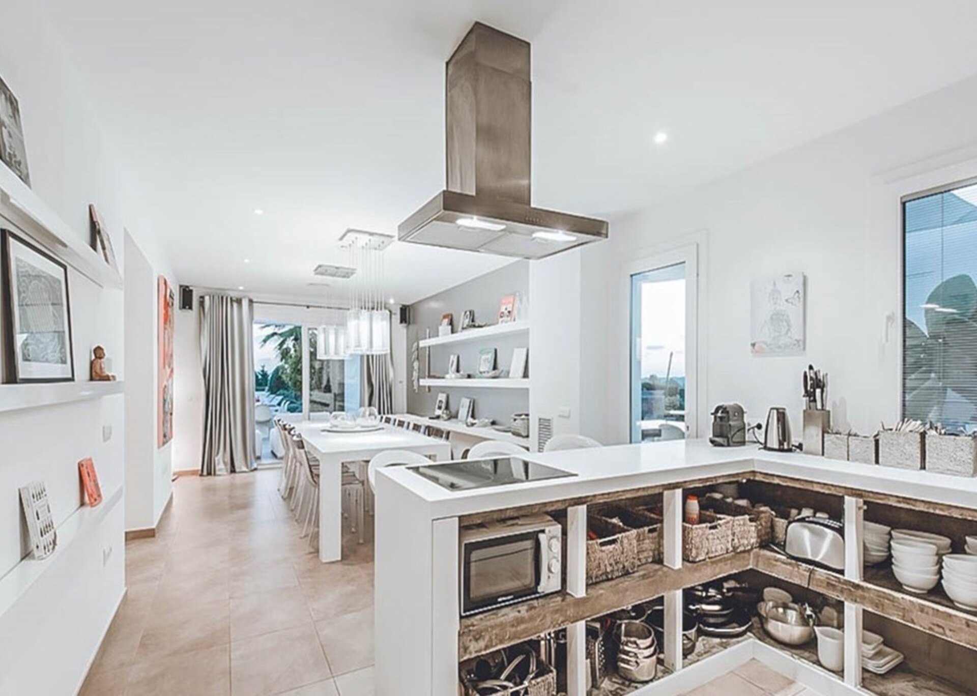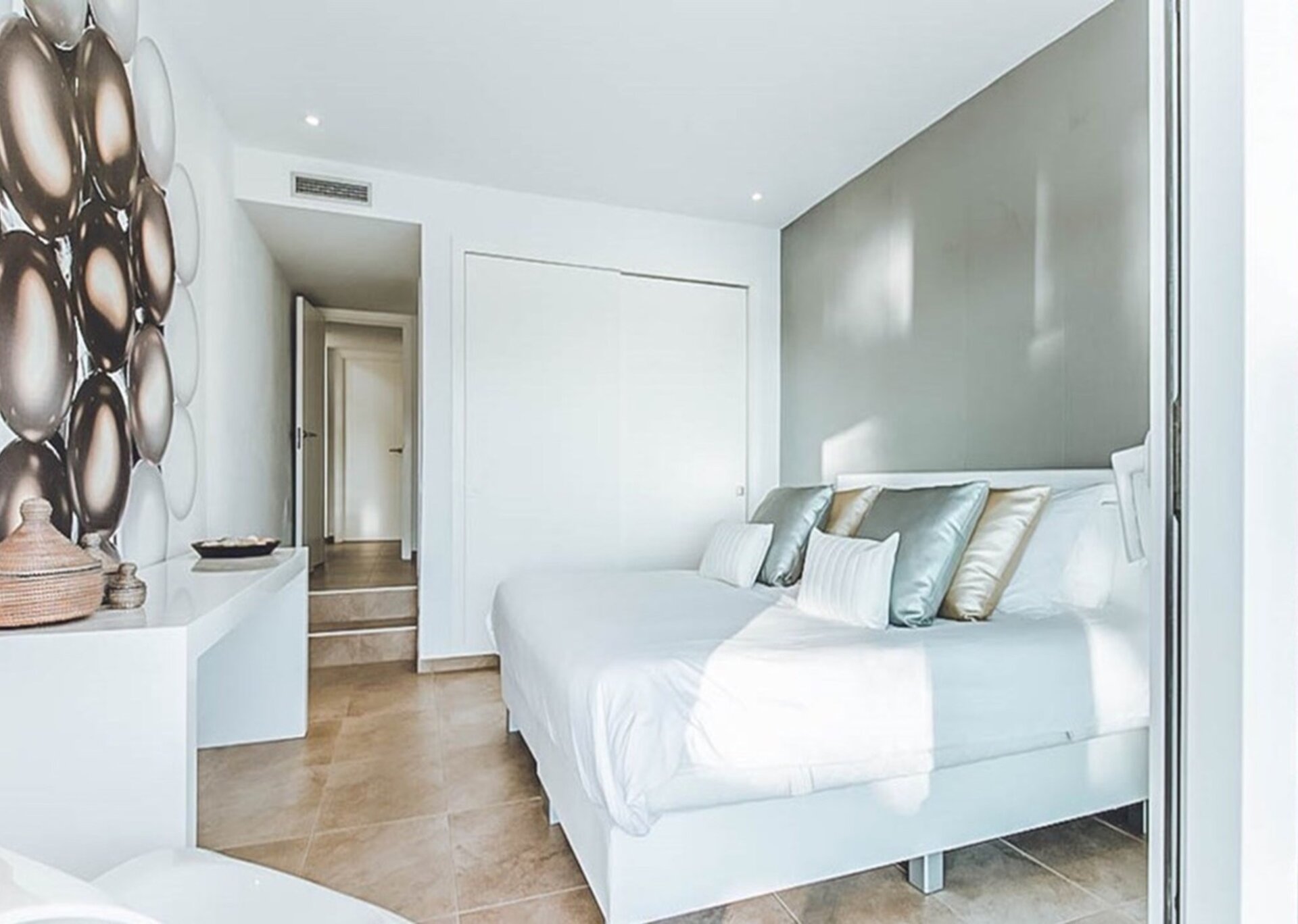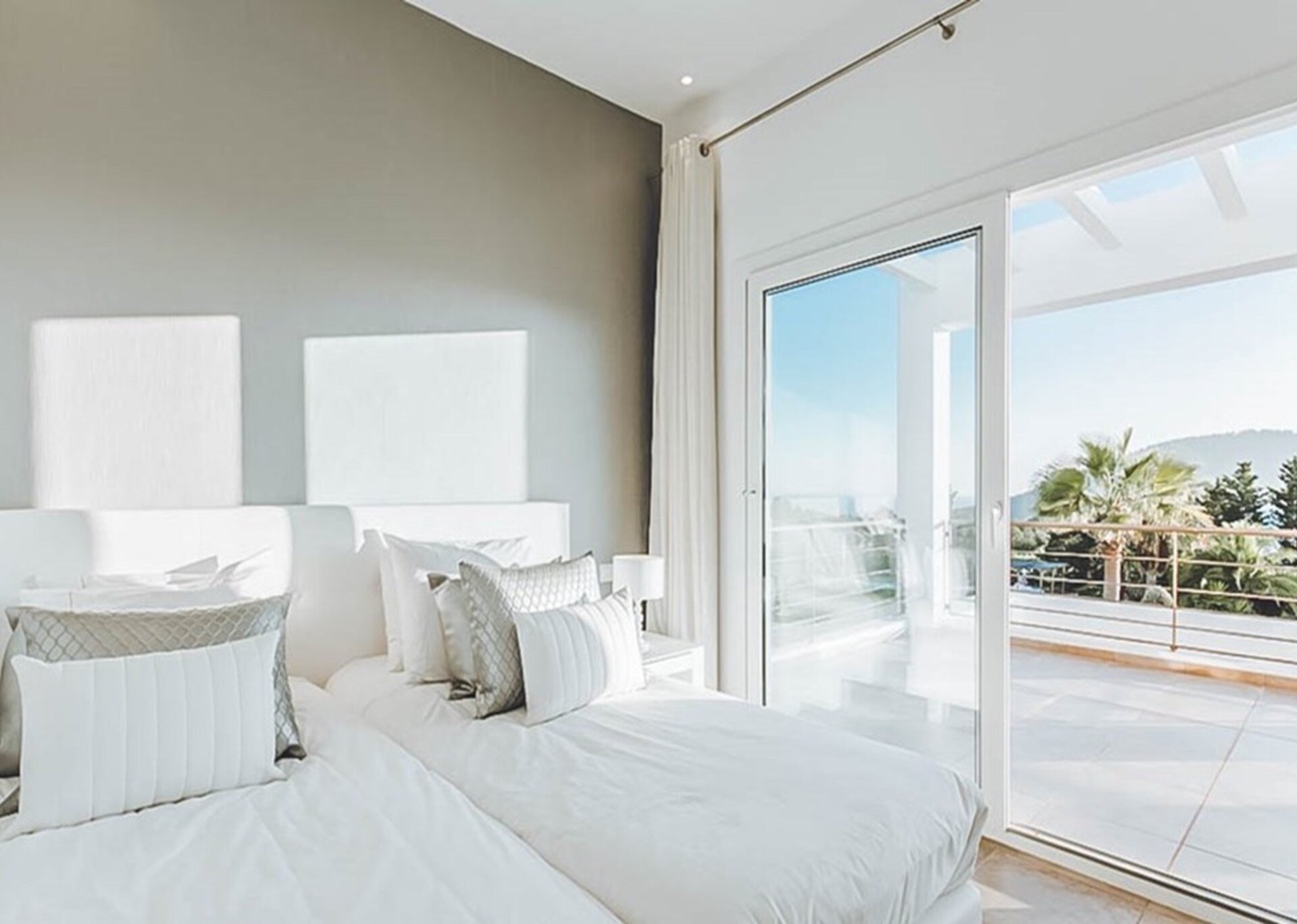 As you enter this modern, minimalist-style home, you're greeted with a spacious hall that leads into a tastefully decorated living room. The room is bathed in glorious Ibizan sunlight, thanks to the floor-to-ceiling sliding glass doors that showcase the unrivaled sea views. Every detail in this sophisticated villa has been carefully attended to, ensuring your comfort and luxury.
