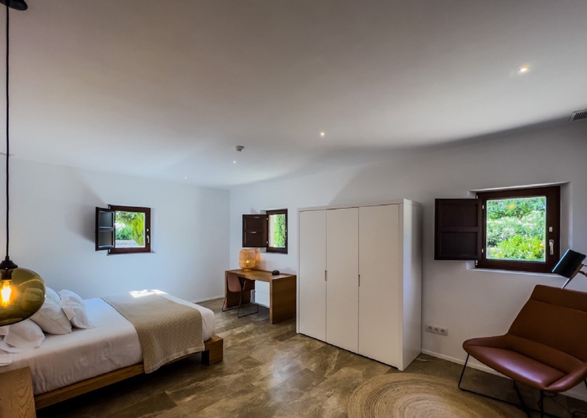 This exquisite property showcases the quintessential architecture of an Ibizan country house, with its pristine white walls, lofty ceilings, and spacious rooms that emanate a captivating ambiance. It effortlessly combines exclusivity, comfort, and nature, resulting in a remarkable sanctuary nestled in the heart of Ibiza.