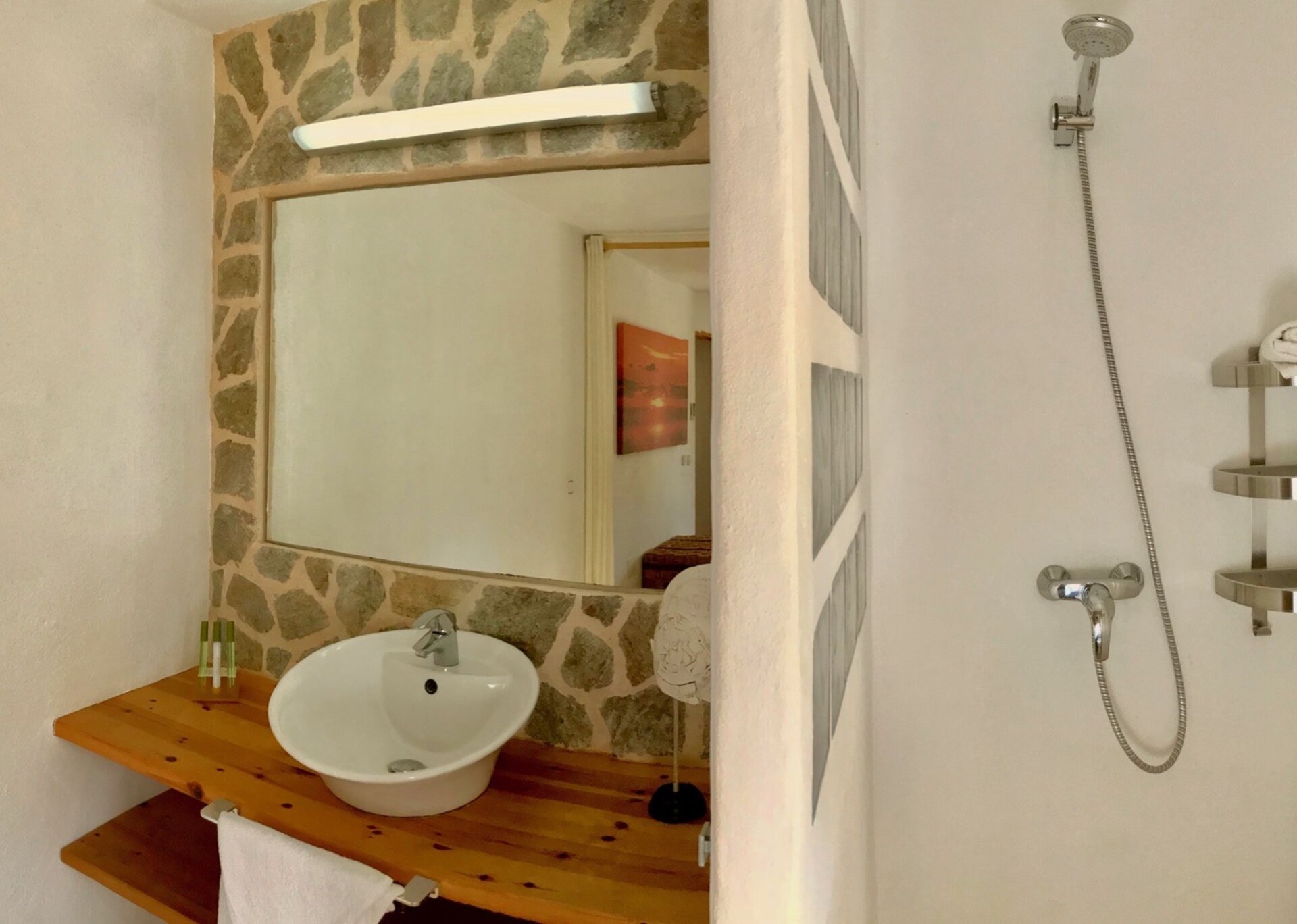 The inviting pool is surrounded by a terrace, complete with a spacious solarium area and adorned with teak sun loungers and parasols. Noir offers 220 m² of living space, complemented by 2,500 m² of terraces and gardens. All of this is set on an expansive estate spanning over 10 hectares of forest and terraced land.