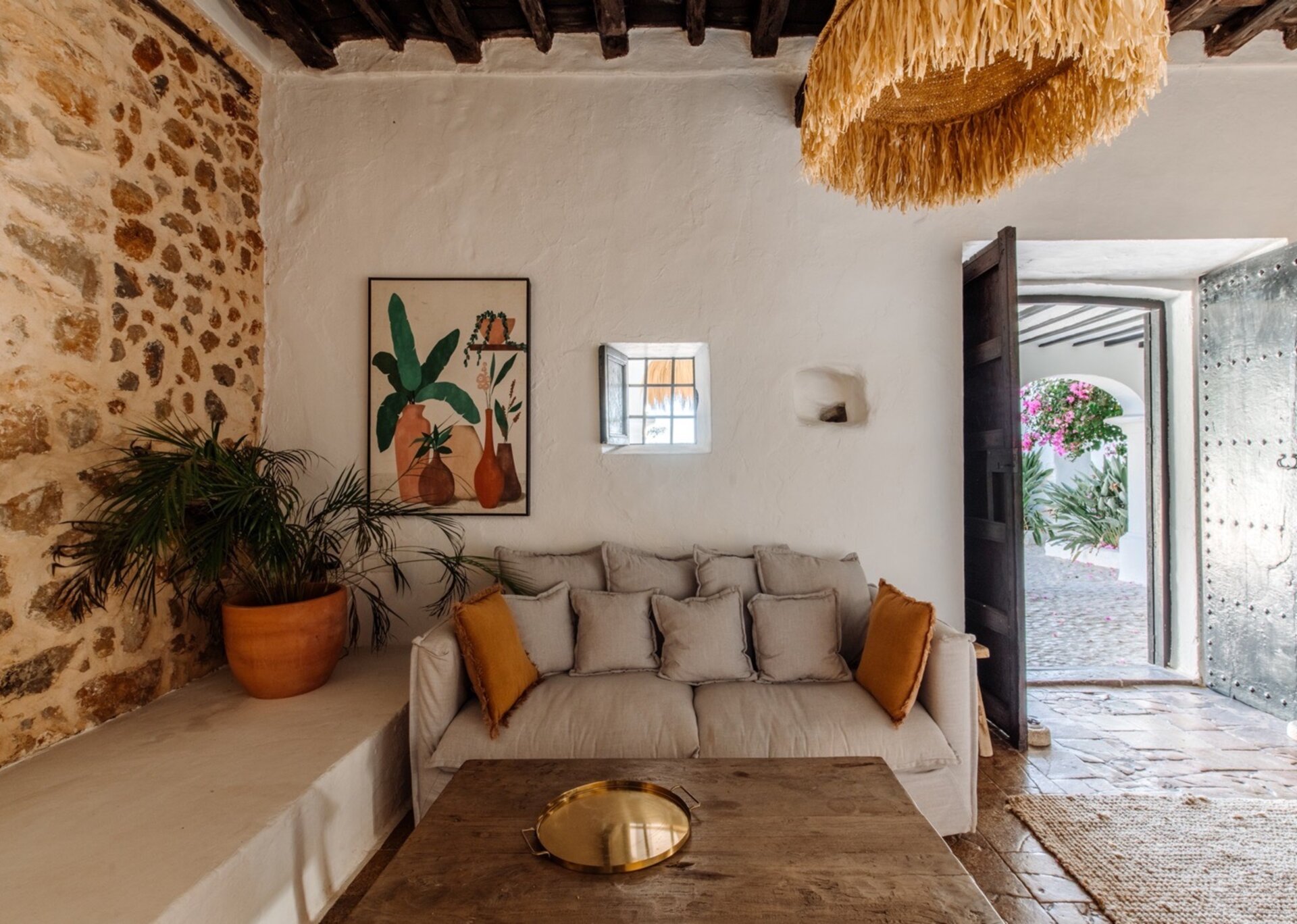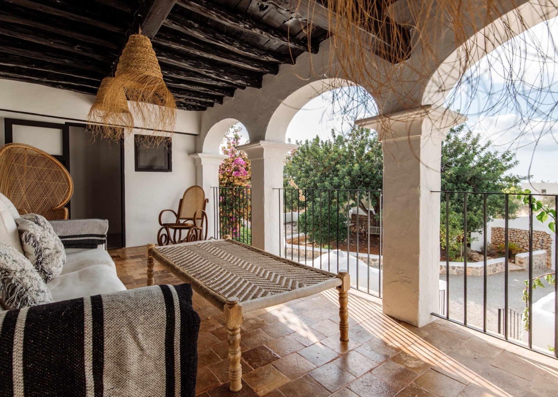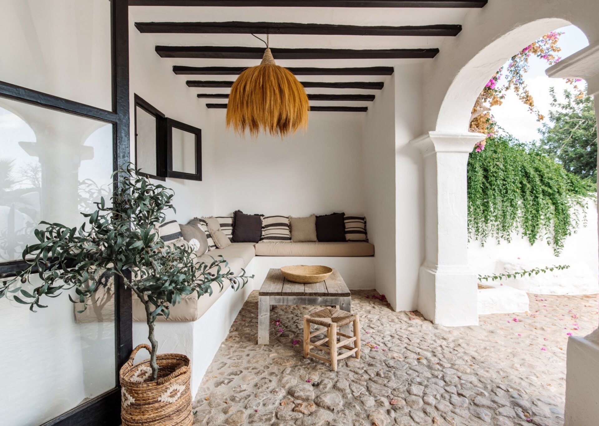 True to Ibicencan architecture, the house boasts six stone arches at the front and a stunning facade covered in vibrant pink bougainvillea.