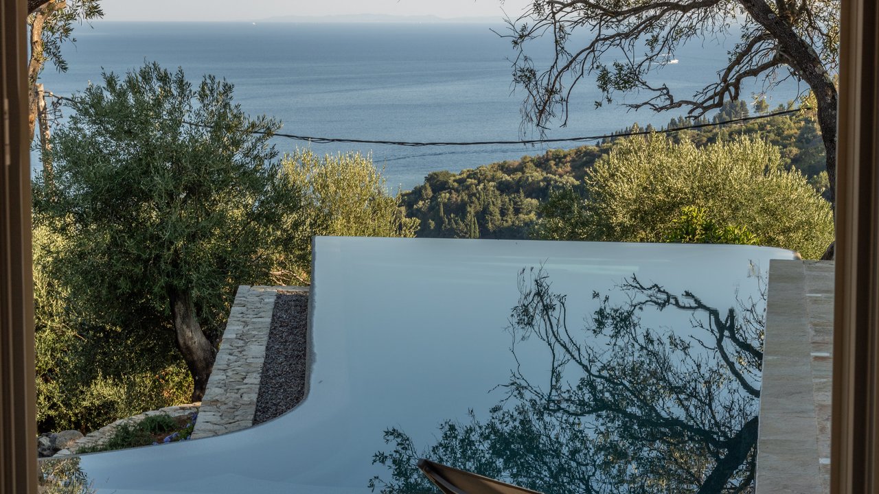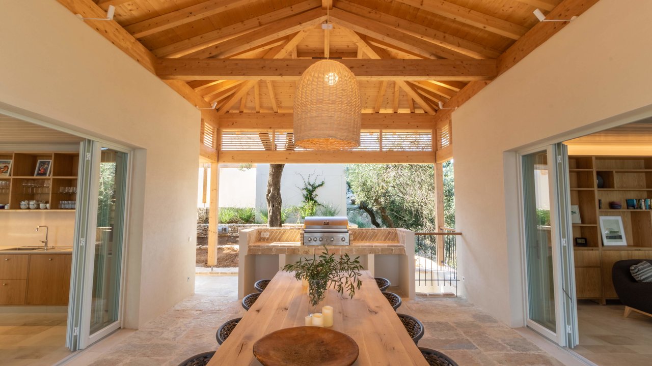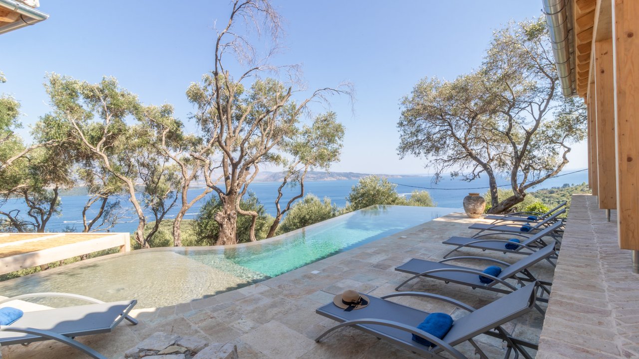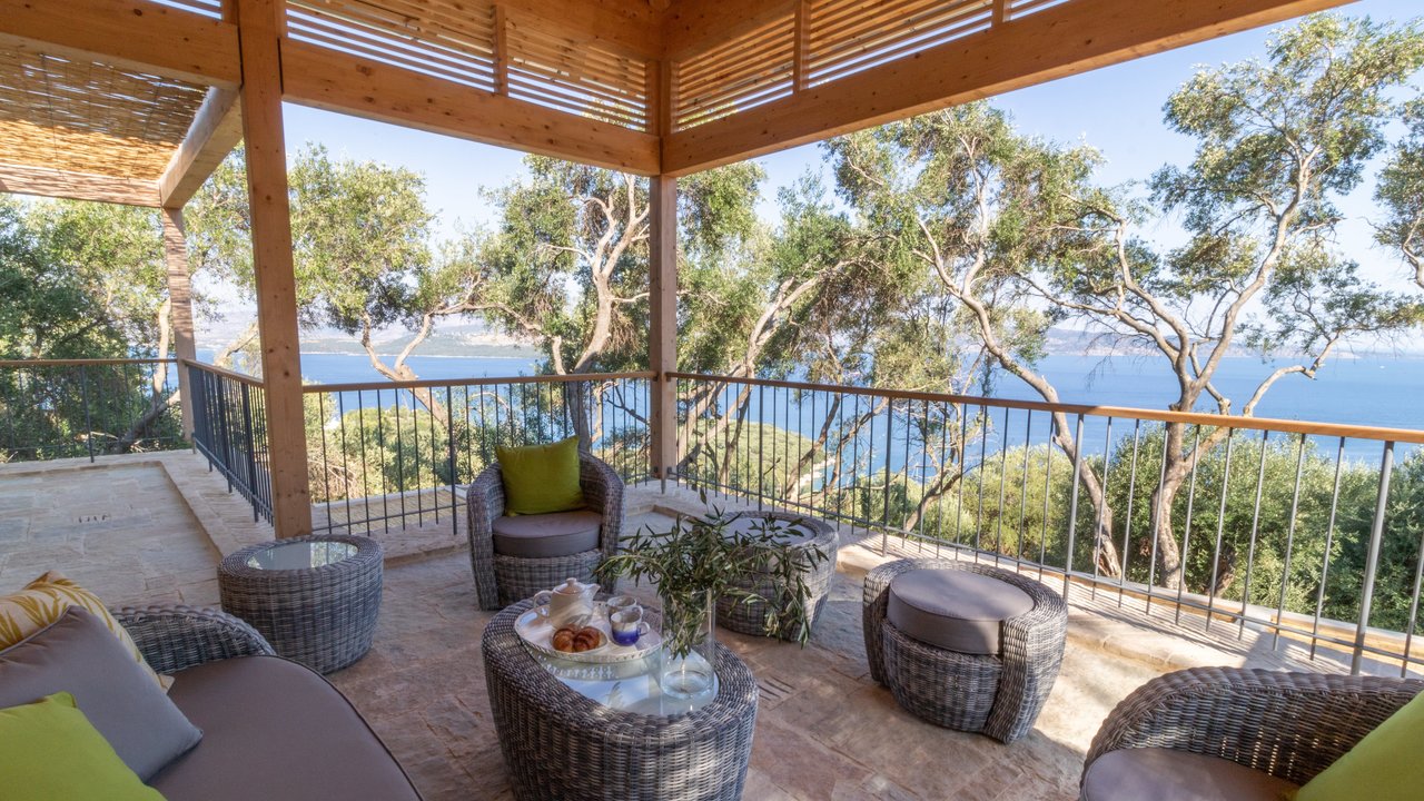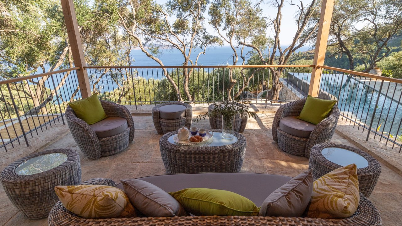 Enjoy the covered outdoor living and dining room with the view extending over the Ionian Sea from the large infinity pool.