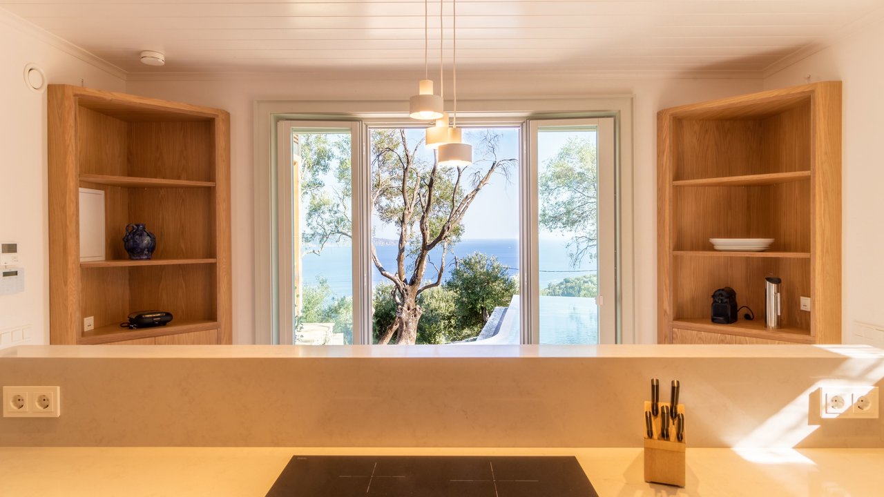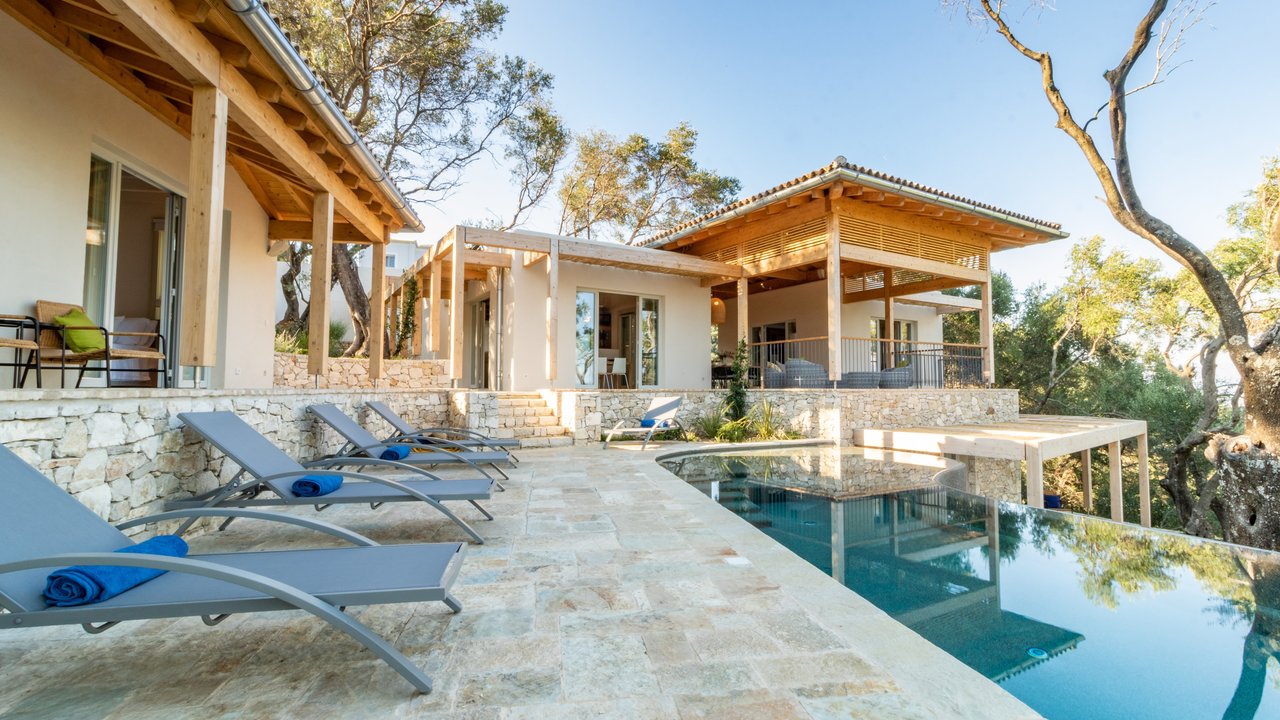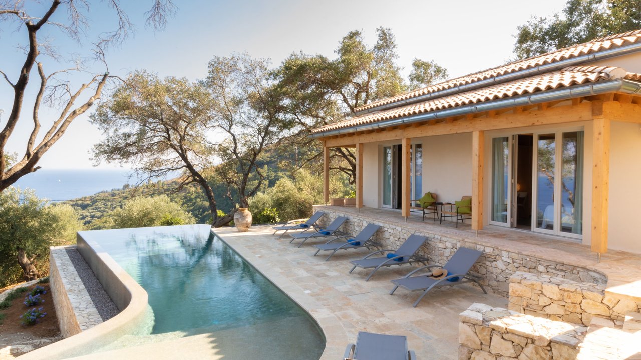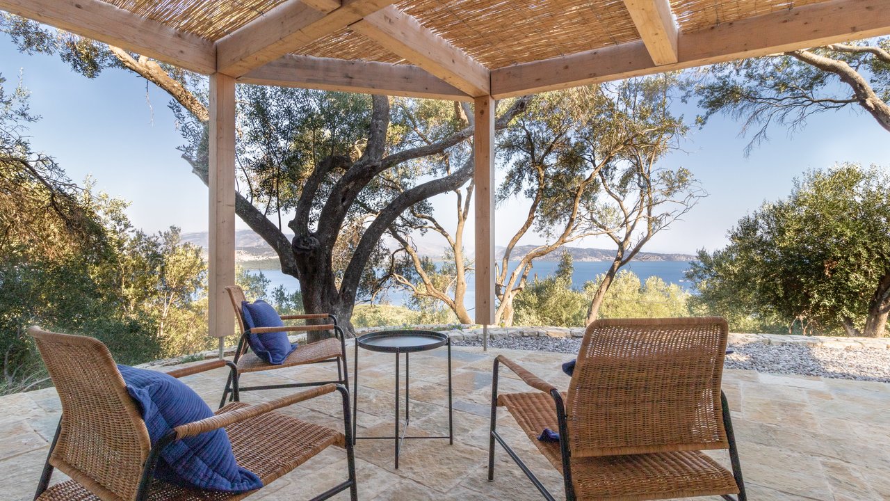 Enjoy the covered outdoor living and dining room with the view extending over the Ionian Sea from the large infinity pool.