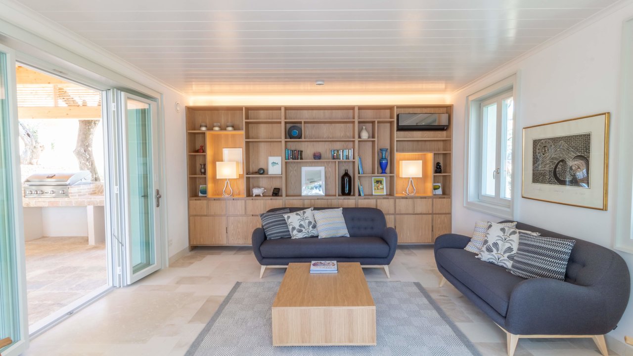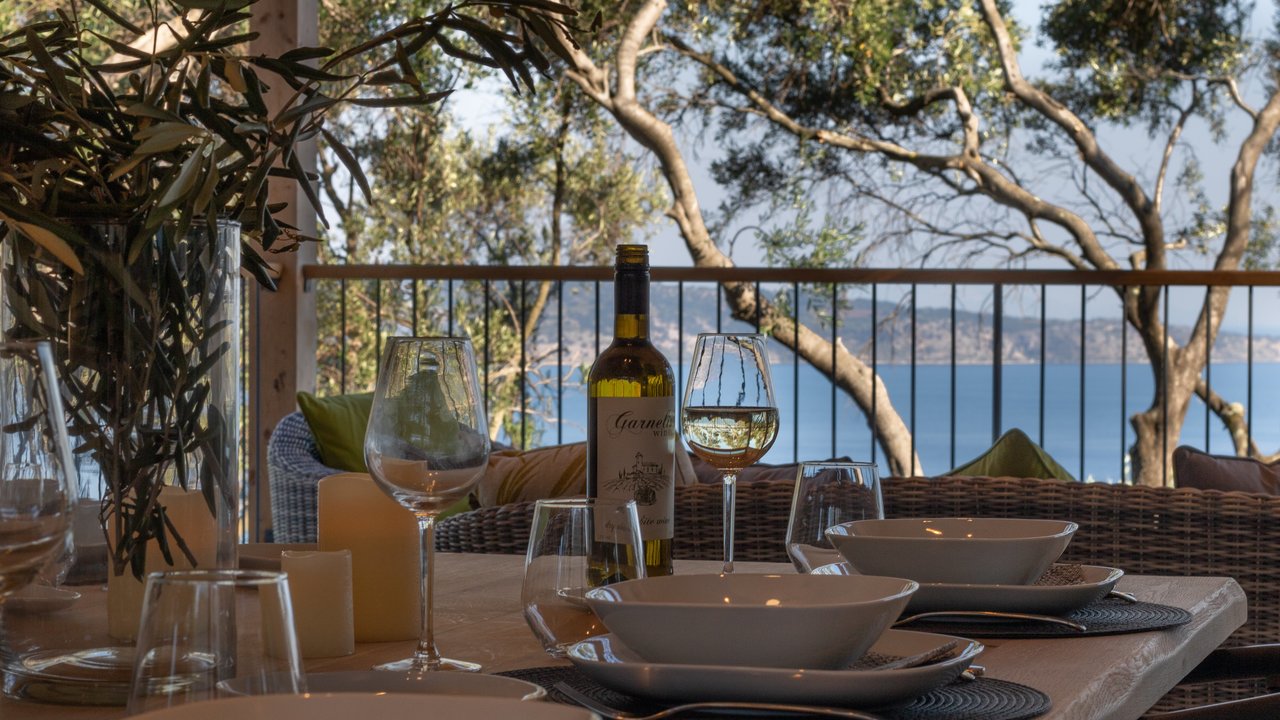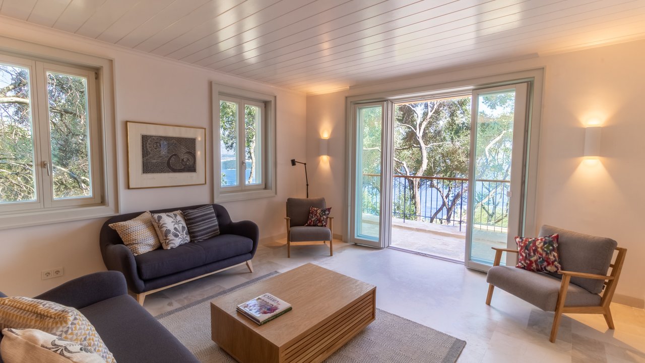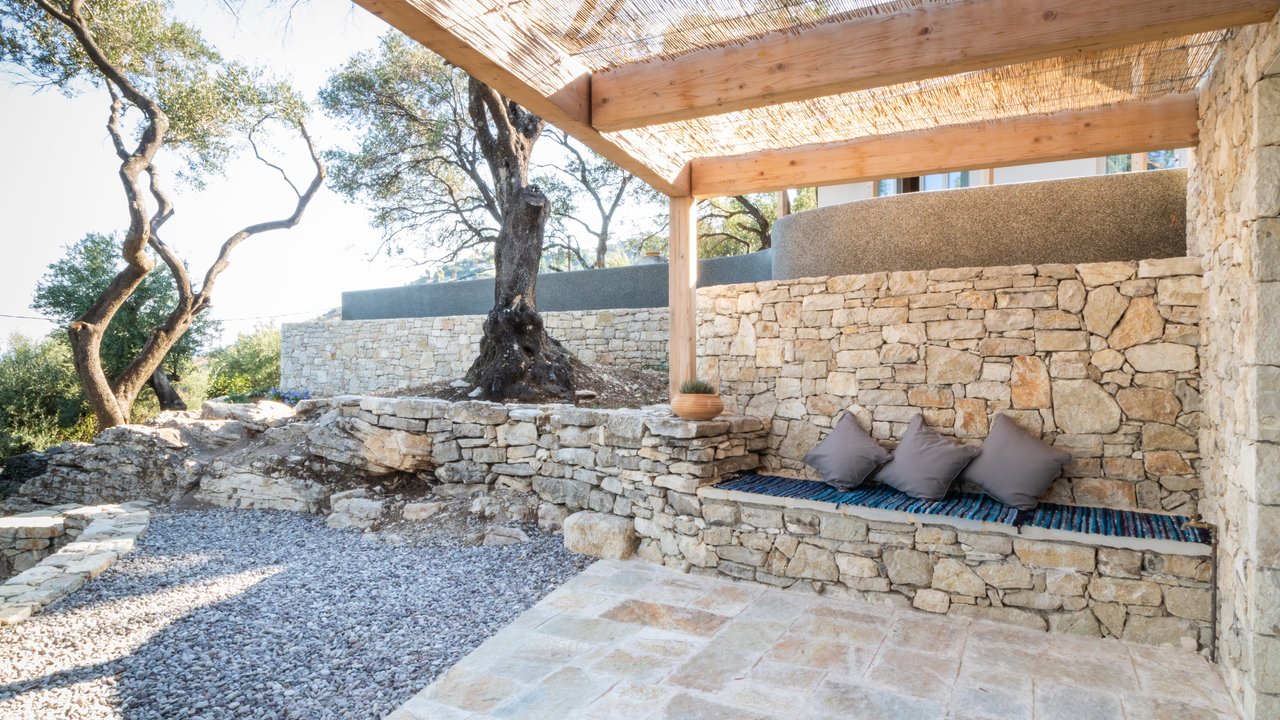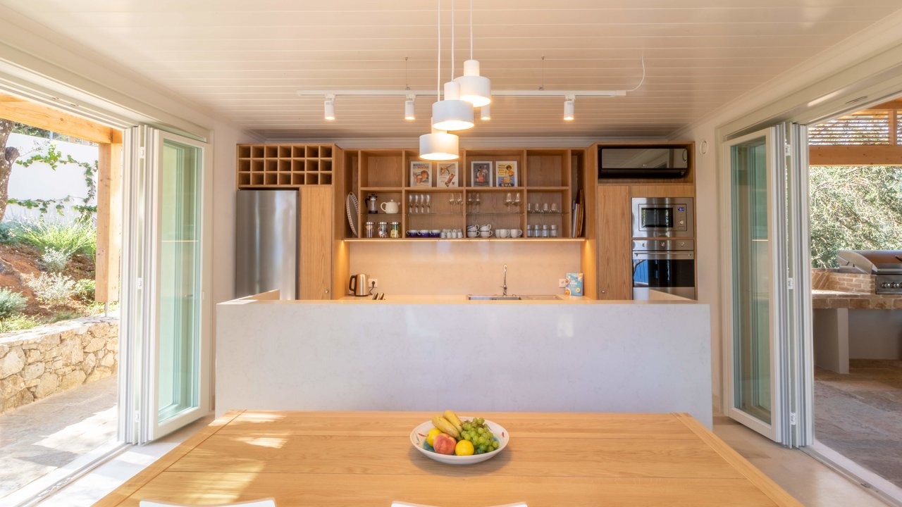 Enjoy the covered outdoor living and dining room with the view extending over the Ionian Sea from the large infinity pool.