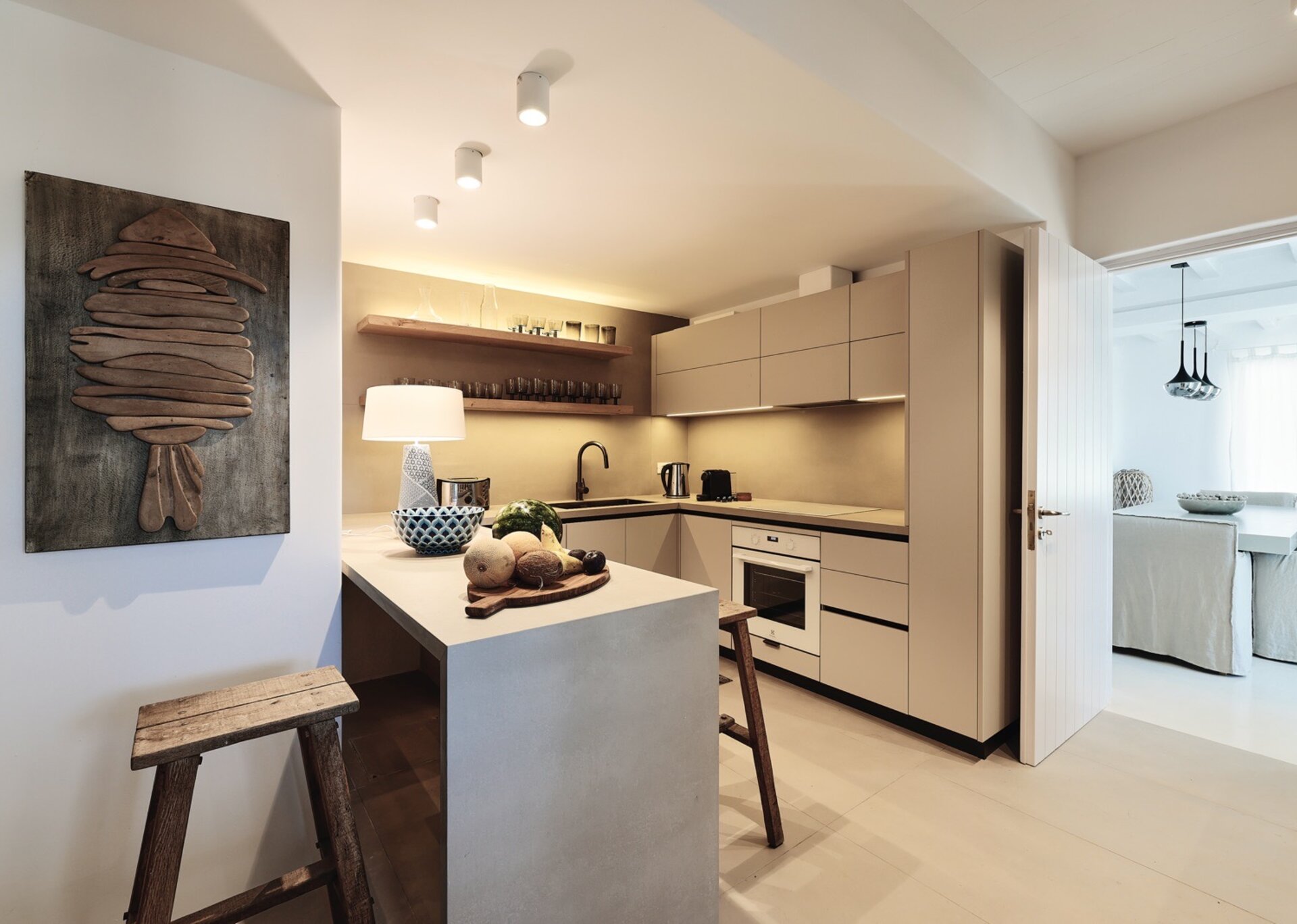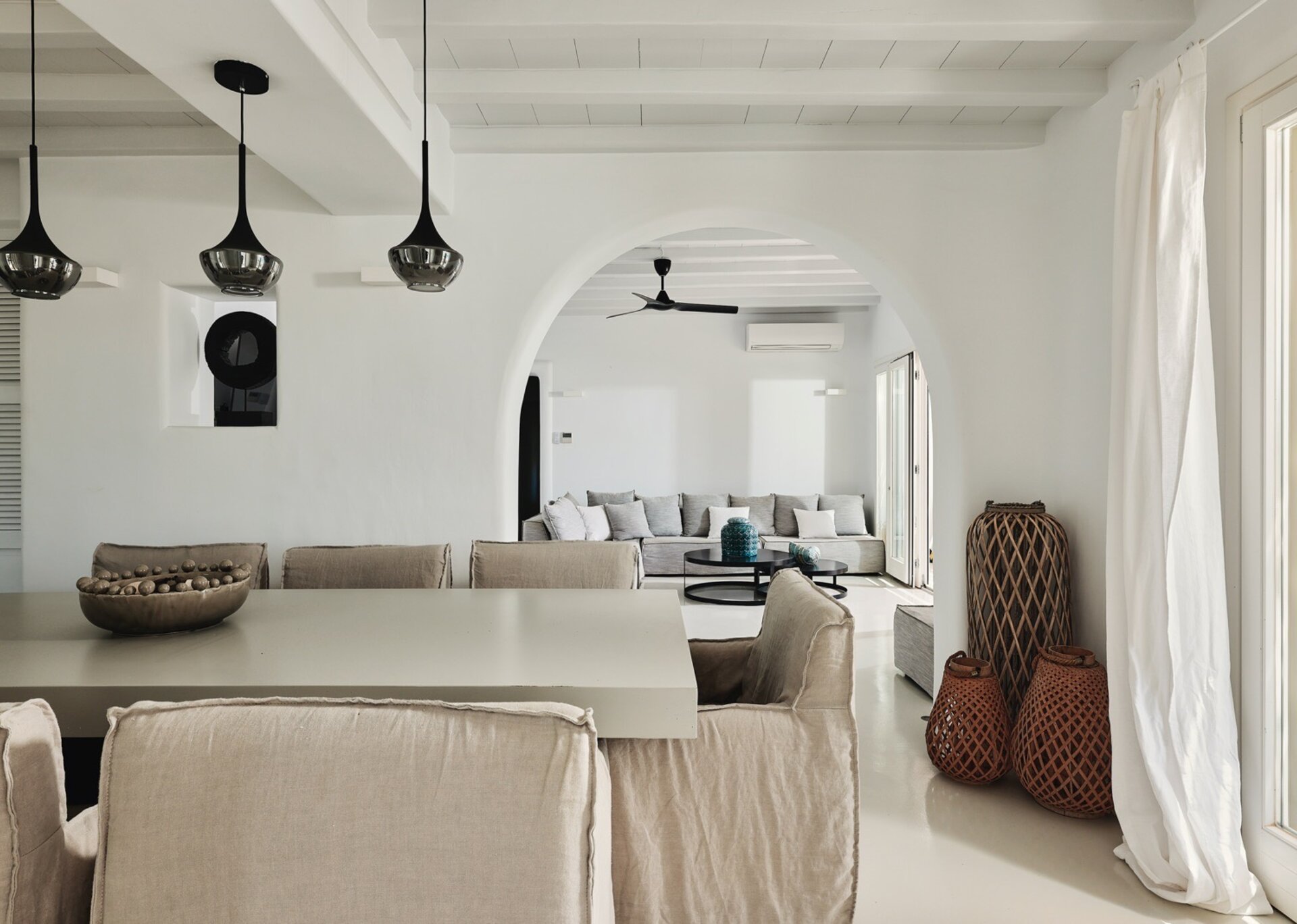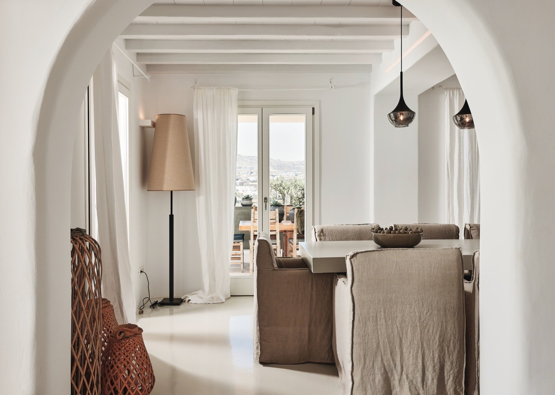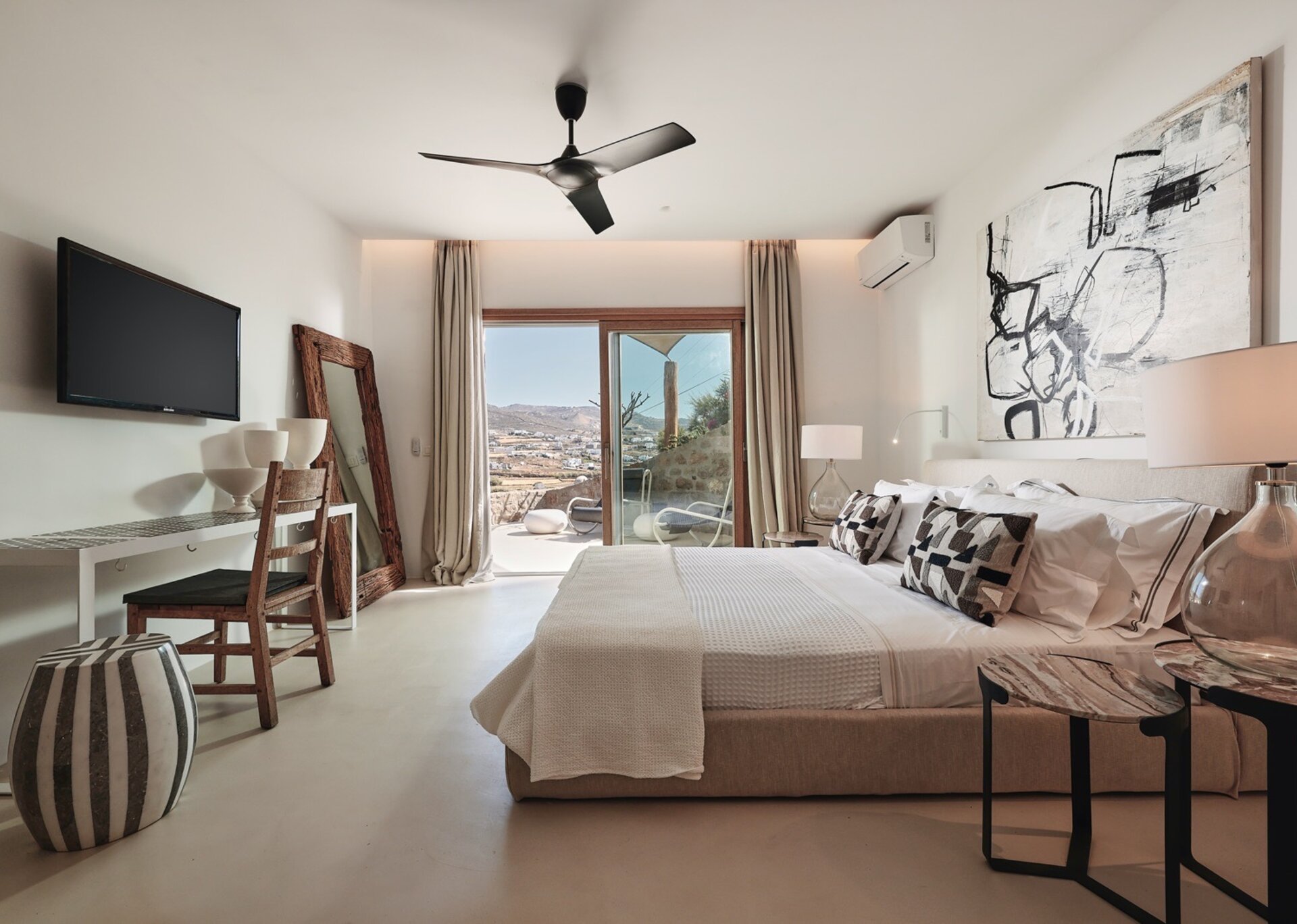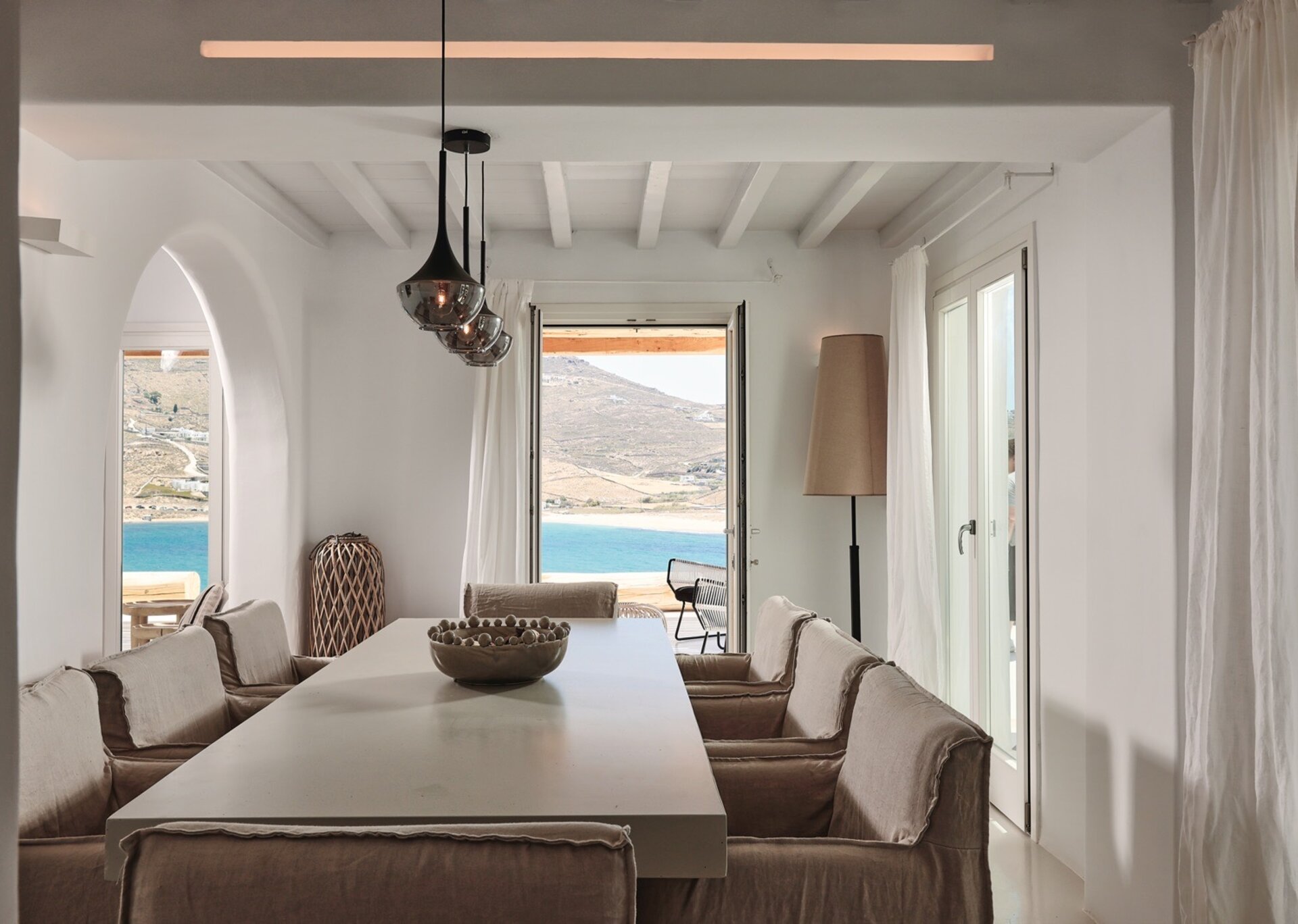 This residence has a tasteful decoration and a traditional Mykonian architecture. It is designed modernly and furnished with high end luxurious pieces. The interior of the house is sumptuous, the mood is lavish and the vibe is cozy. The living room has comfortable big sofas to chill there and enjoy the summertime's carefree atmosphere and the dining room is luxurious and perfect for the family to reunite and capture some romantic moments. Each room is fully featured with numerous amenities like A/C, an espresso machine and Wi-Fi internet. Ophelia can easily house up to 10 guests in 5 fully featured and spacious bedrooms.