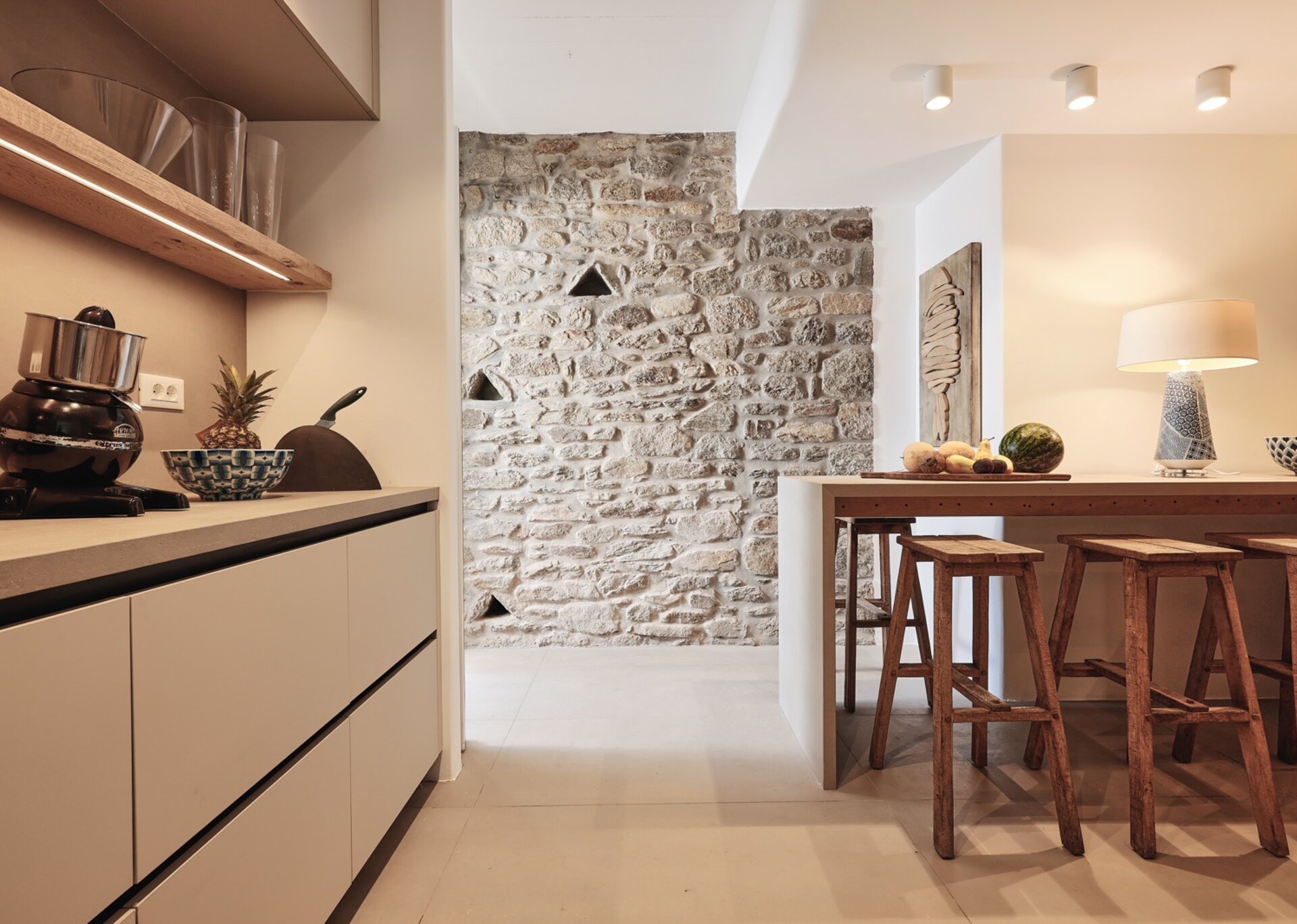 The outside of the house is dashing and spacious, with a large infinity pool with direct sea view, a wonderful dining area near the pool and an outer BBQ area. There are several lounging spots and sunbeds on the outside of the property that are ideal to relax and feel the soothing Cycladic atmosphere. Also, there is a spacious parking for your guest's vehicles.