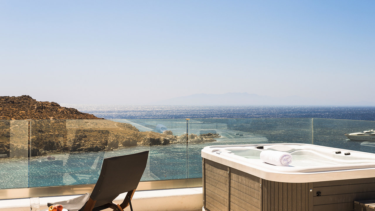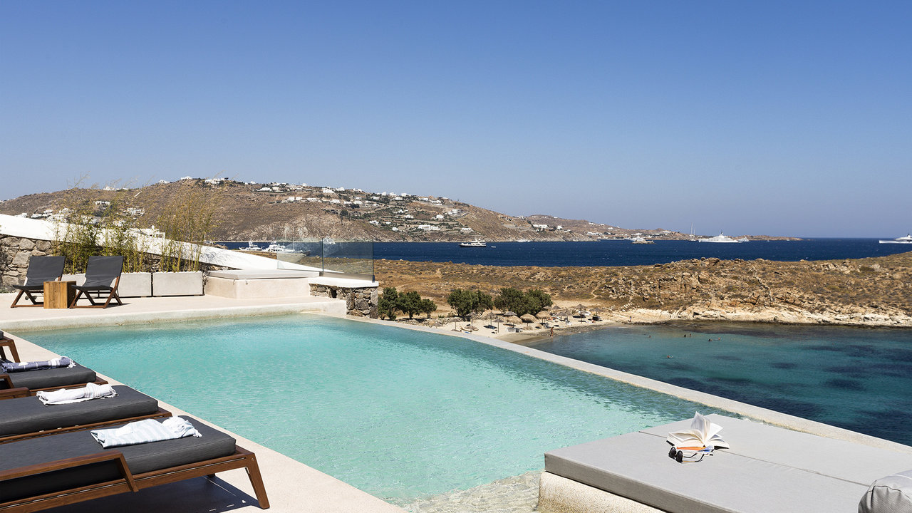 The villa expands on 3 levels and features 6 en suite double bedrooms (out of which the 2 are masters), 7 bathrooms, an extensive living room and 2 open plan kitchens, and may comfortably accommodate up to 12 guests. Villa Pandora is elegantly furnished and decorated with warm, welcoming colors and boasts multiple indoor and outdoor dining and sitting areas, a private infinity pool with an "island" lounge spot, an outdoor Jacuzzi and an outdoor fire pit which creates the perfect focal point from which guests may enjoy the astounding panoramic sea views. Another highlight of this villa is the small isolated beach which is located right below the property's main terrace and guests may freely visit at a two minutes’ walk while the organized beach of Agios Ioannis, the famous Ornos area and the centre of Mykonos are but a few minutes away!