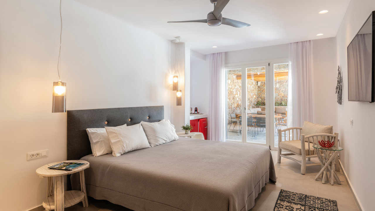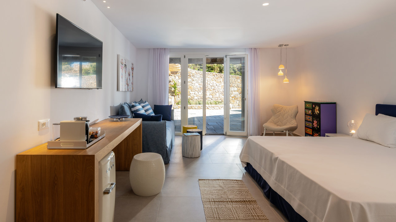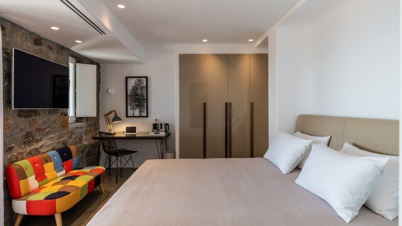 - Double bedroom with king-size bed, small Smeg fridge, office desk, sofa, and en-suite bathroom with shower