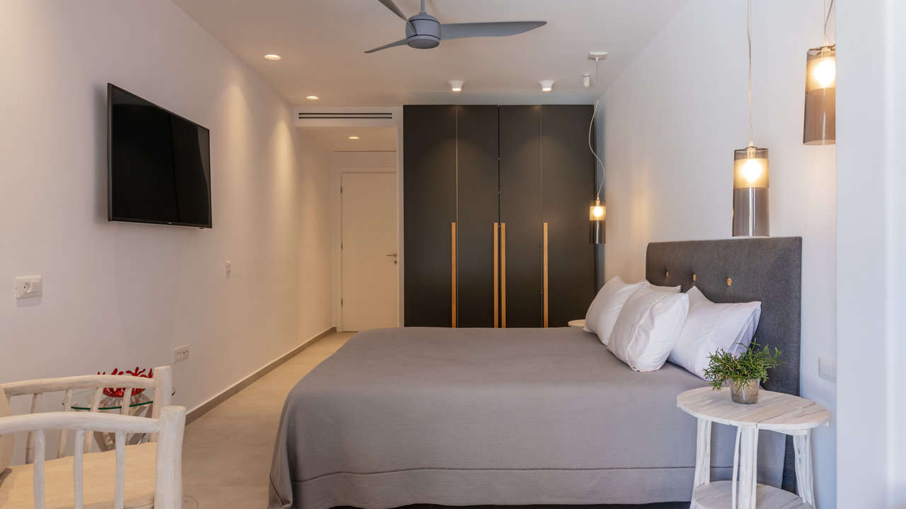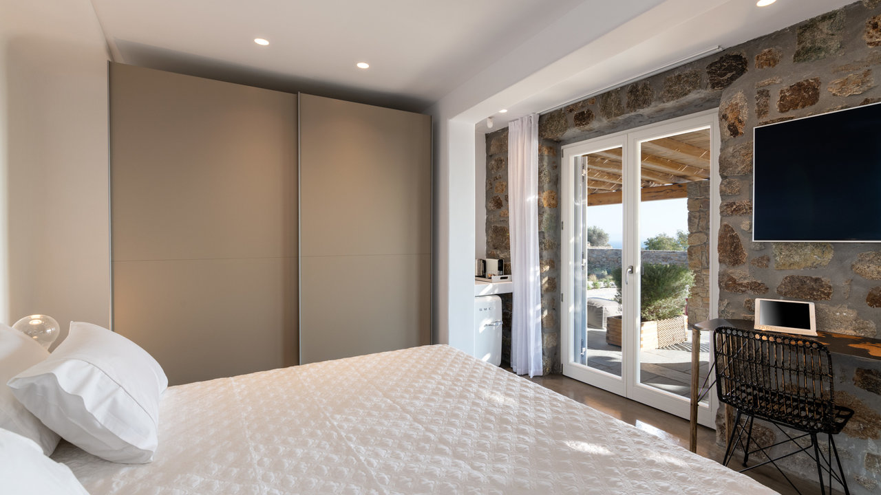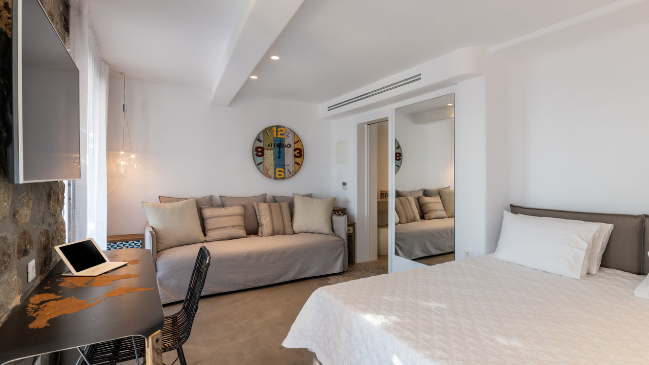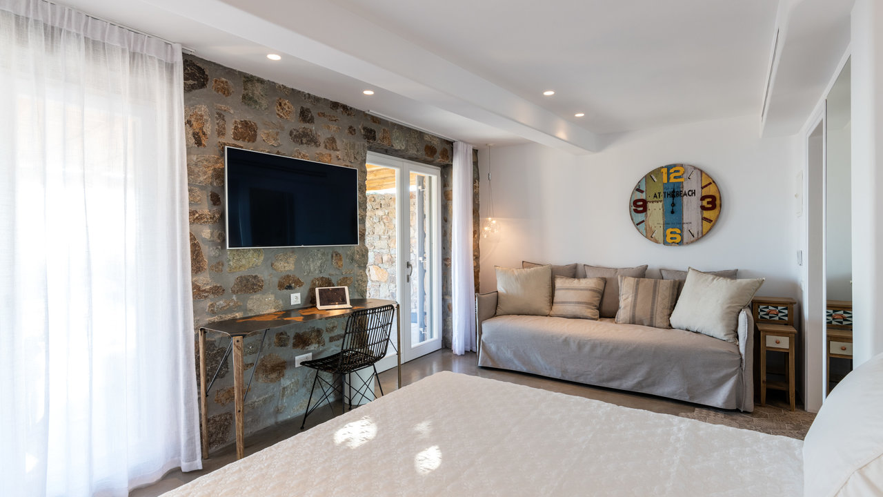 - Double bedroom with king-size bed, small Smeg fridge, office desk, sofa, and en-suite bathroom with shower