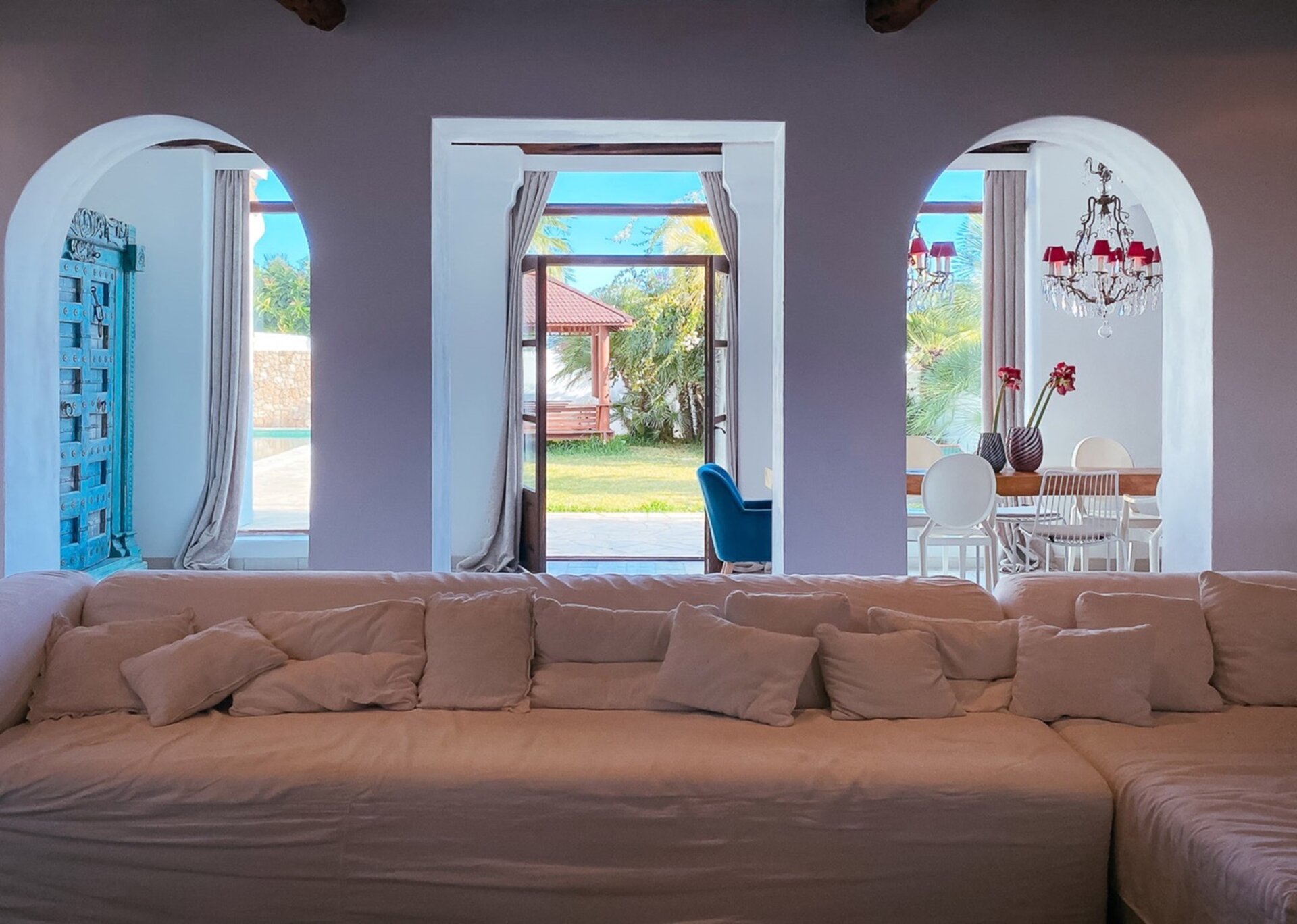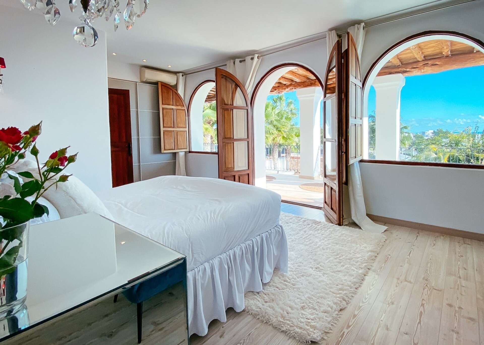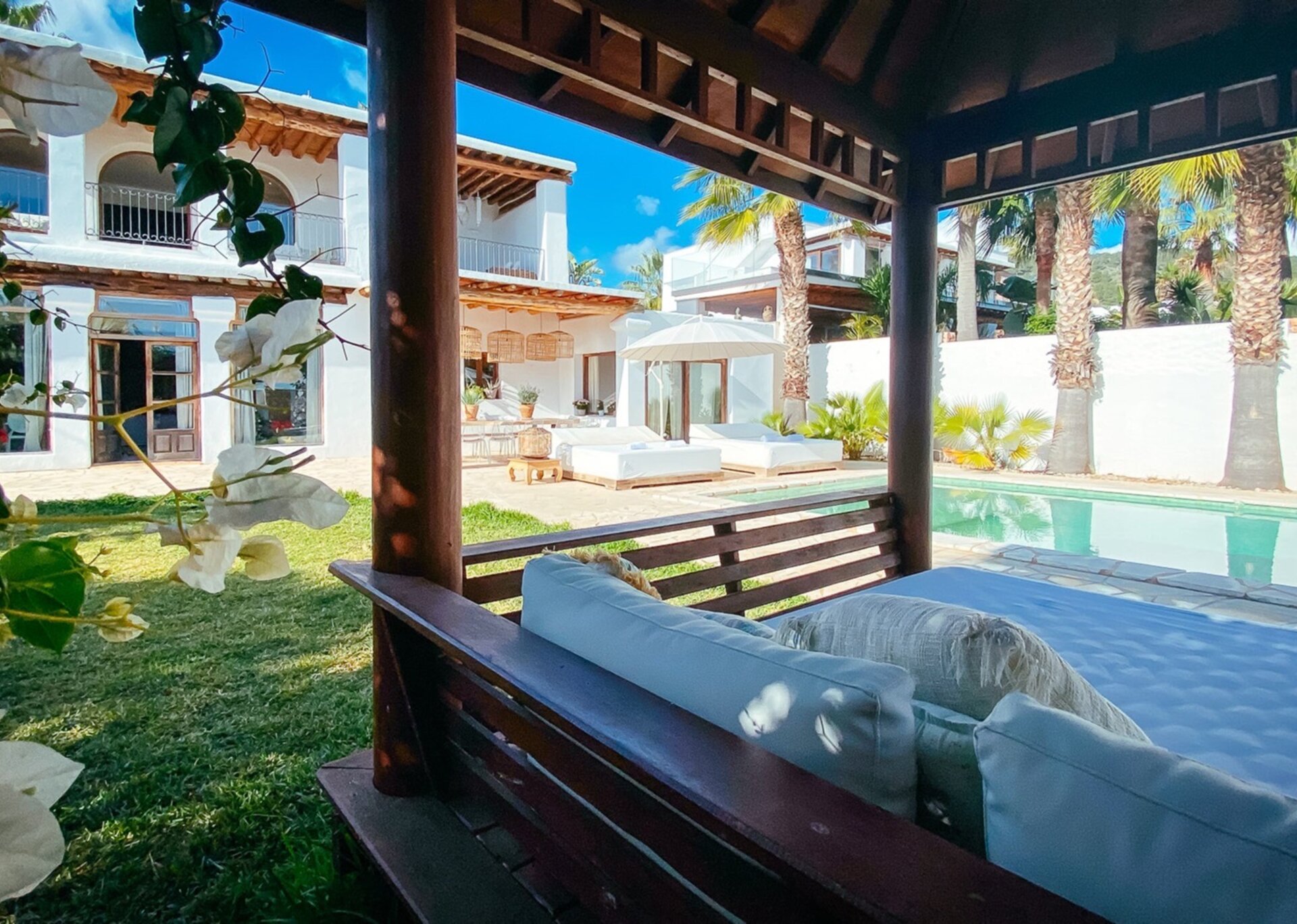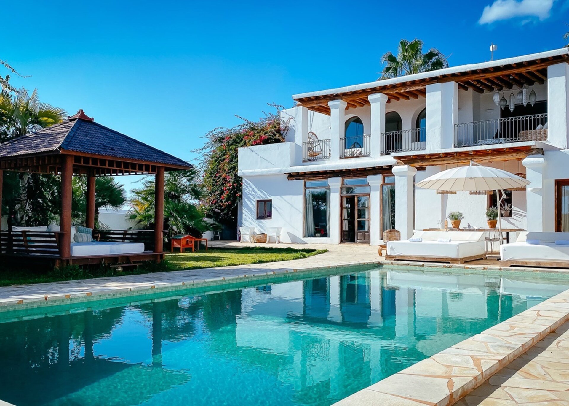 The house comfortably accommodates up to 12 people across its two floors, offering six tastefully furnished bedrooms and 4.5 bathrooms. The upper-floor bedrooms even boast their own ocean-view terraces, complete with various chill-out areas and a swing. Outside, both floors open onto shaded terraces with comfortable seating areas, allowing guests to enjoy the serenity of the surroundings. Adjacent to the pool, a four-poster daybed, sun loungers, and an alfresco dining area await, providing the perfect space for families or groups of friends to vacation in style.