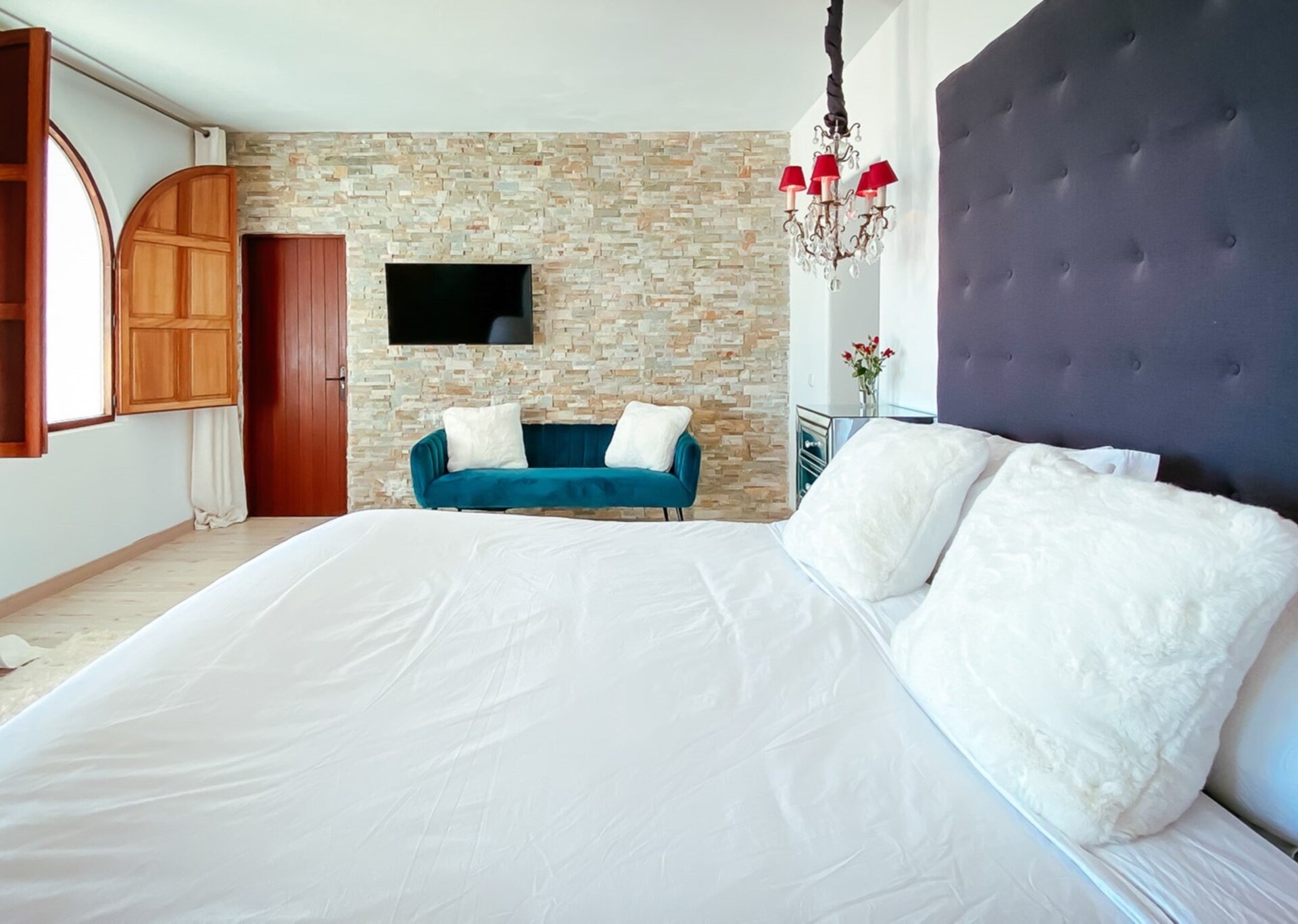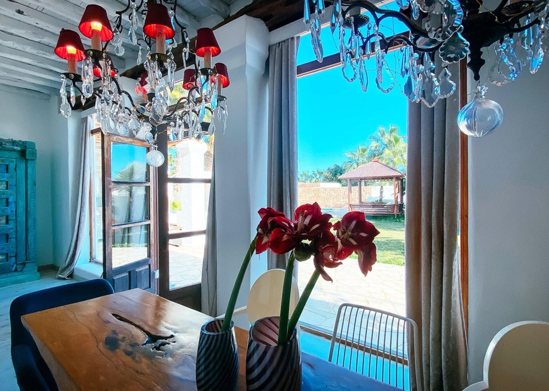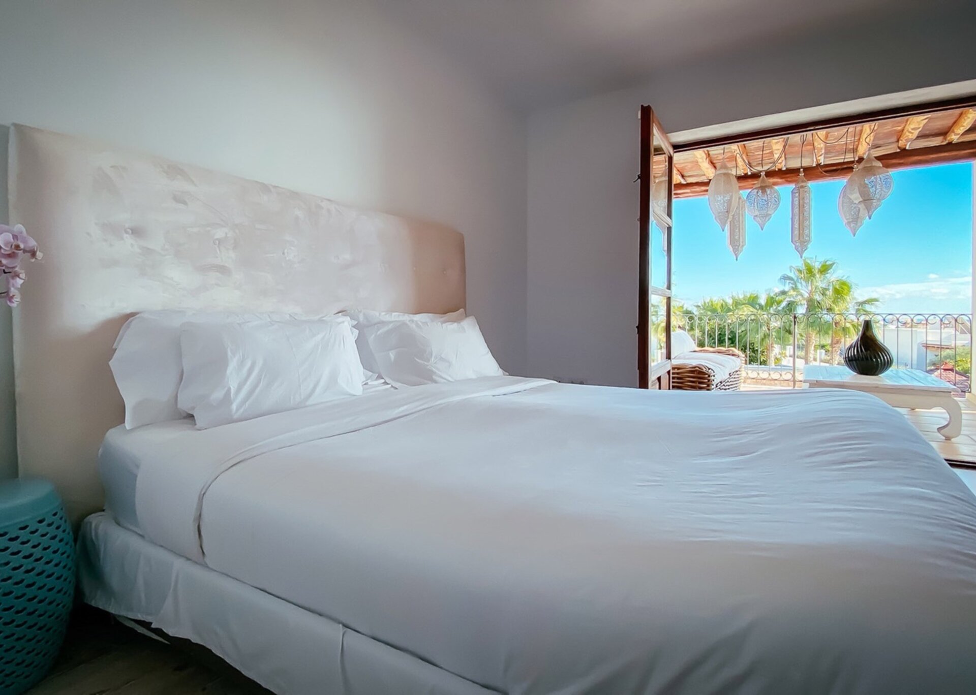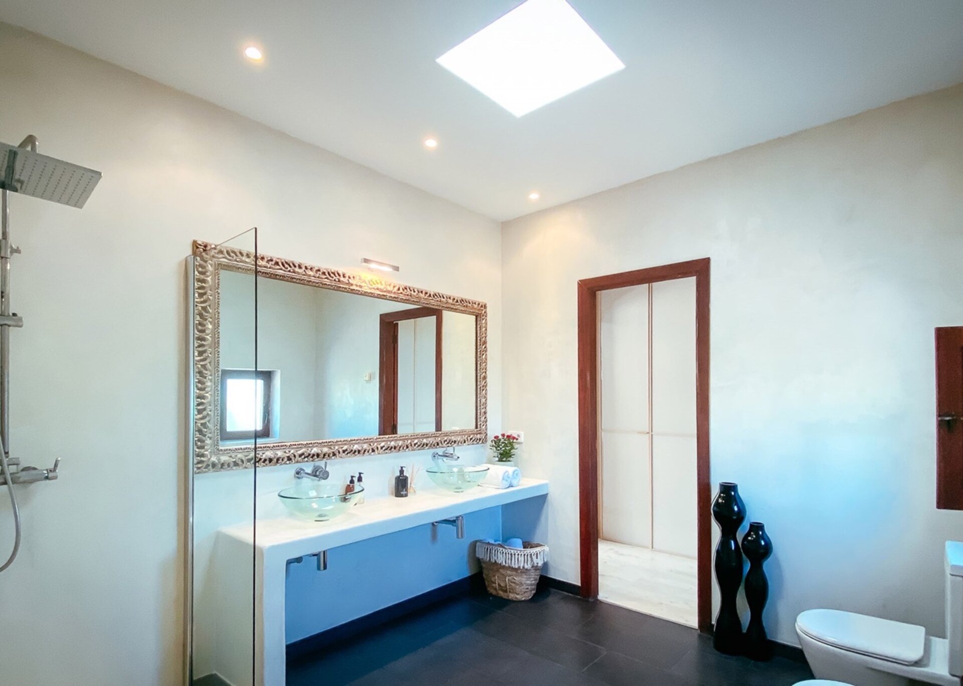 The house comfortably accommodates up to 12 people across its two floors, offering six tastefully furnished bedrooms and 4.5 bathrooms. The upper-floor bedrooms even boast their own ocean-view terraces, complete with various chill-out areas and a swing. Outside, both floors open onto shaded terraces with comfortable seating areas, allowing guests to enjoy the serenity of the surroundings. Adjacent to the pool, a four-poster daybed, sun loungers, and an alfresco dining area await, providing the perfect space for families or groups of friends to vacation in style.