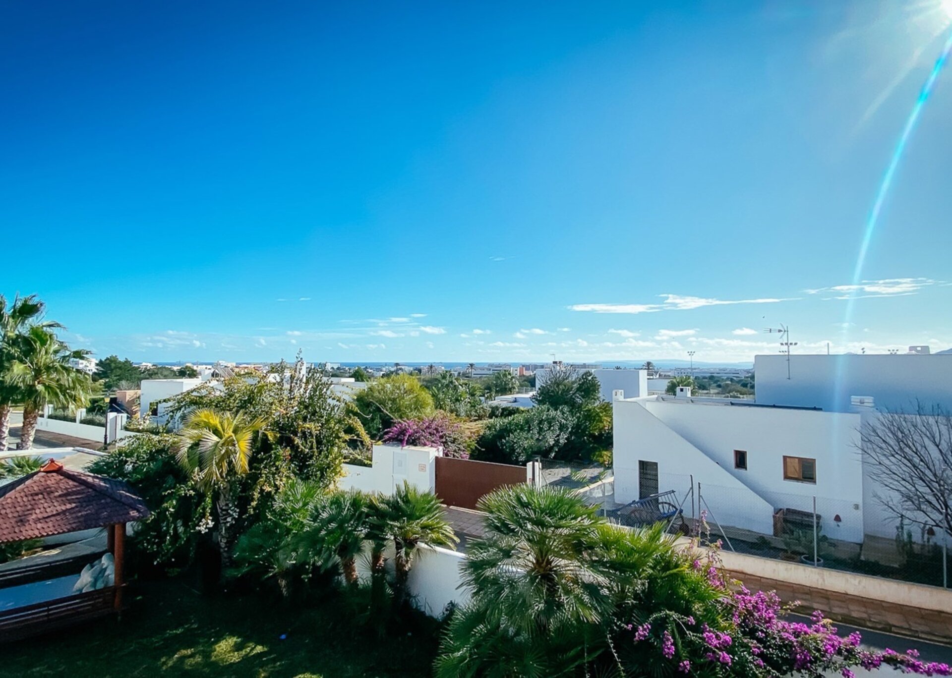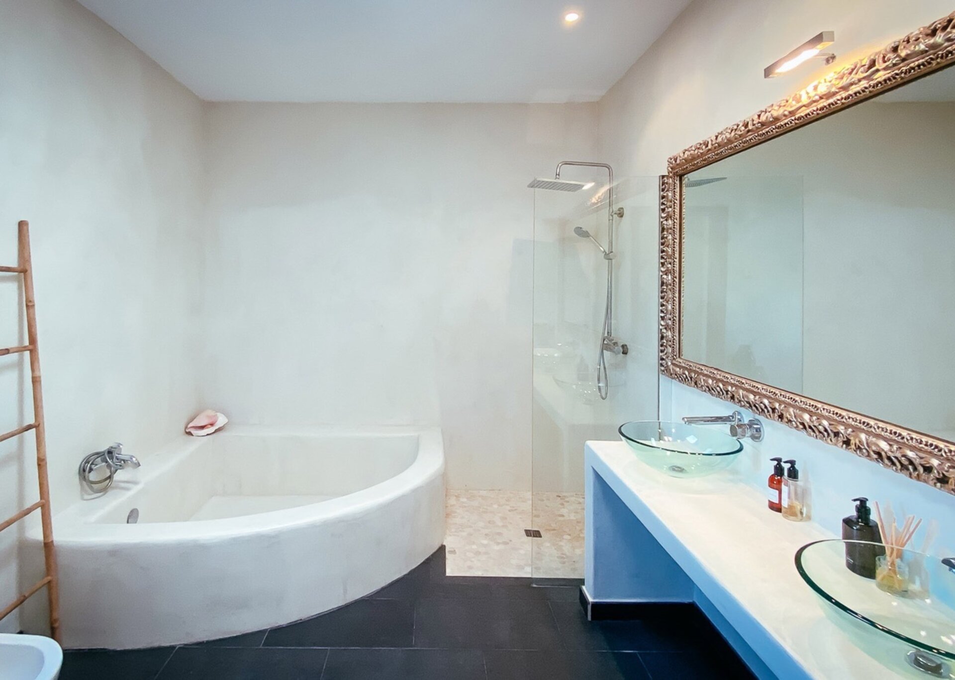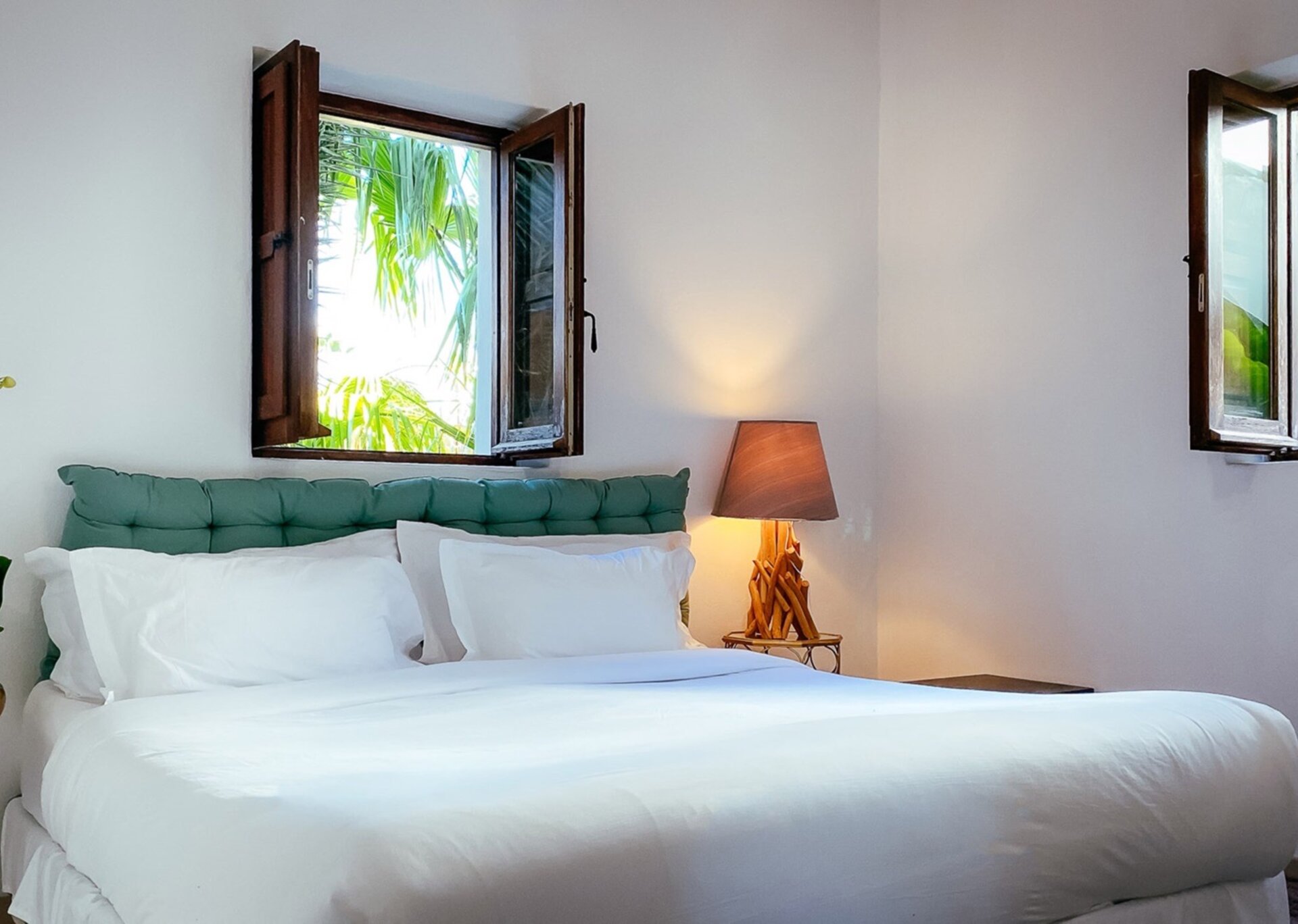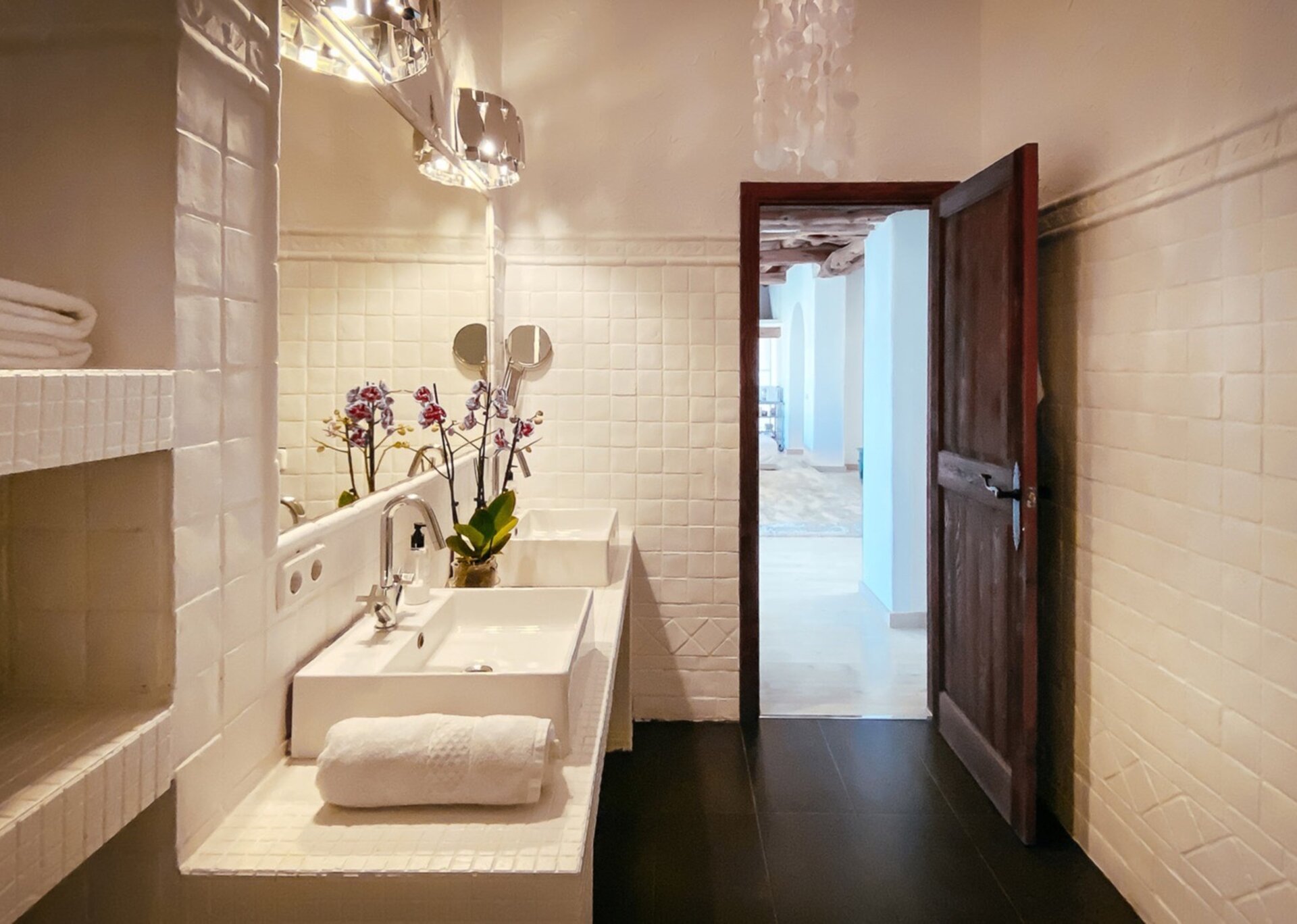 The house comfortably accommodates up to 12 people across its two floors, offering six tastefully furnished bedrooms and 4.5 bathrooms. The upper-floor bedrooms even boast their own ocean-view terraces, complete with various chill-out areas and a swing. Outside, both floors open onto shaded terraces with comfortable seating areas, allowing guests to enjoy the serenity of the surroundings. Adjacent to the pool, a four-poster daybed, sun loungers, and an alfresco dining area await, providing the perfect space for families or groups of friends to vacation in style.