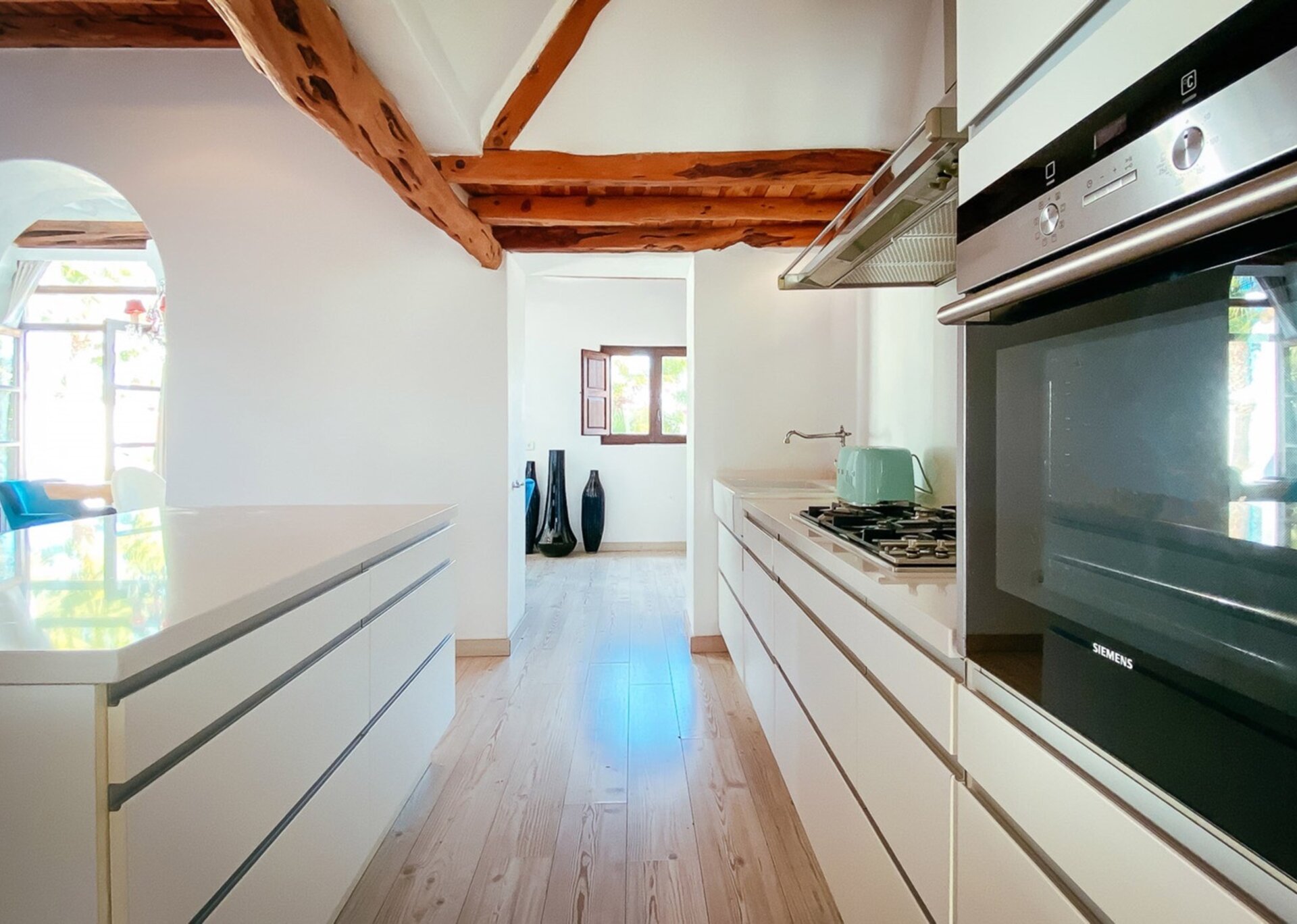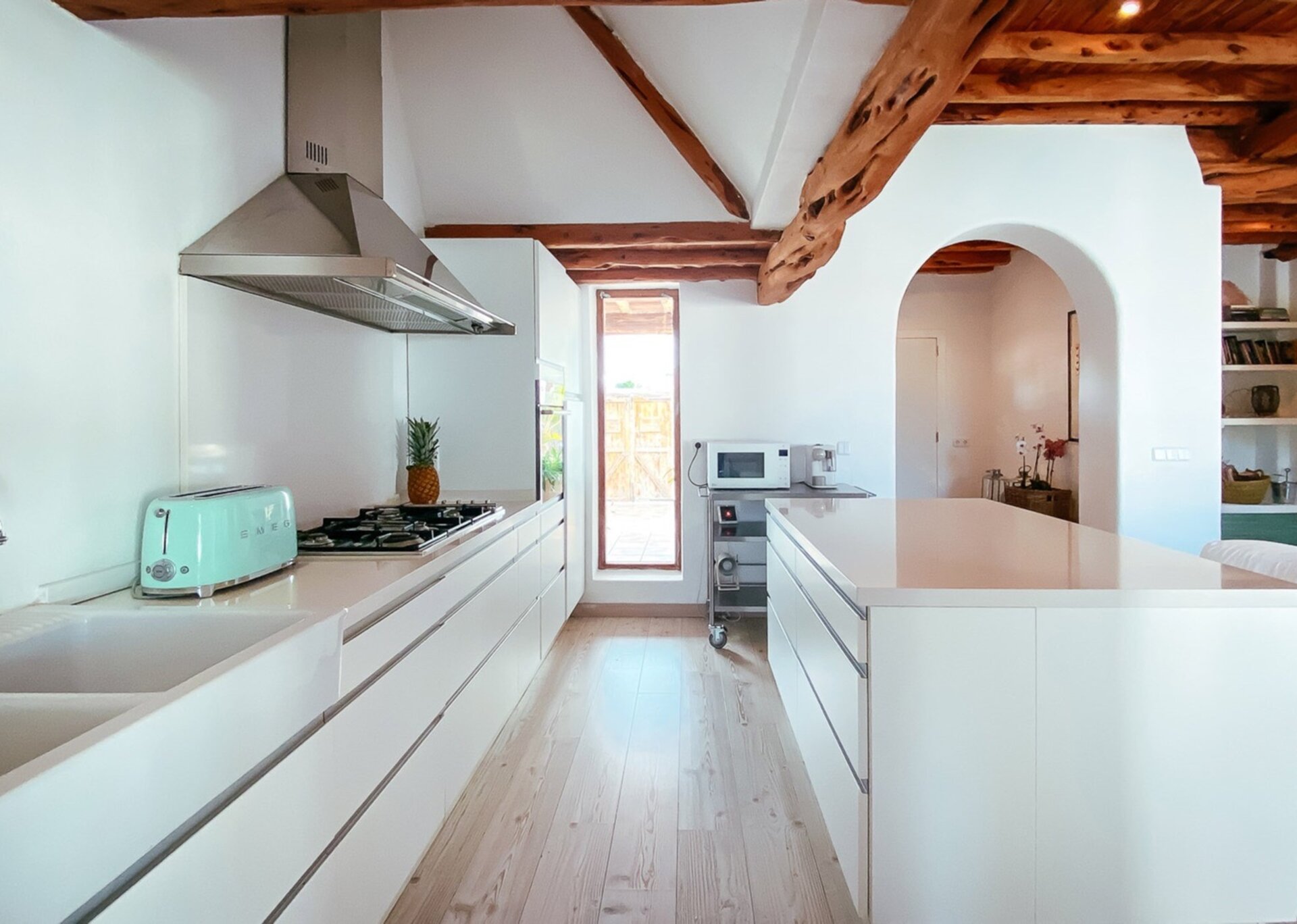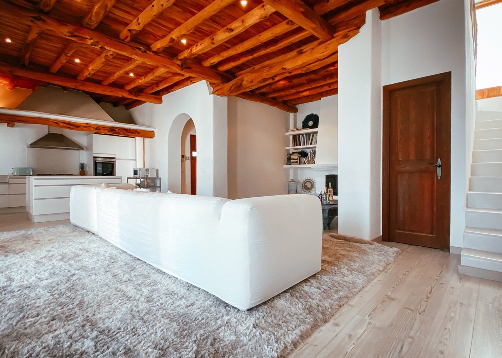 This remarkable home beautifully juxtaposes authentic styling, featuring wooden beamed ceilings, with a minimalist blend of contemporary boho-chic decor. Each room bathes in an abundance of natural light, thanks to the clean, bright white-washed walls and high ceilings, creating an incredibly spacious and inviting atmosphere.