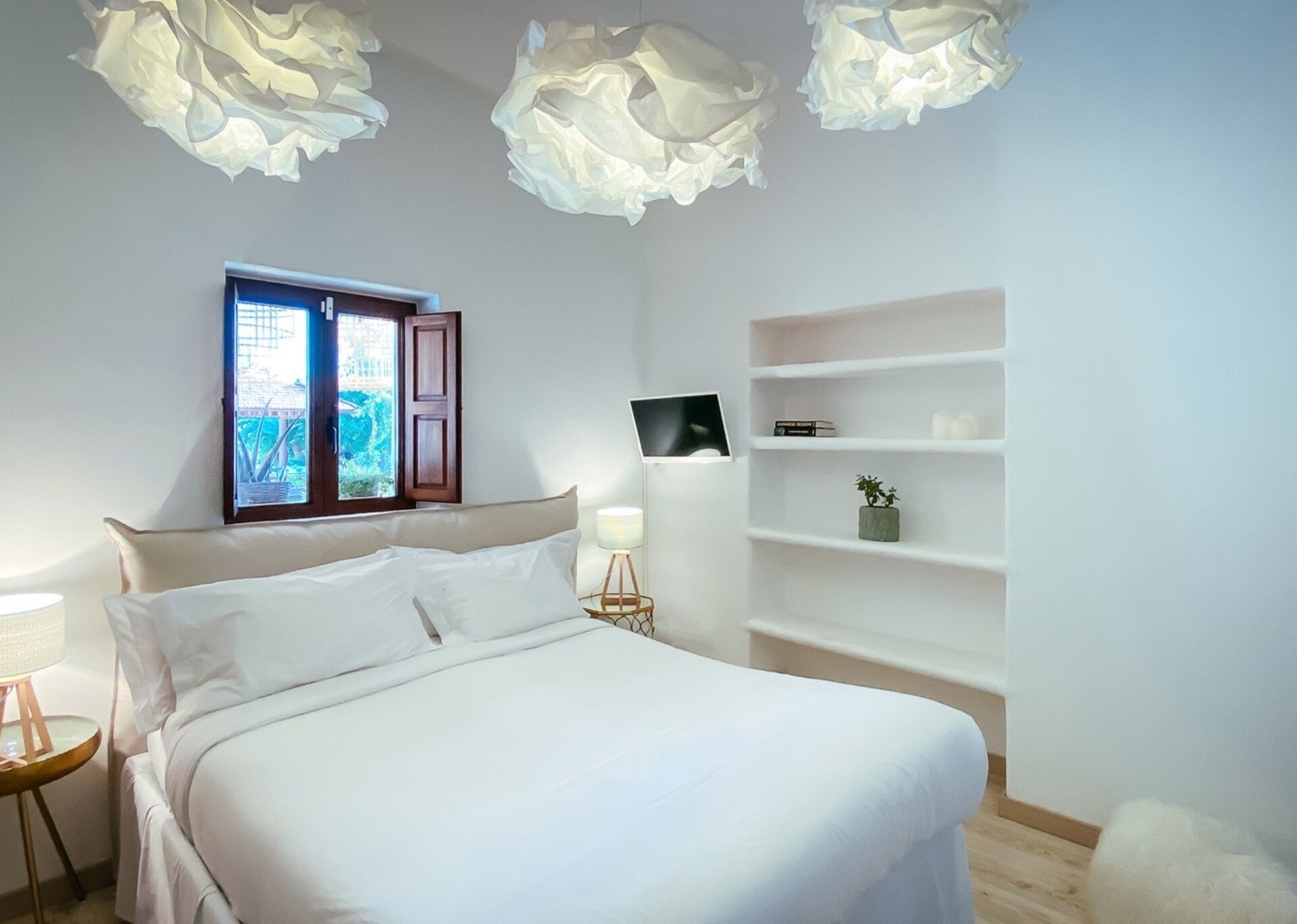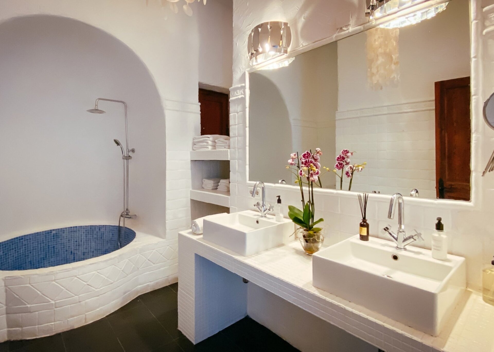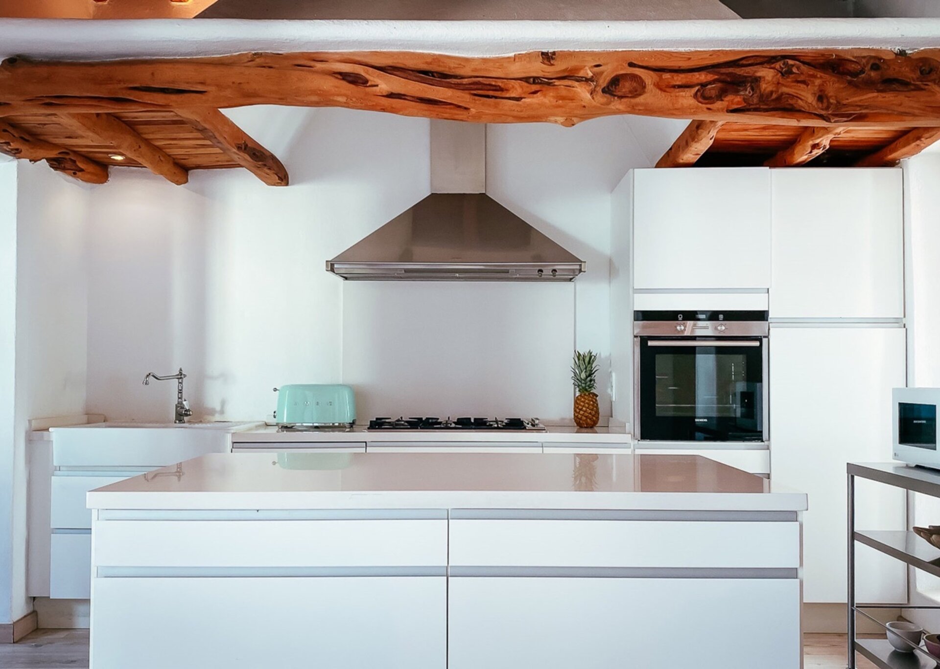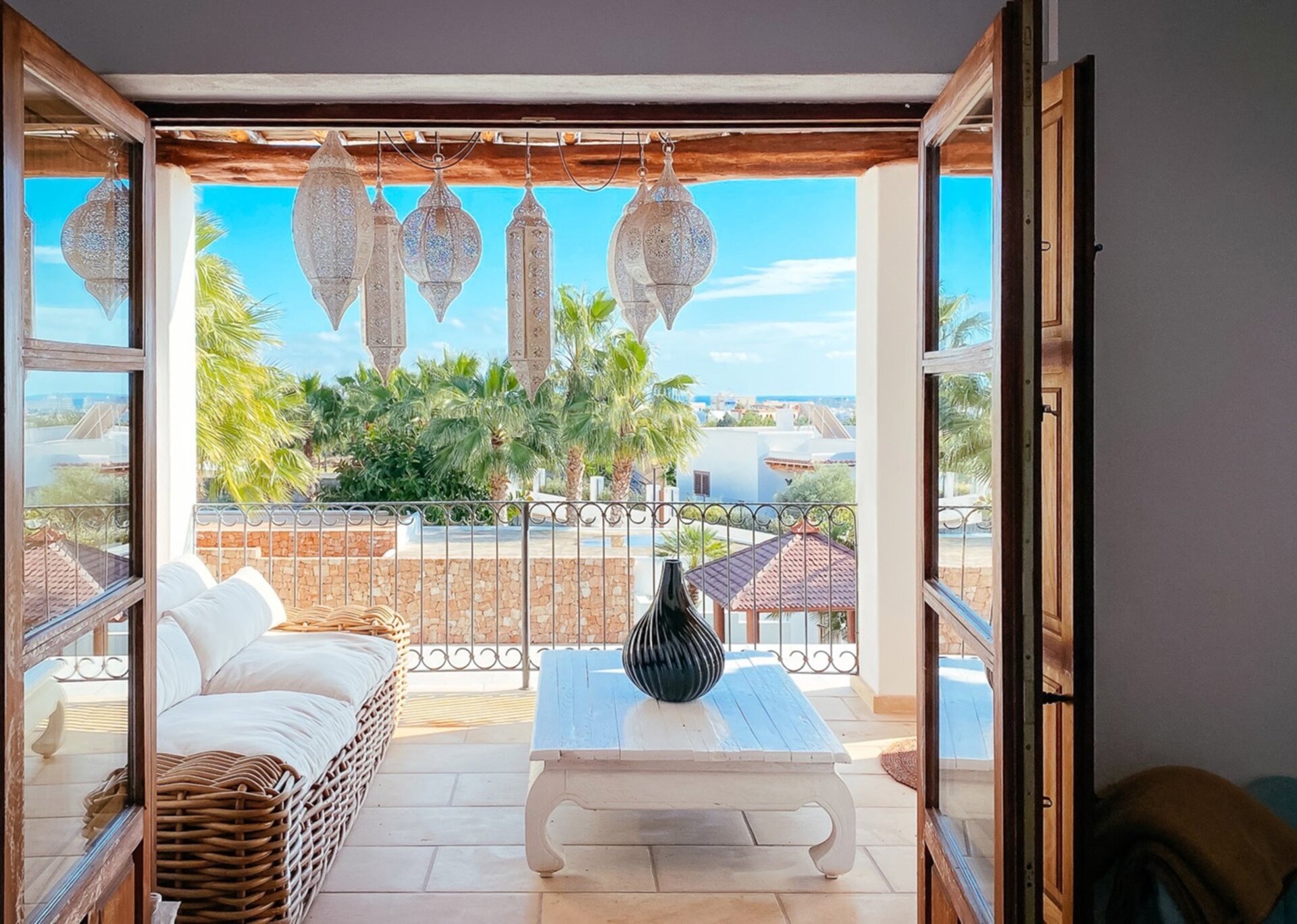 This remarkable home beautifully juxtaposes authentic styling, featuring wooden beamed ceilings, with a minimalist blend of contemporary boho-chic decor. Each room bathes in an abundance of natural light, thanks to the clean, bright white-washed walls and high ceilings, creating an incredibly spacious and inviting atmosphere.