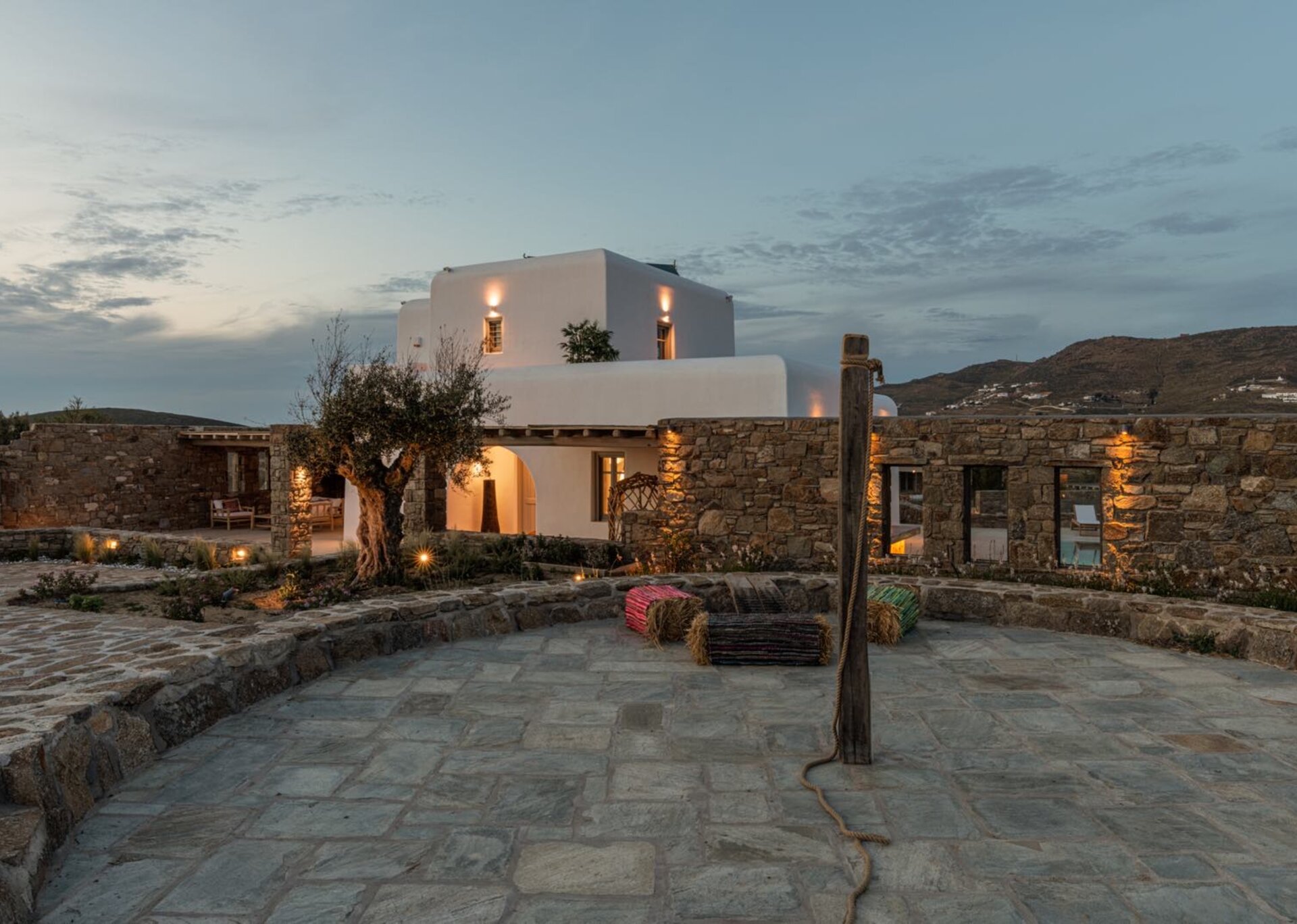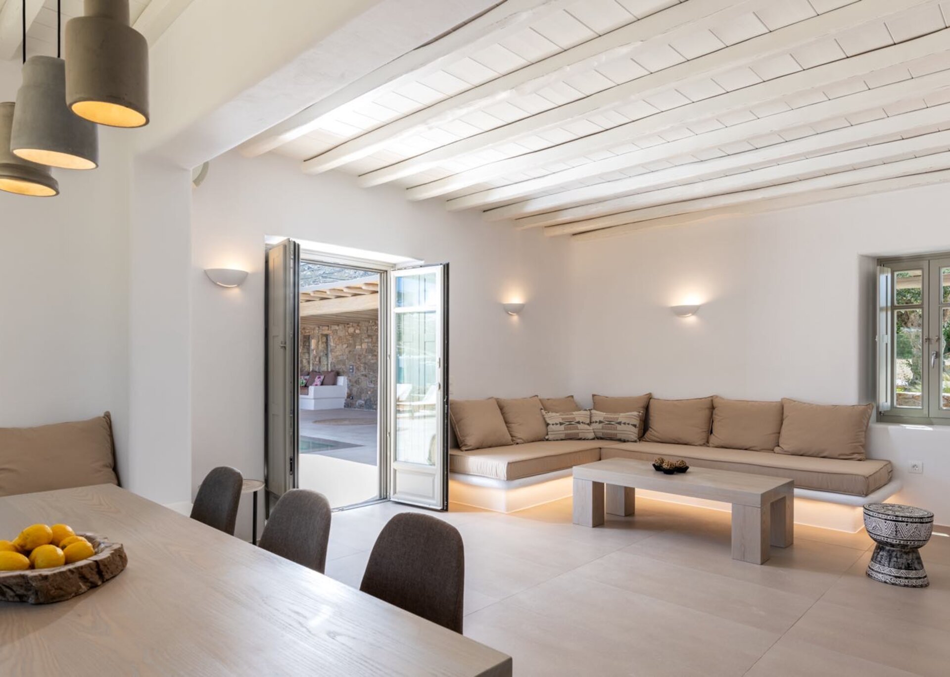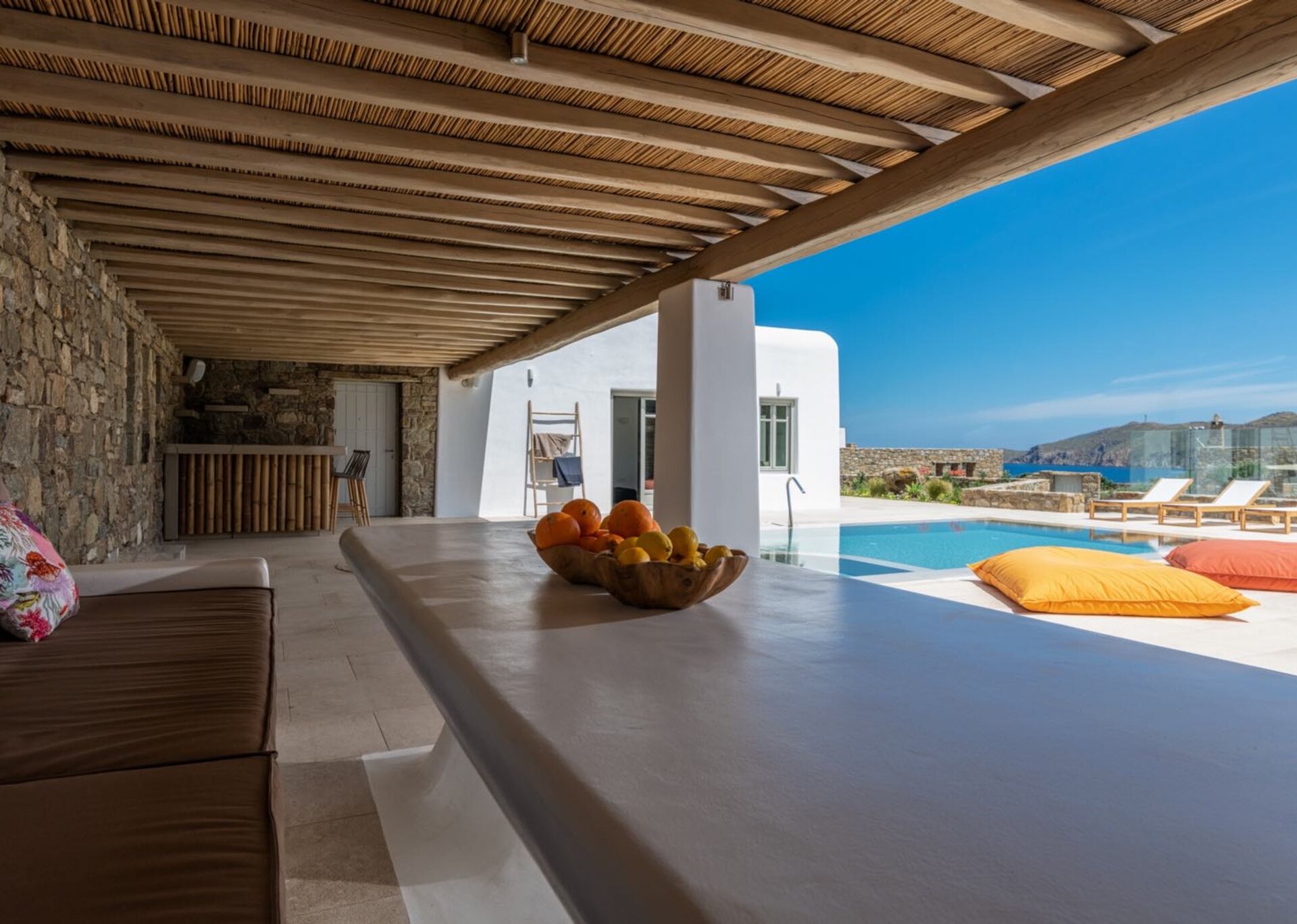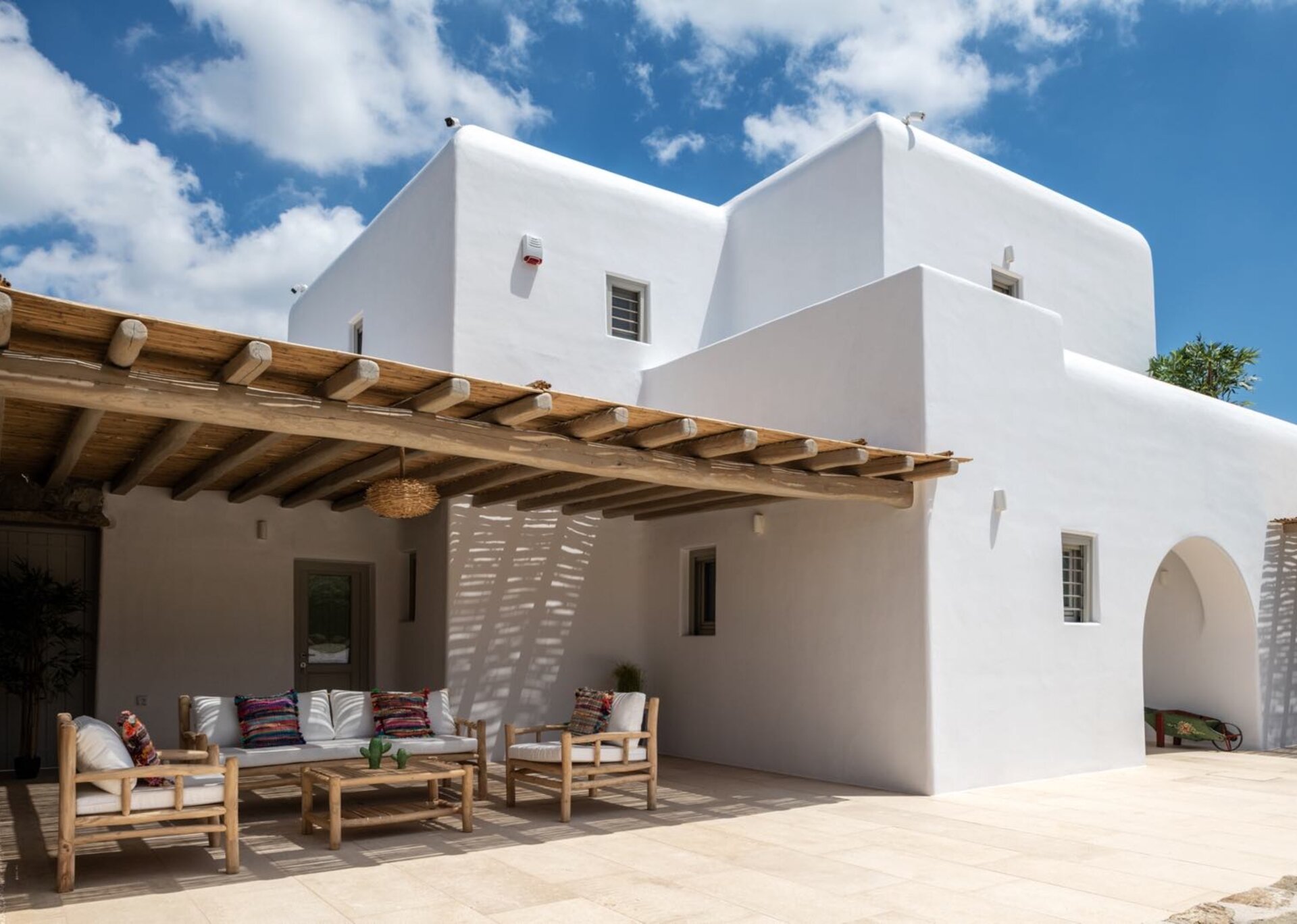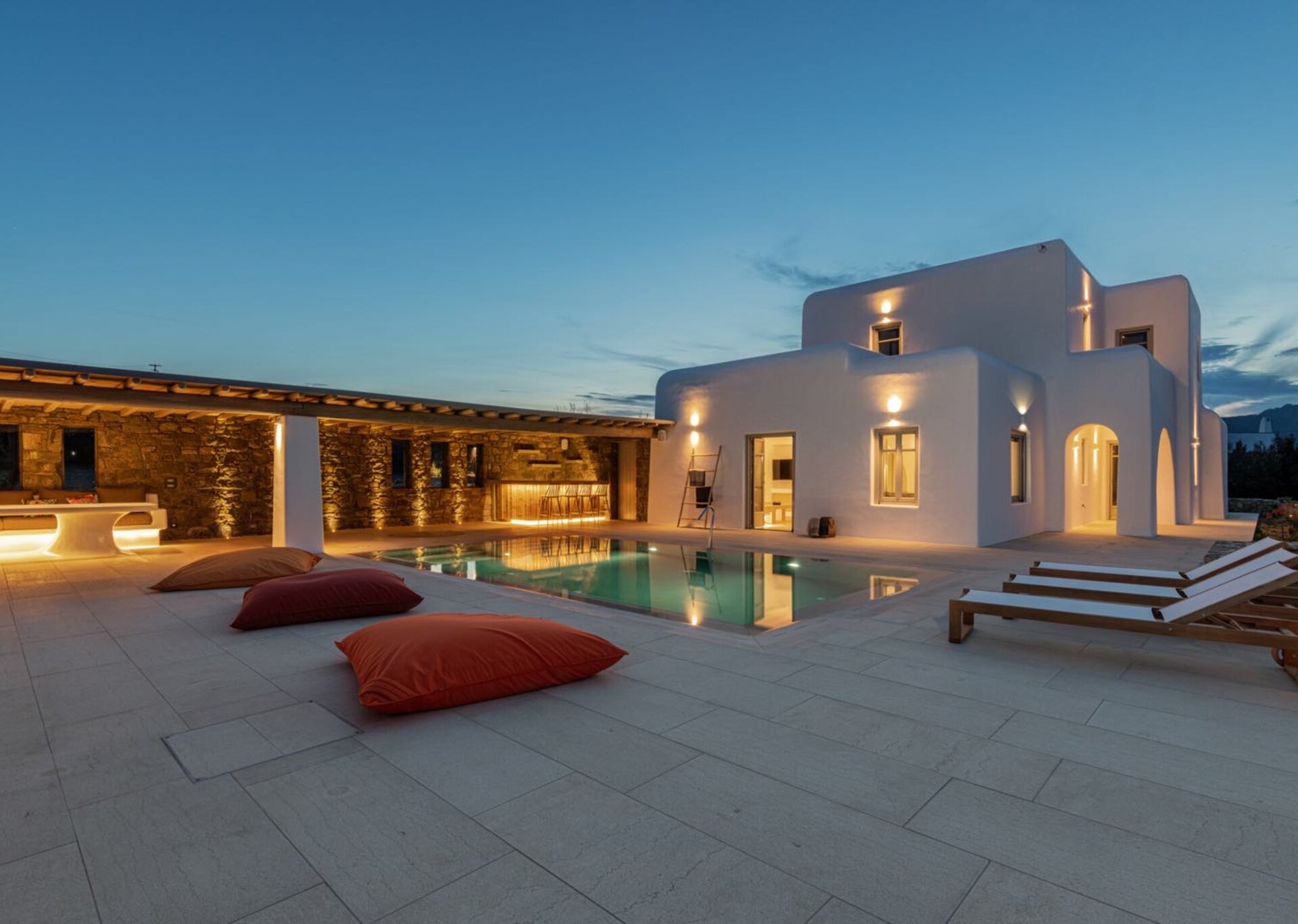 Villa Primavera is a new villa , which was built in 2019. The Propery extends on a large plot of 1200m2 overlooking the northern Aegean Sea. The villa is located above Ftelia beach , 7 mins from Mykonos town.Villa aloni provides 4 en-suite bedrooms and can comfortably accommodate 8 guests. It is divided into 2 sections.
