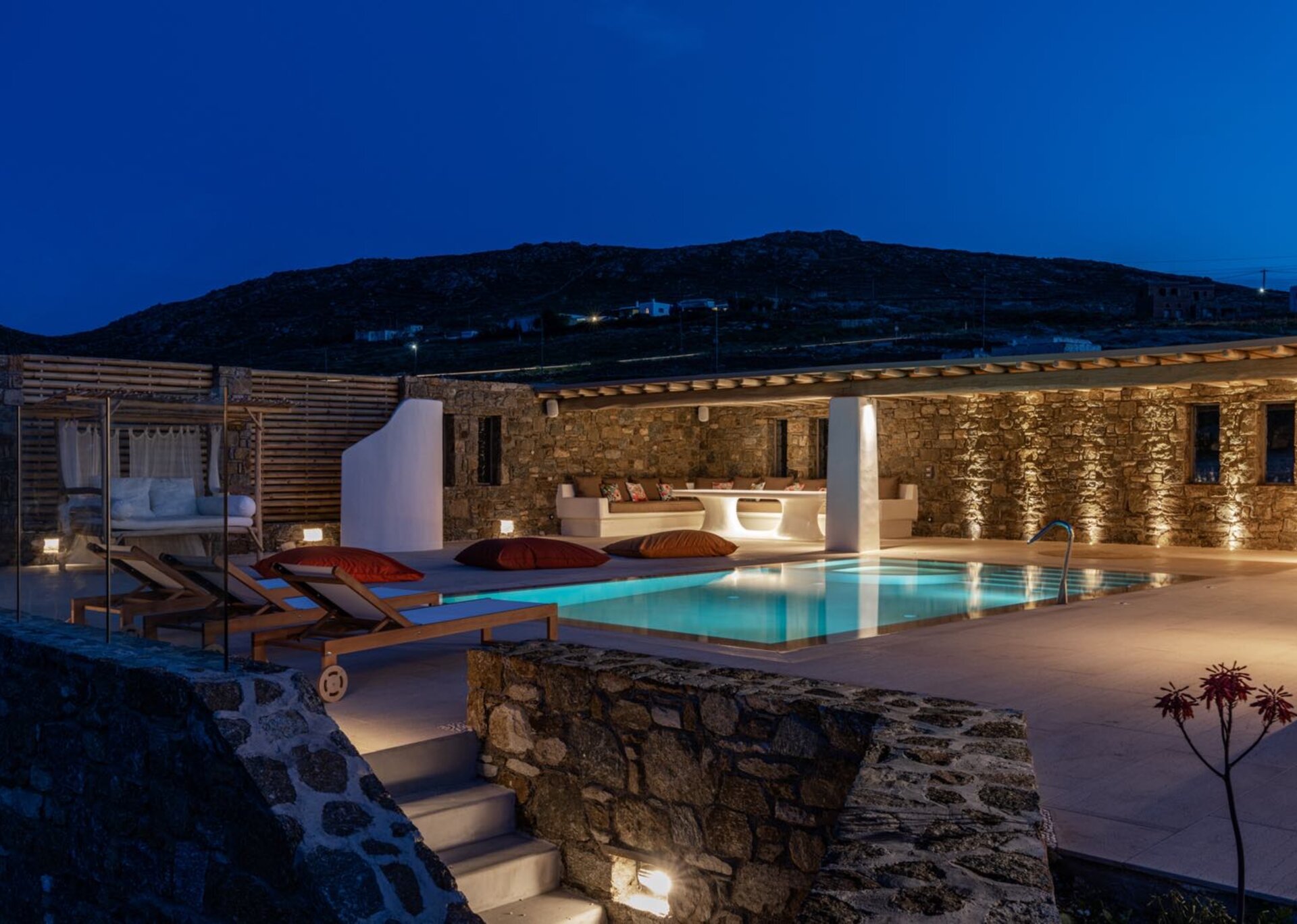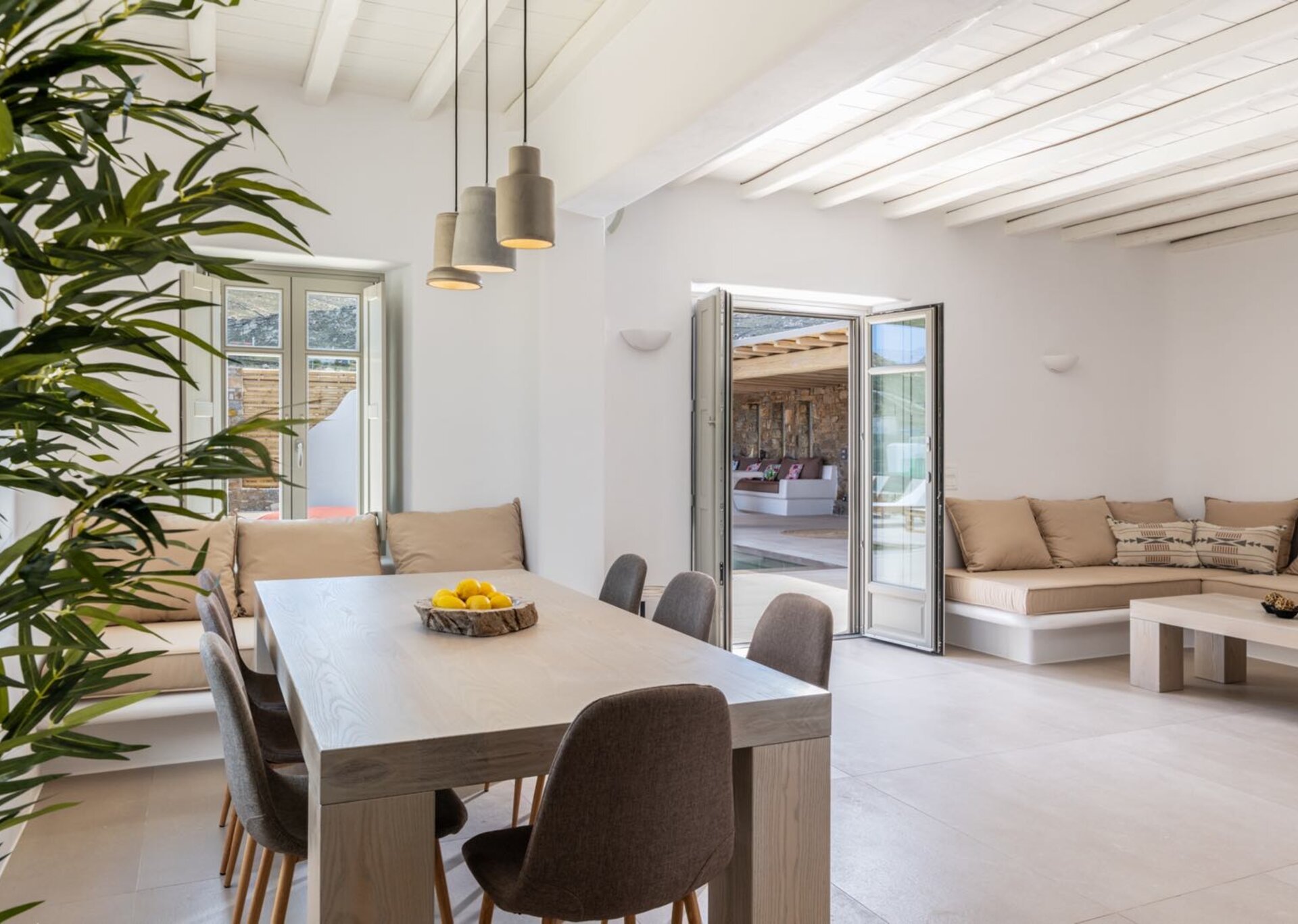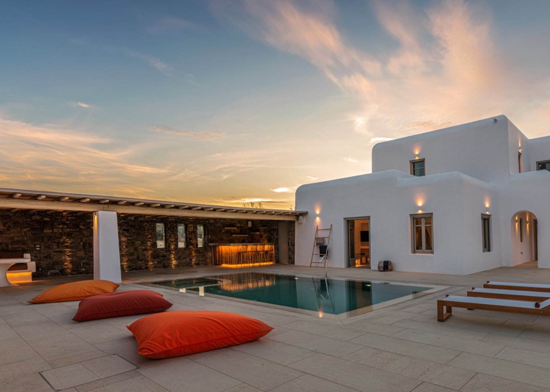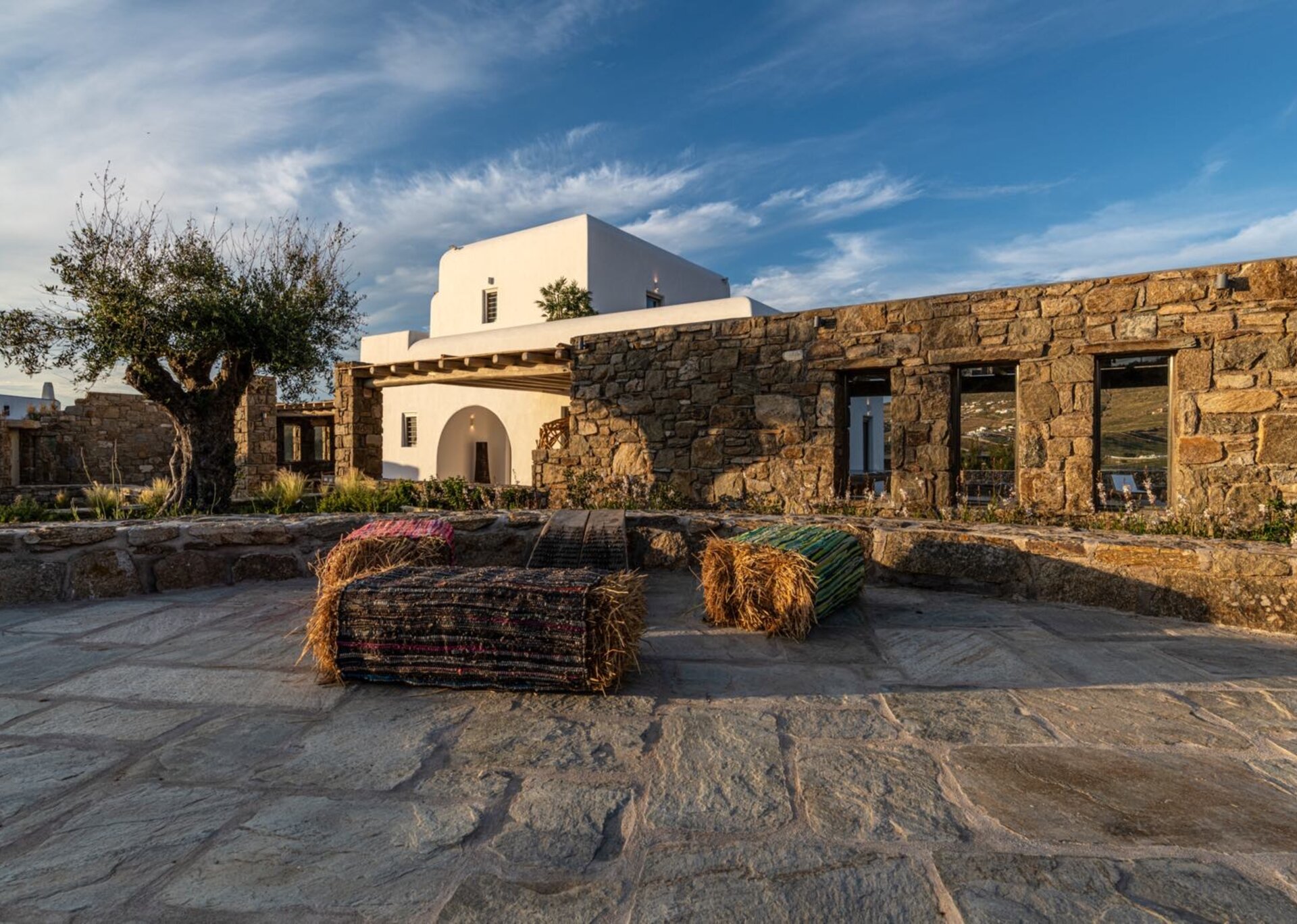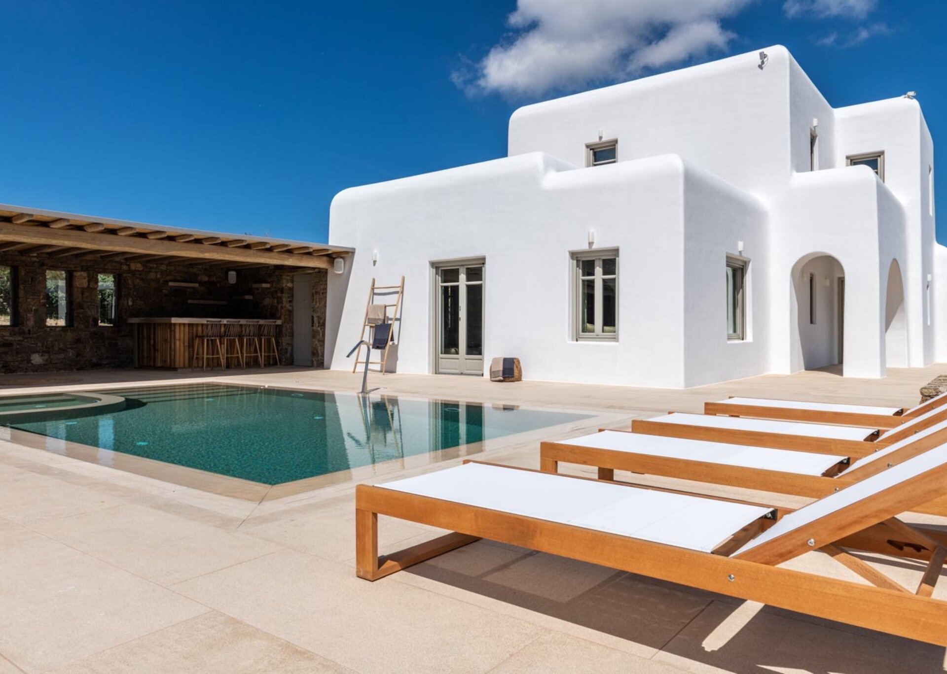 Villa Primavera is a new villa , which was built in 2019. The Propery extends on a large plot of 1200m2 overlooking the northern Aegean Sea. The villa is located above Ftelia beach , 7 mins from Mykonos town.Villa aloni provides 4 en-suite bedrooms and can comfortably accommodate 8 guests. It is divided into 2 sections.