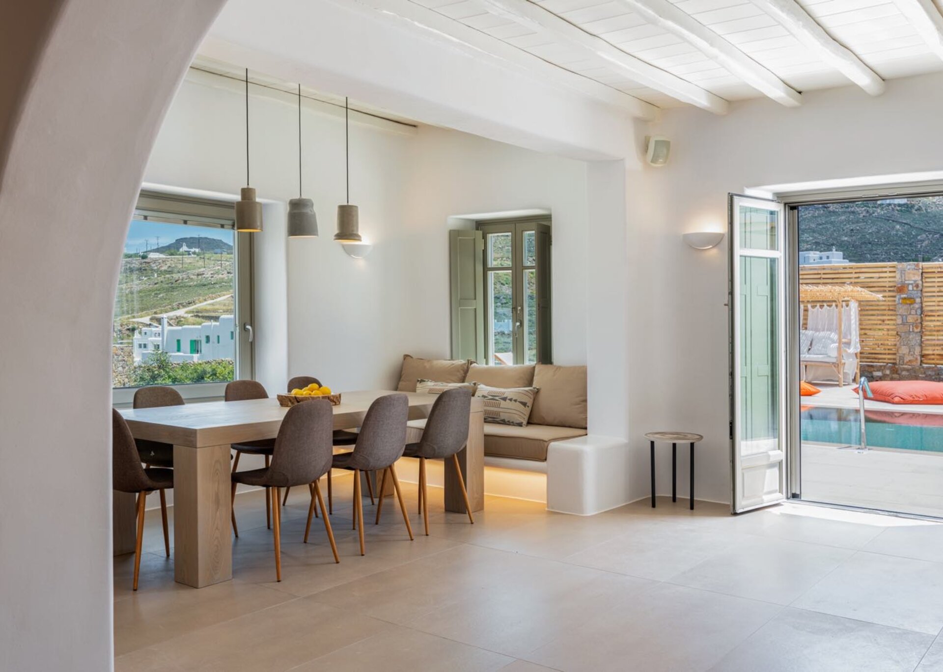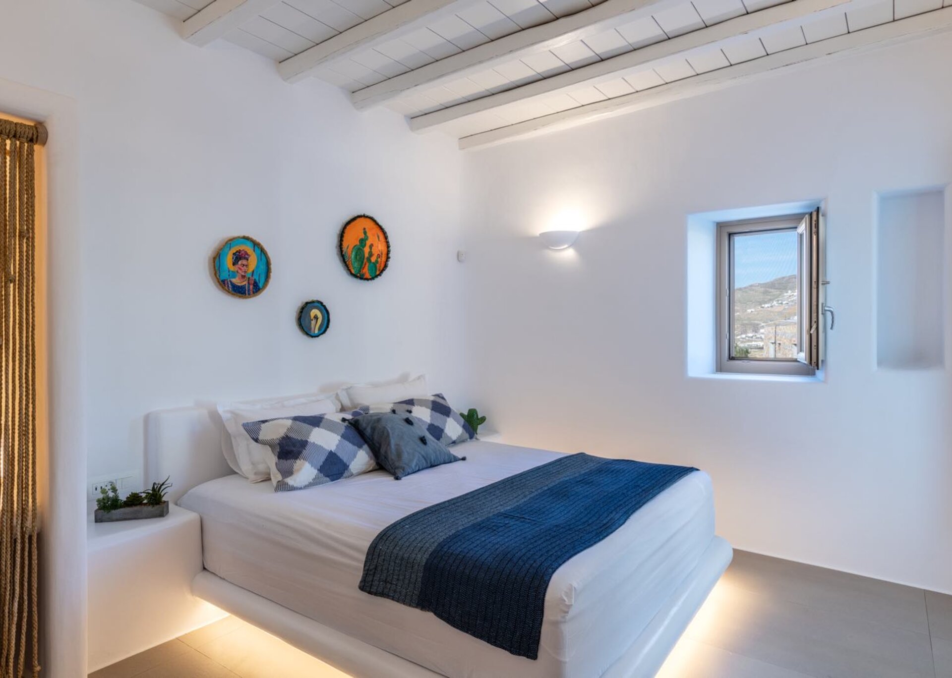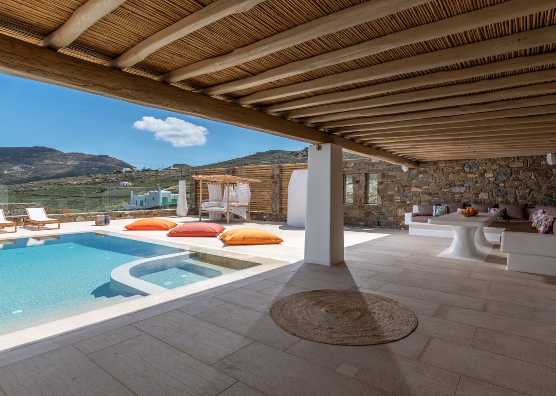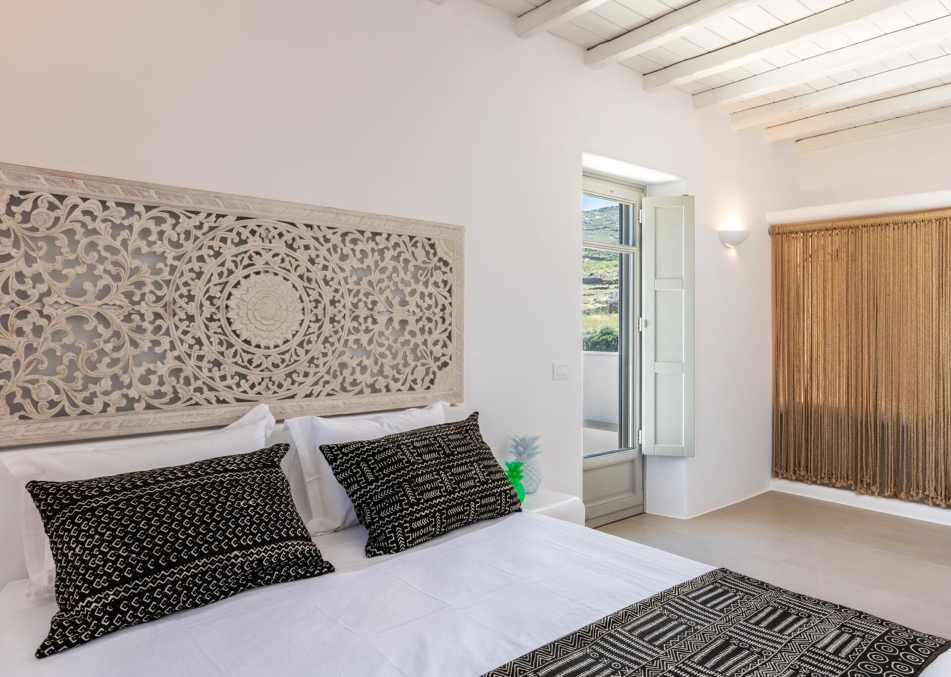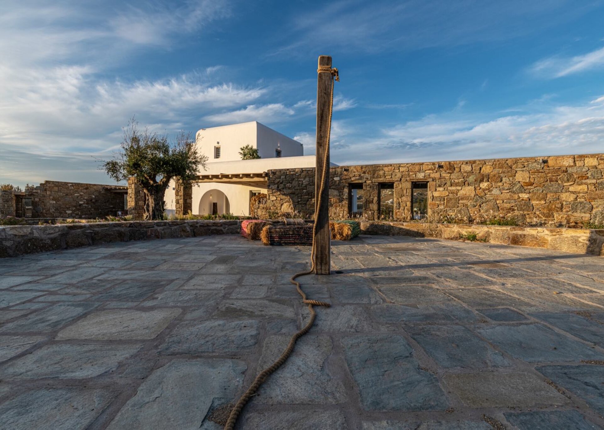 Villa Primavera is a new villa , which was built in 2019. The Propery extends on a large plot of 1200m2 overlooking the northern Aegean Sea. The villa is located above Ftelia beach , 7 mins from Mykonos town.Villa aloni provides 4 en-suite bedrooms and can comfortably accommodate 8 guests. It is divided into 2 sections.
