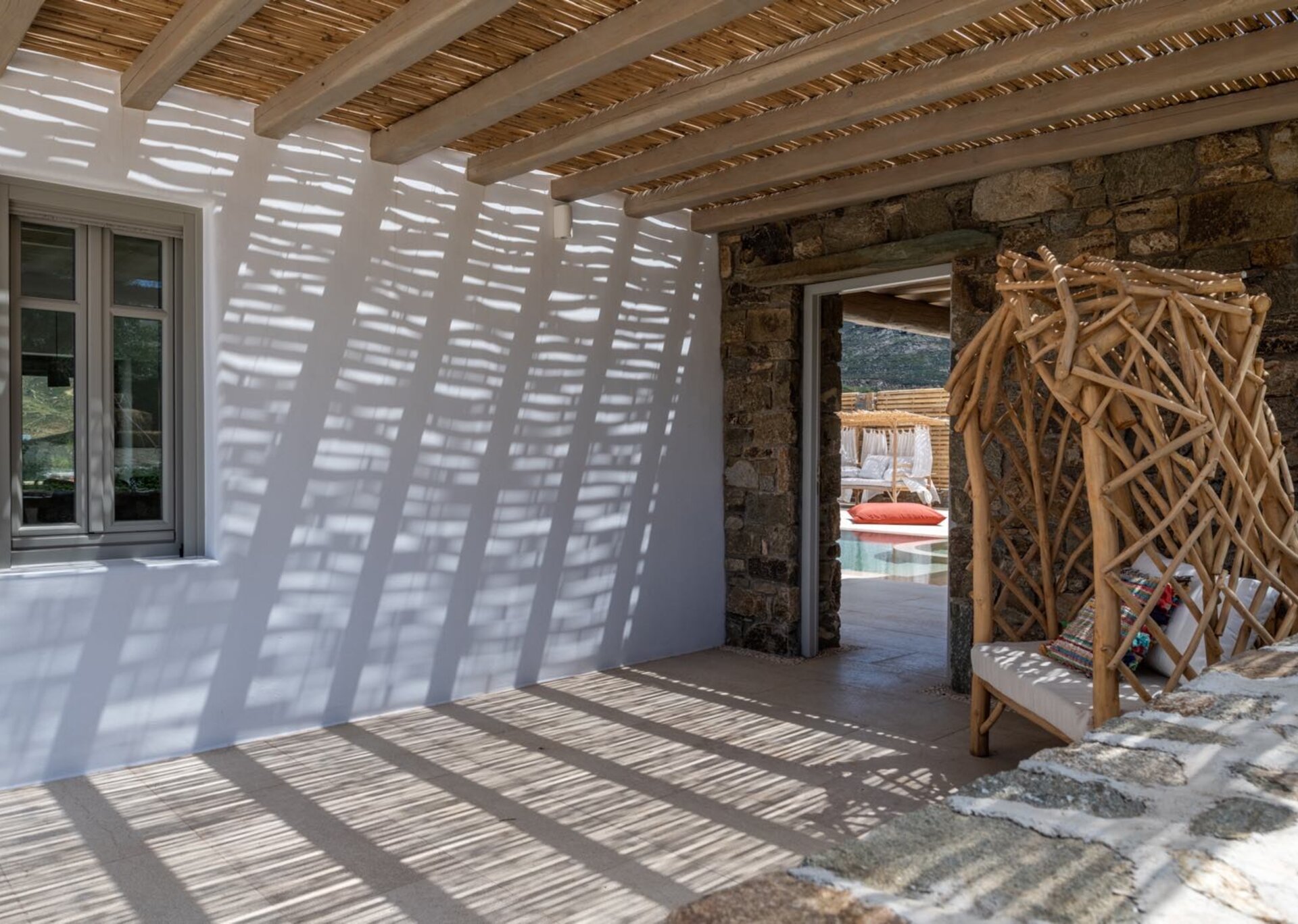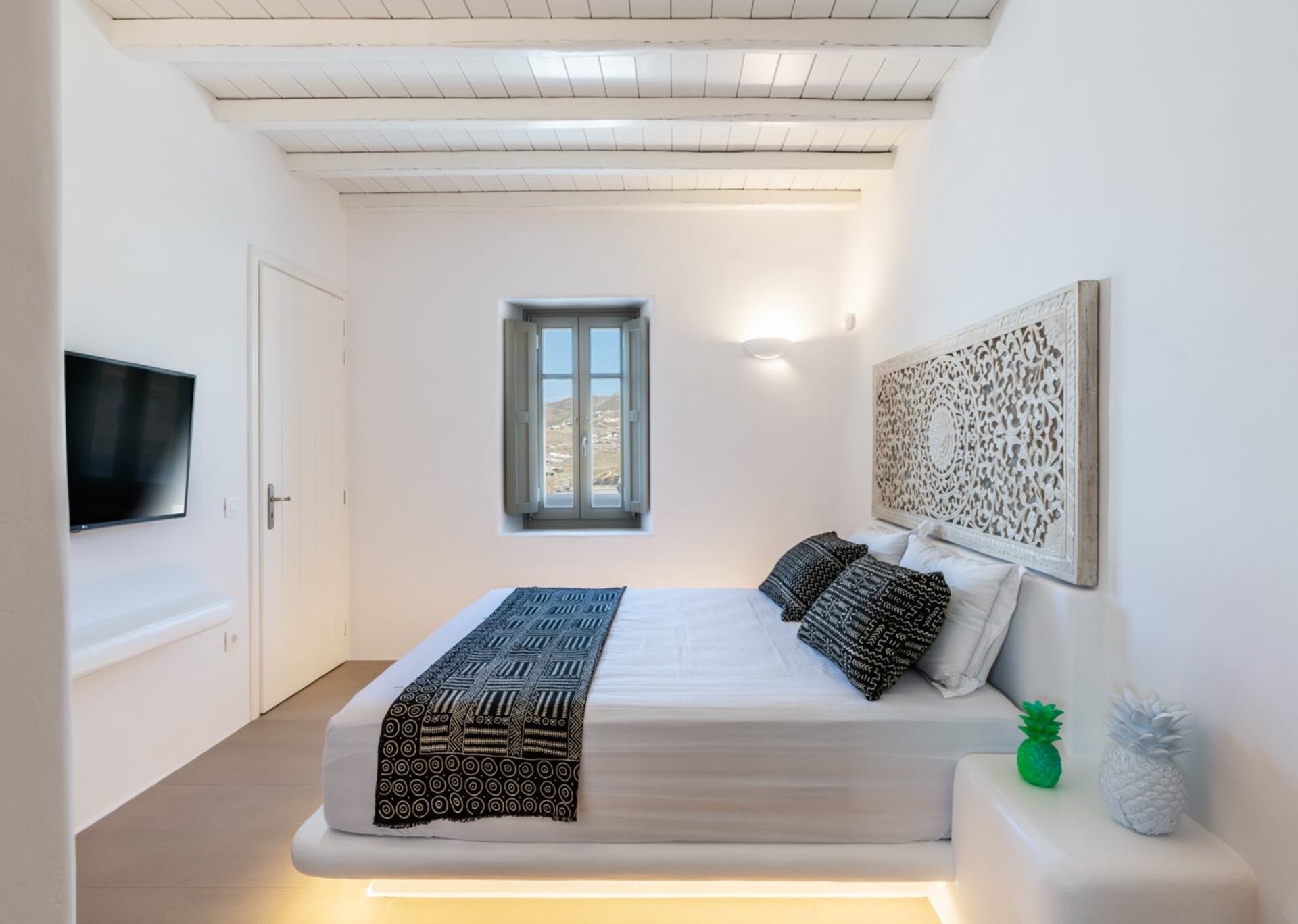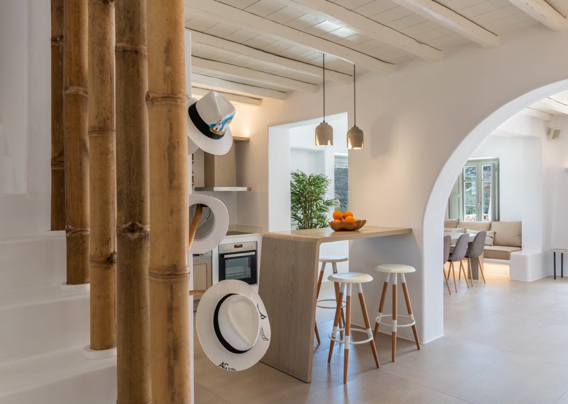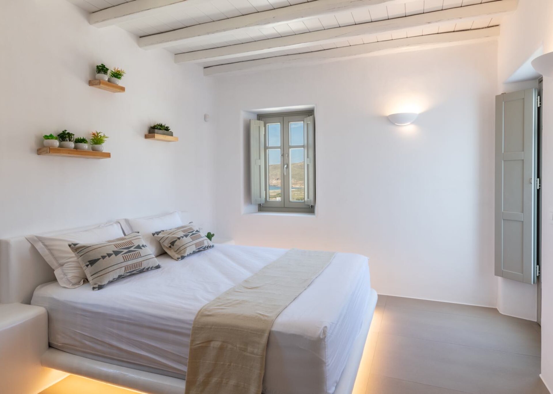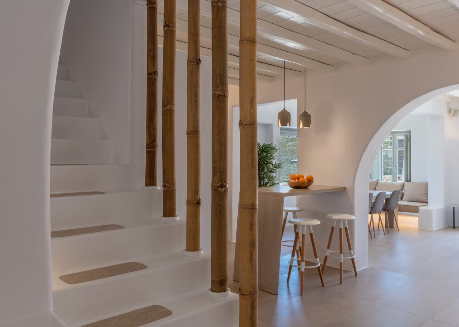Villa Primavera is a new villa , which was built in 2019. The Propery extends on a large plot of 1200m2 overlooking the northern Aegean Sea. The villa is located above Ftelia beach , 7 mins from Mykonos town.Villa aloni provides 4 en-suite bedrooms and can comfortably accommodate 8 guests. It is divided into 2 sections.