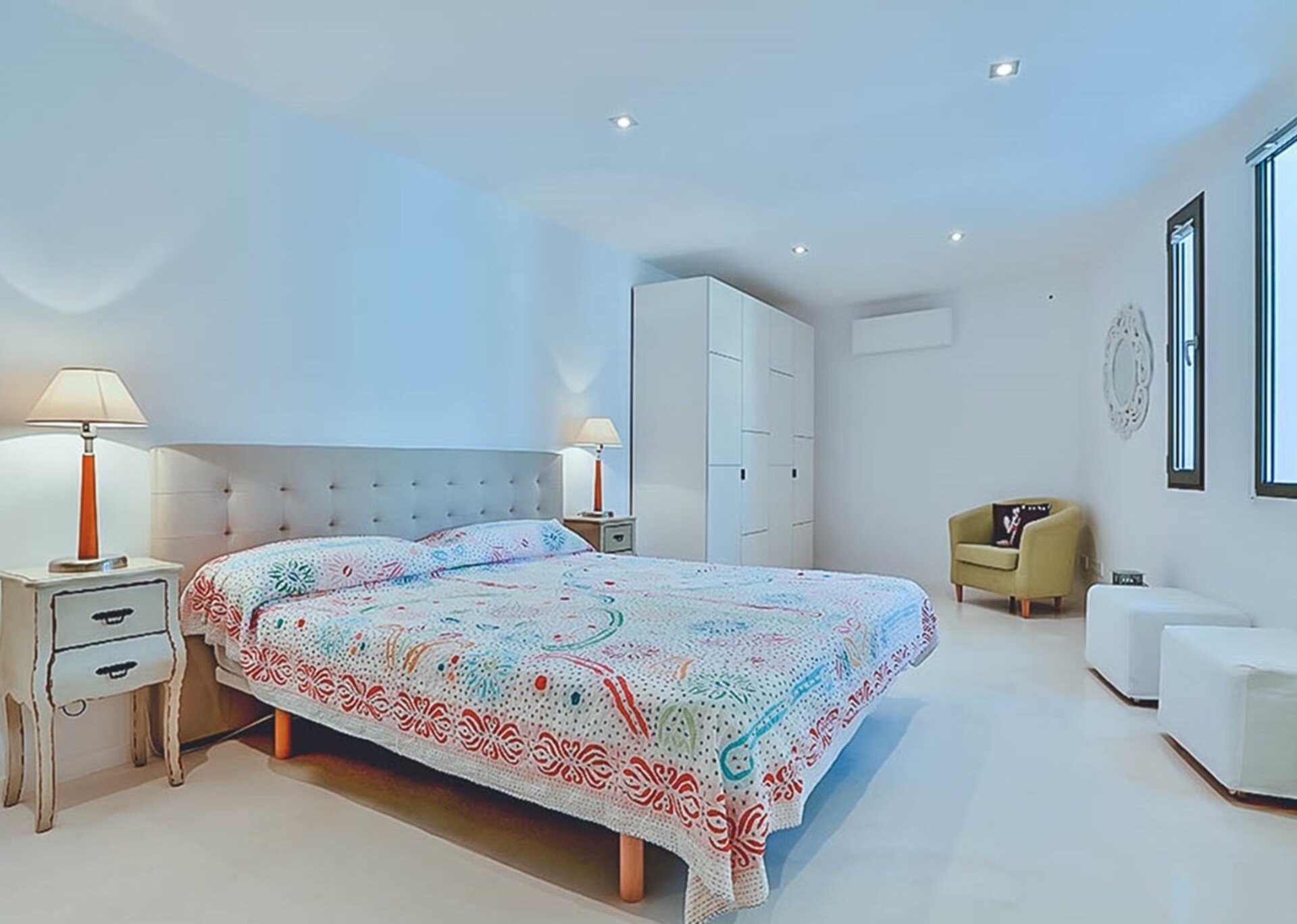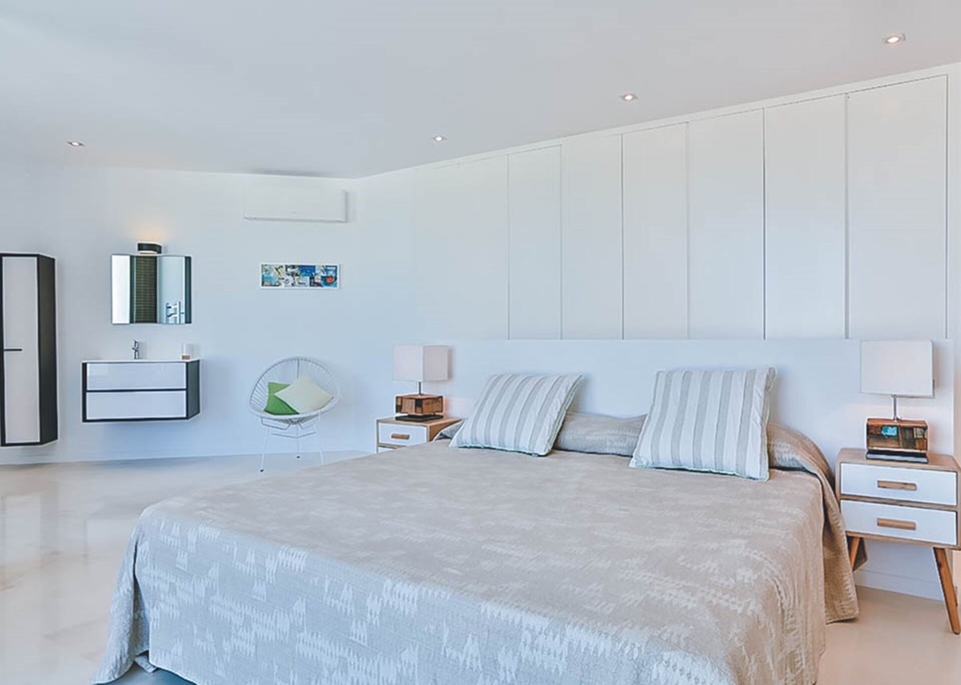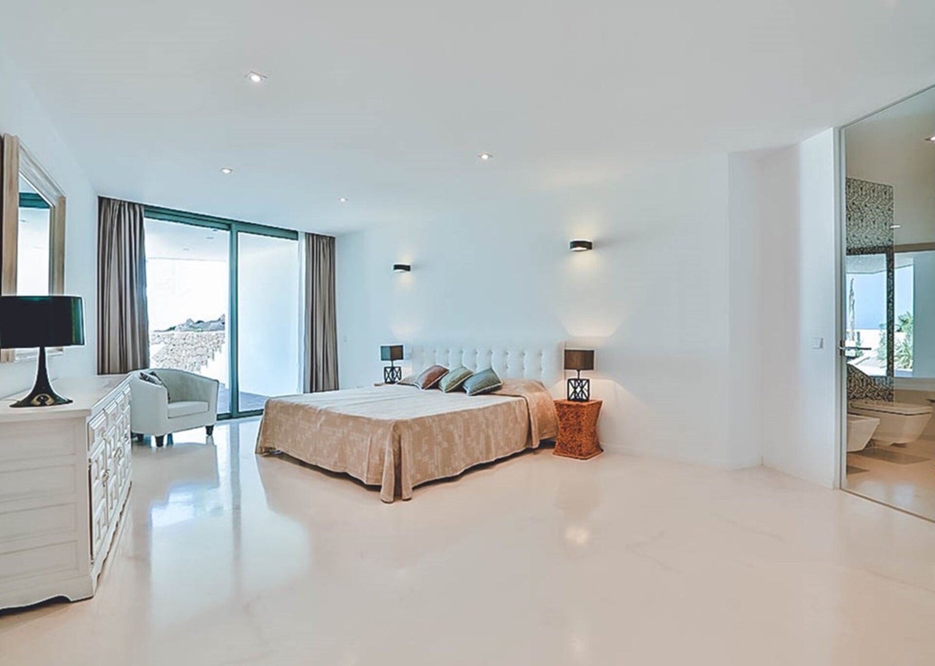 Ascending to the pinnacle of luxury, the master bedroom occupies the entire top floor and boasts its own private terrace, providing an idyllic retreat to soak in the picturesque views that stretch as far as the neighboring island of Formentera. The remaining bedrooms are equally impressive, each complete with its own en-suite bathroom, ensuring the utmost comfort and privacy for all guests.