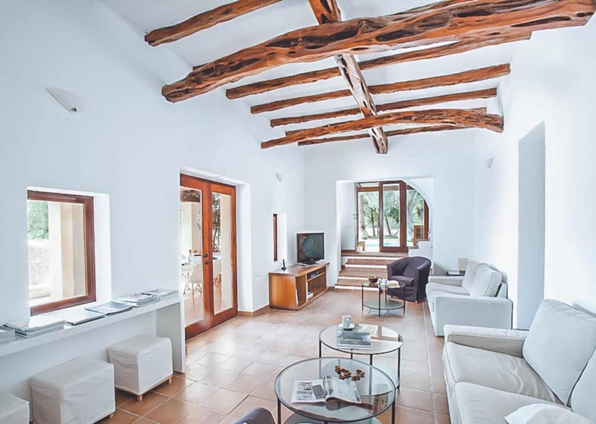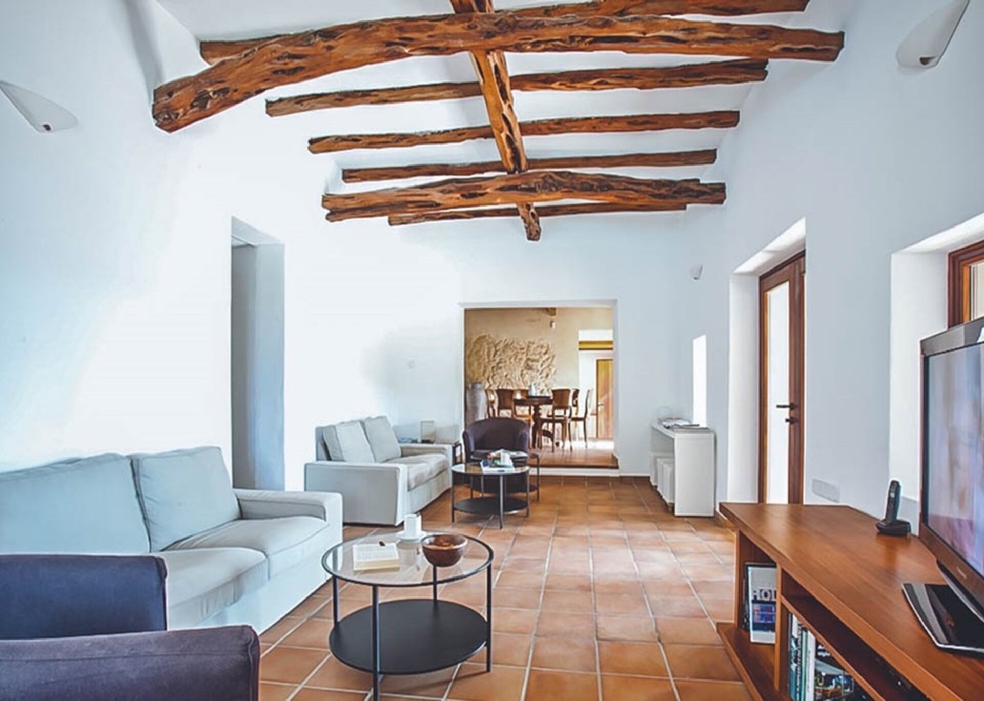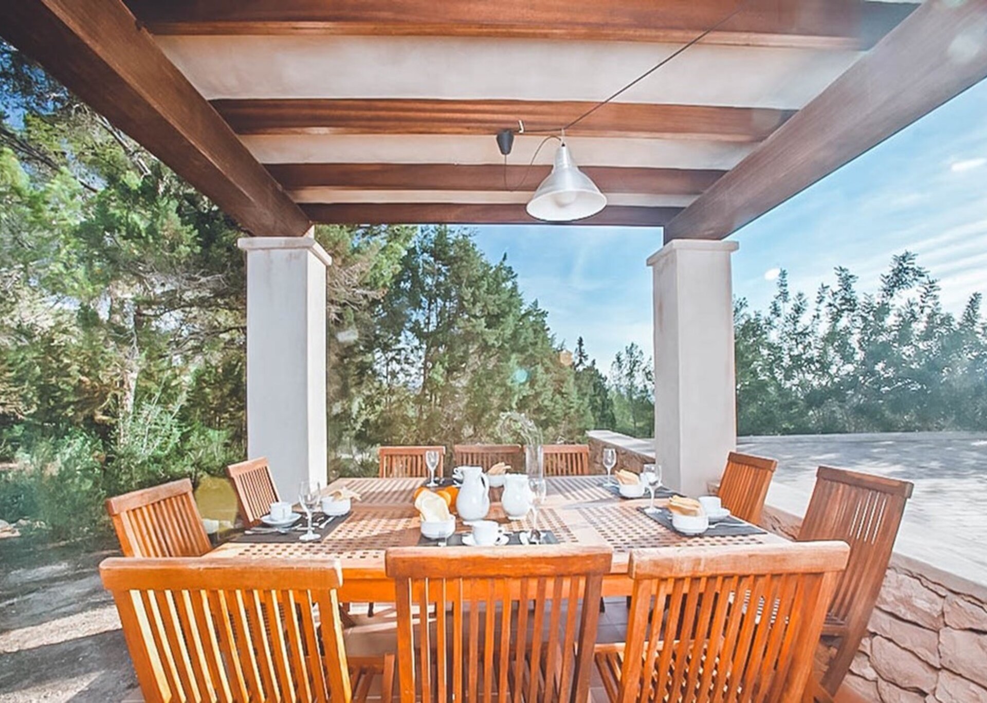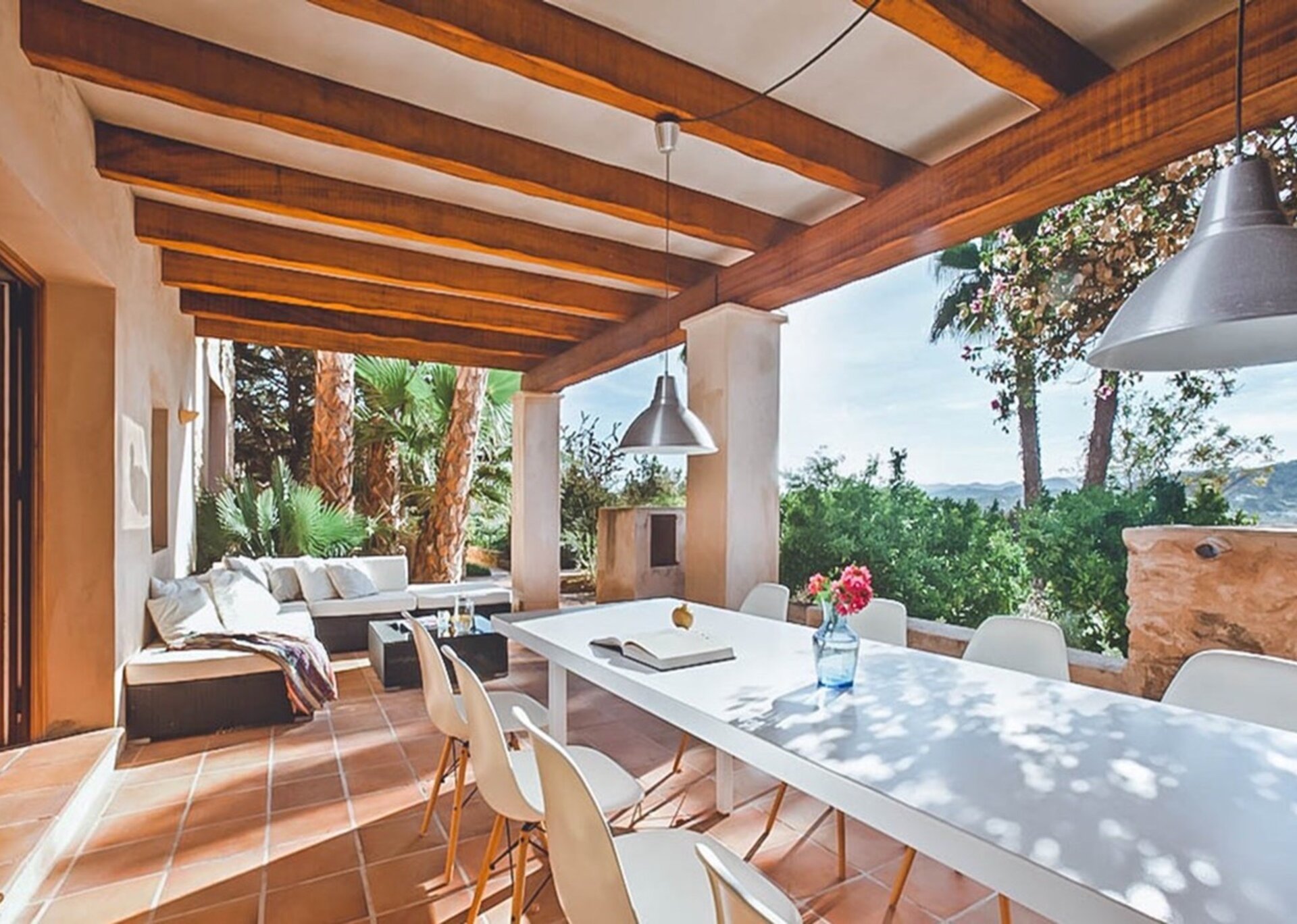 Delight in the comfort of the private L-shaped pool, surrounded by inviting terraces and luxurious wooden decking. An expansive terrace shaded by a traditional wooden-beamed roof beckons al-fresco dining, while picturesque gardens invite you to relax in exterior seating areas. A charming wooden pergola offers a second outside dining space. And let's not forget the mesmerizing spectacle of the world-famous Ibizan sunset painting the sky each night, making this truly desirable holiday home even more magical.