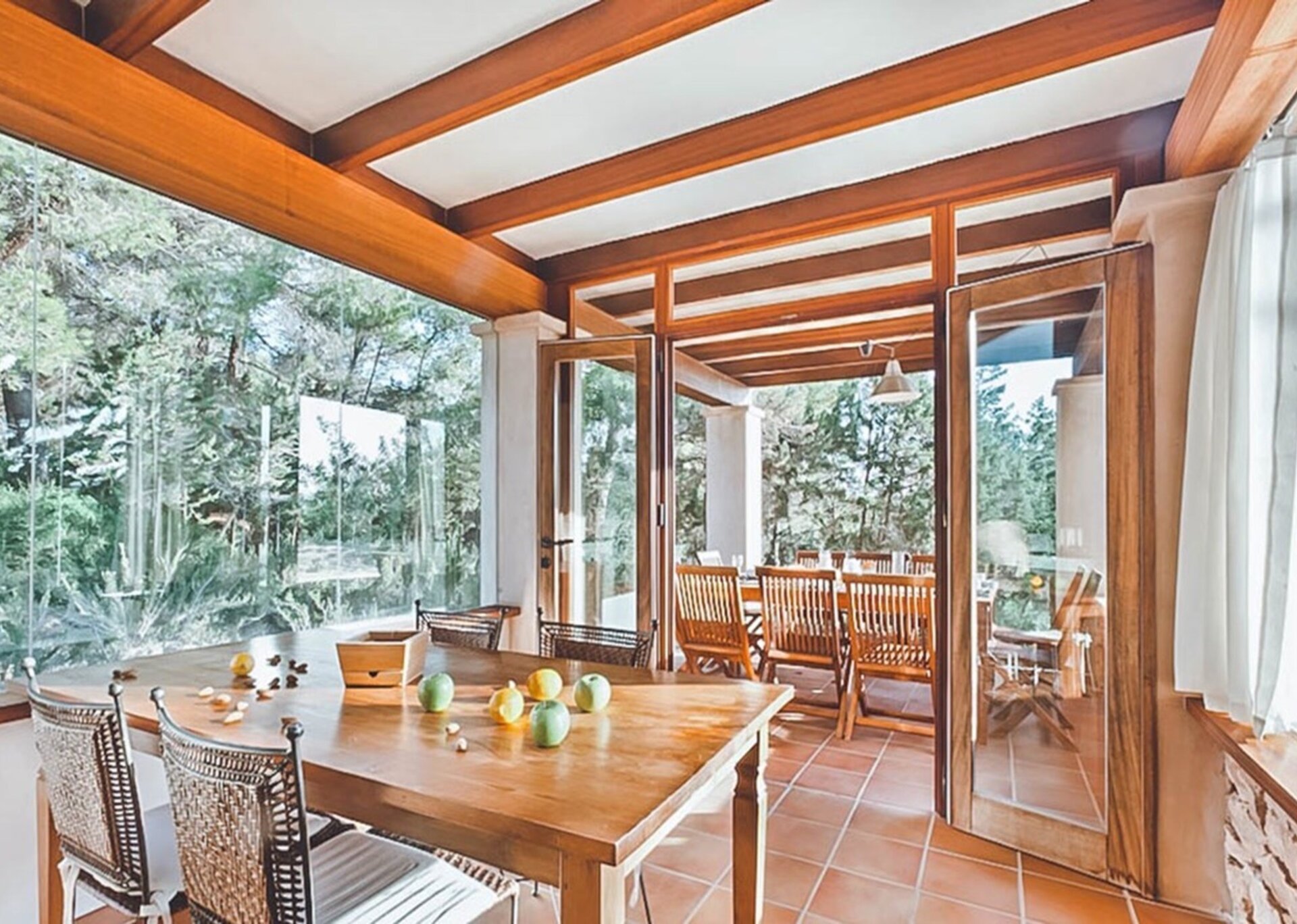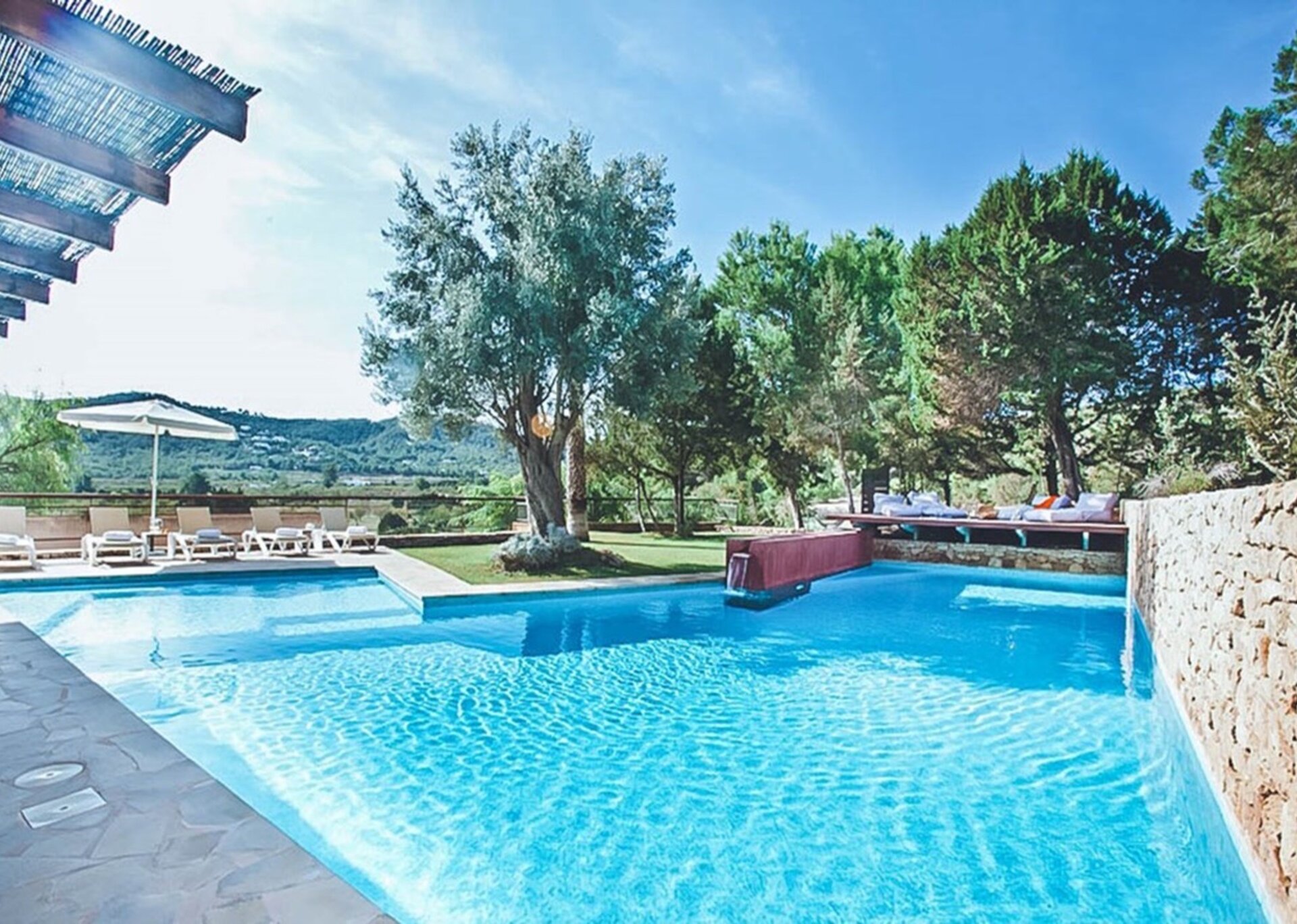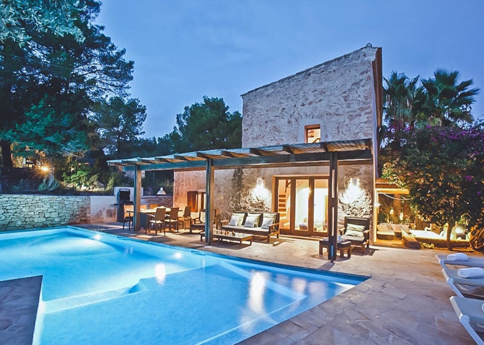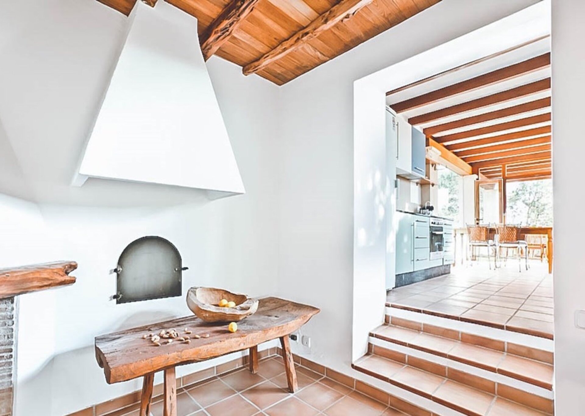 Delight in the comfort of the private L-shaped pool, surrounded by inviting terraces and luxurious wooden decking. An expansive terrace shaded by a traditional wooden-beamed roof beckons al-fresco dining, while picturesque gardens invite you to relax in exterior seating areas. A charming wooden pergola offers a second outside dining space. And let's not forget the mesmerizing spectacle of the world-famous Ibizan sunset painting the sky each night, making this truly desirable holiday home even more magical.