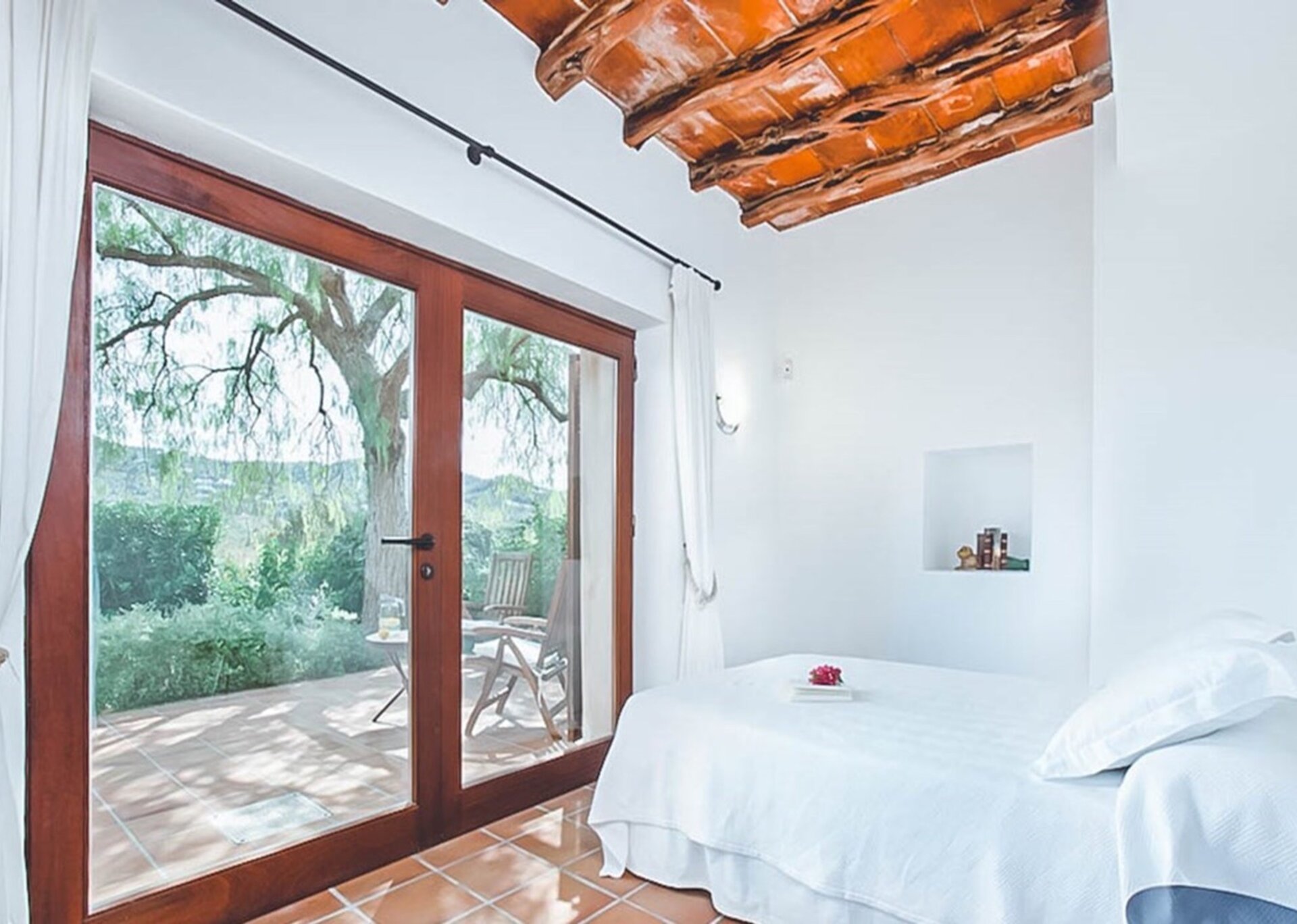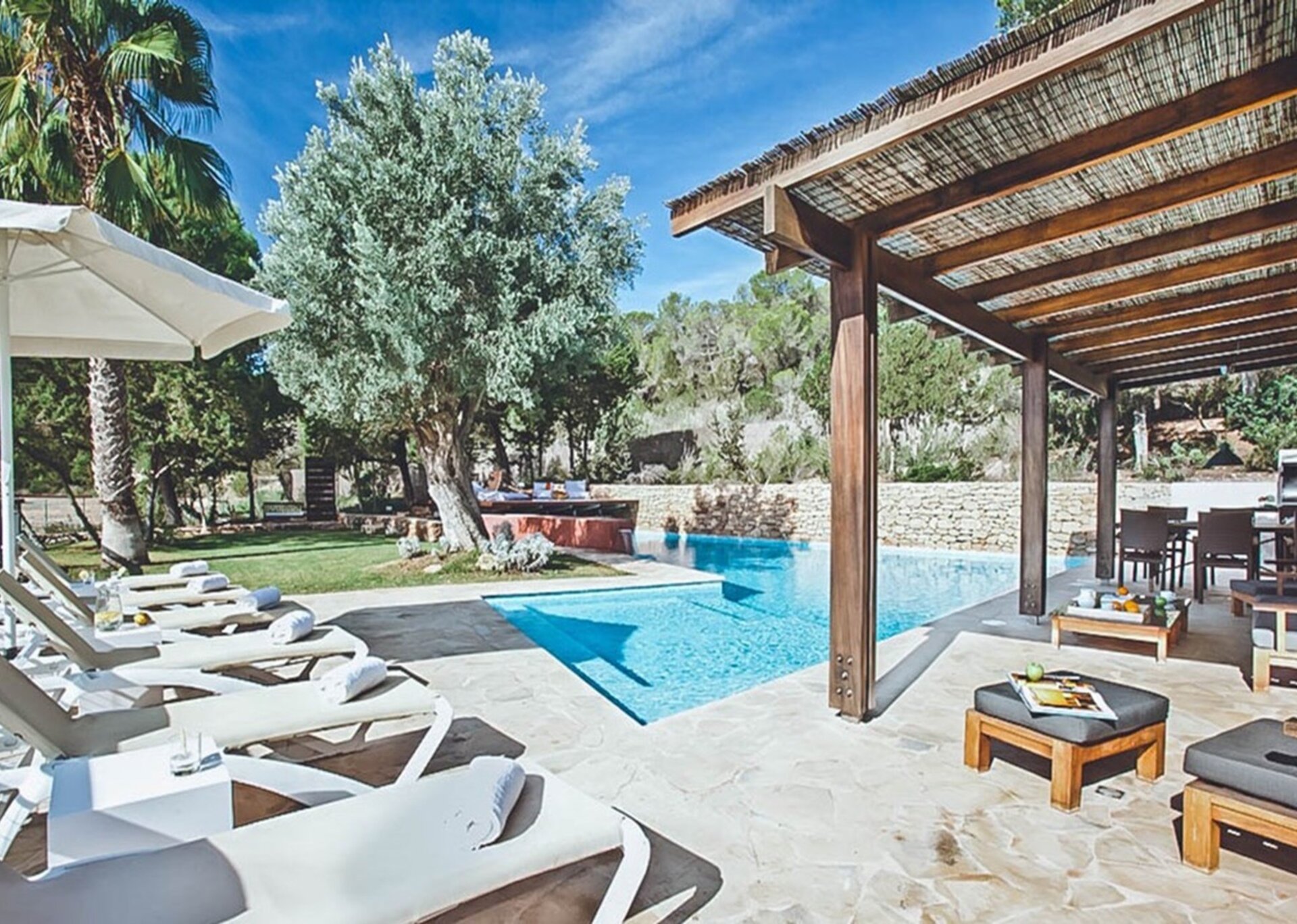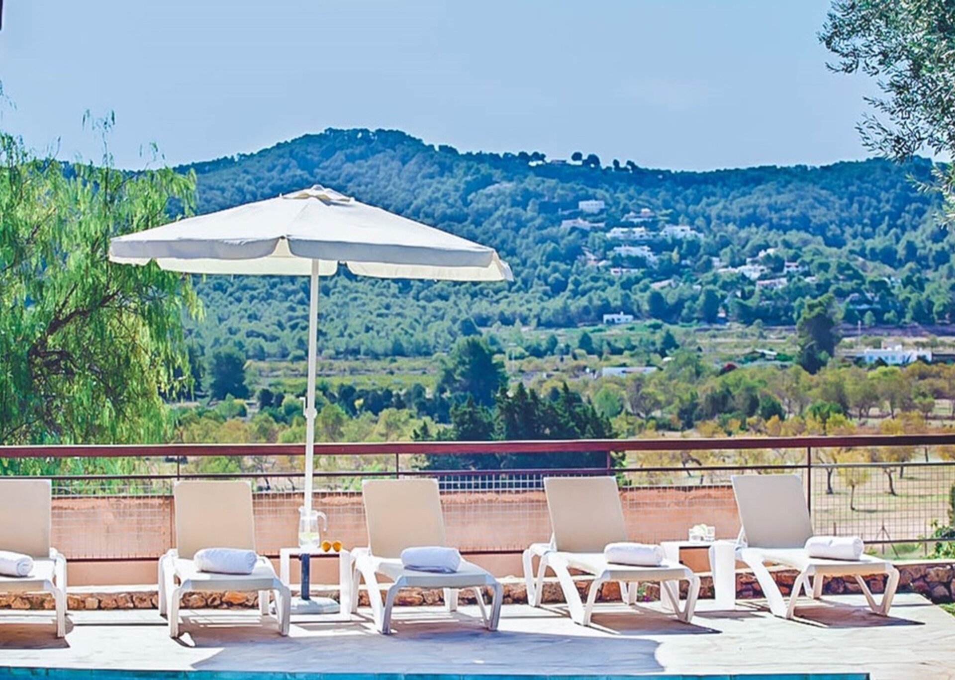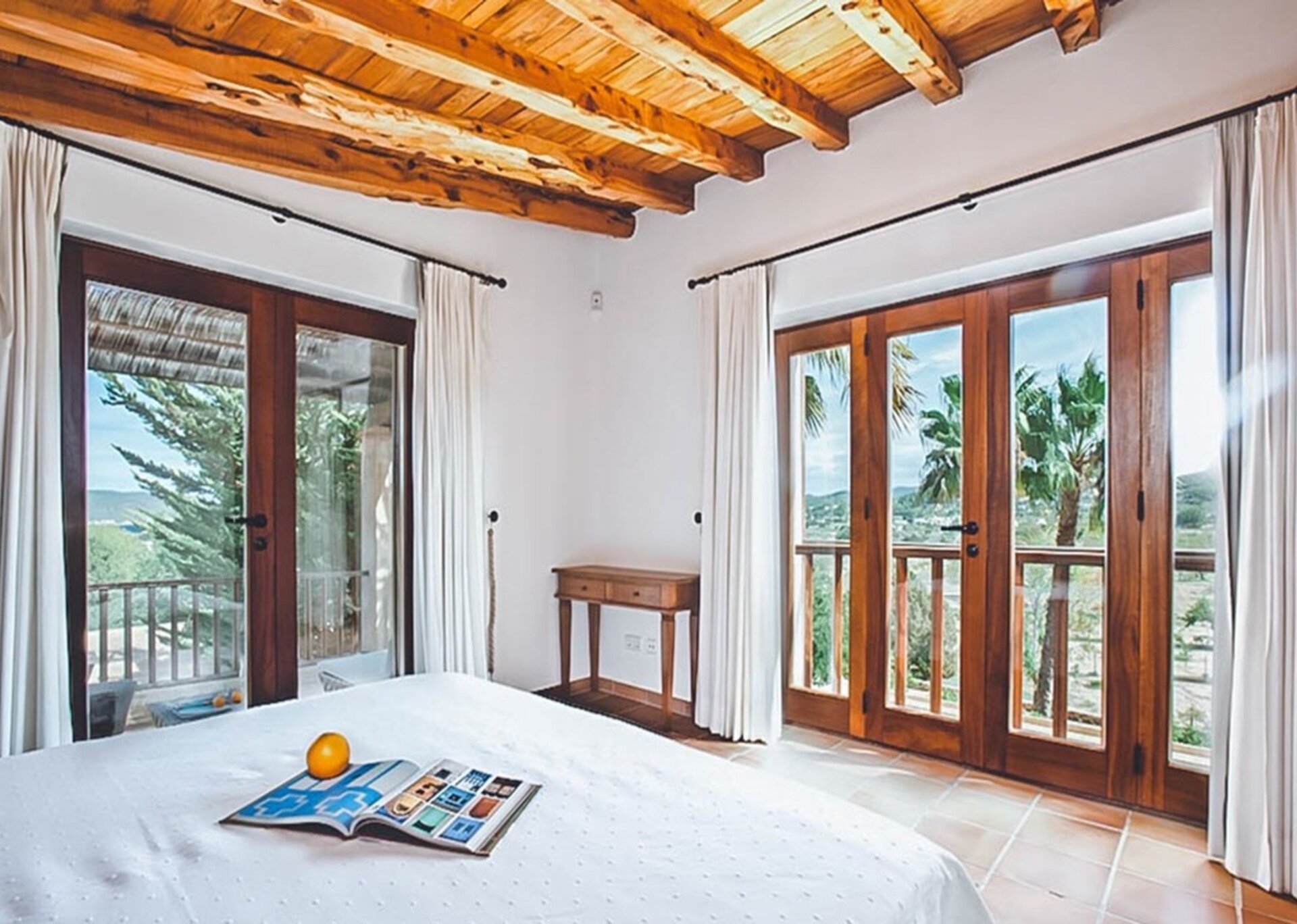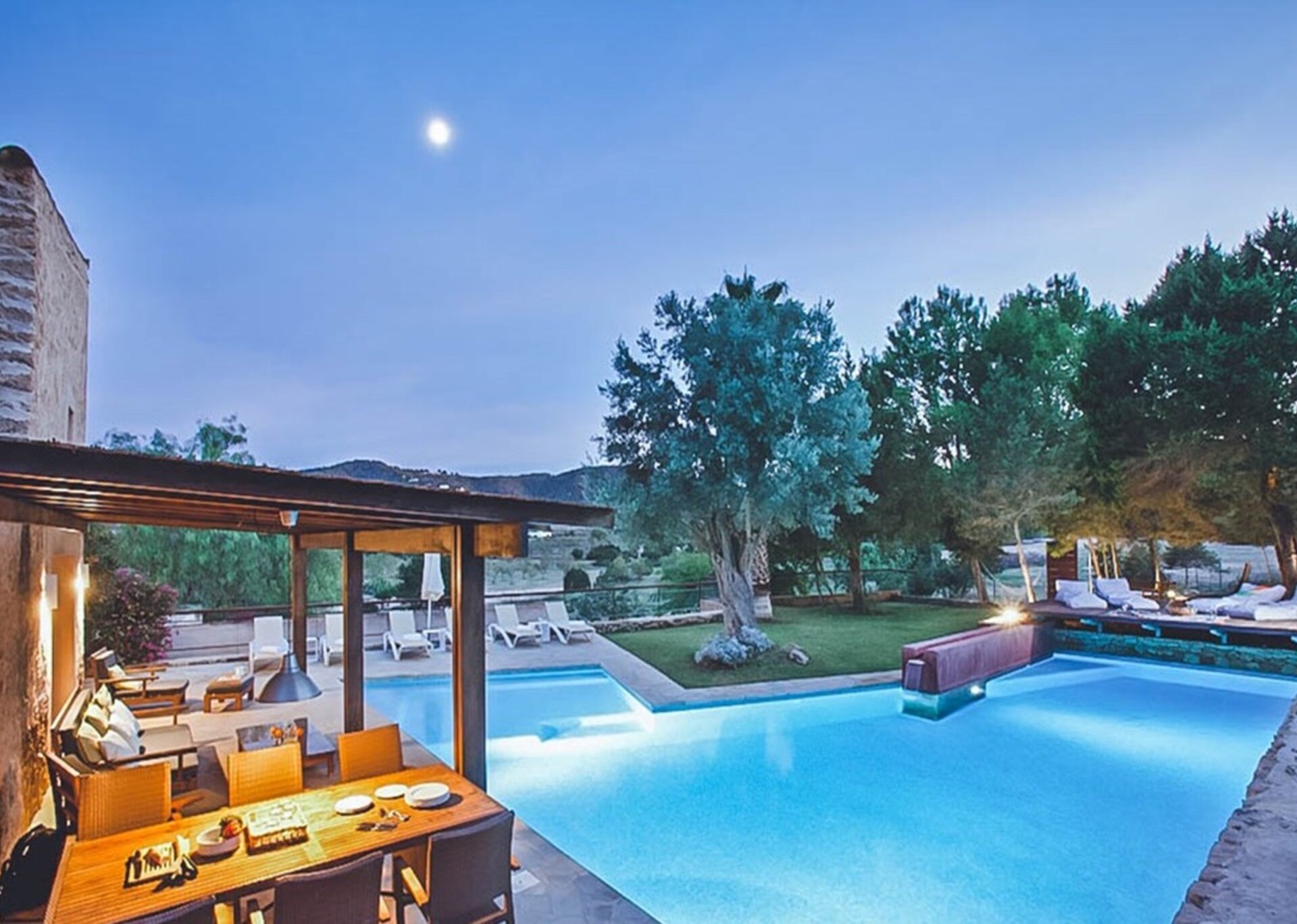 Delight in the comfort of the private L-shaped pool, surrounded by inviting terraces and luxurious wooden decking. An expansive terrace shaded by a traditional wooden-beamed roof beckons al-fresco dining, while picturesque gardens invite you to relax in exterior seating areas. A charming wooden pergola offers a second outside dining space. And let's not forget the mesmerizing spectacle of the world-famous Ibizan sunset painting the sky each night, making this truly desirable holiday home even more magical.